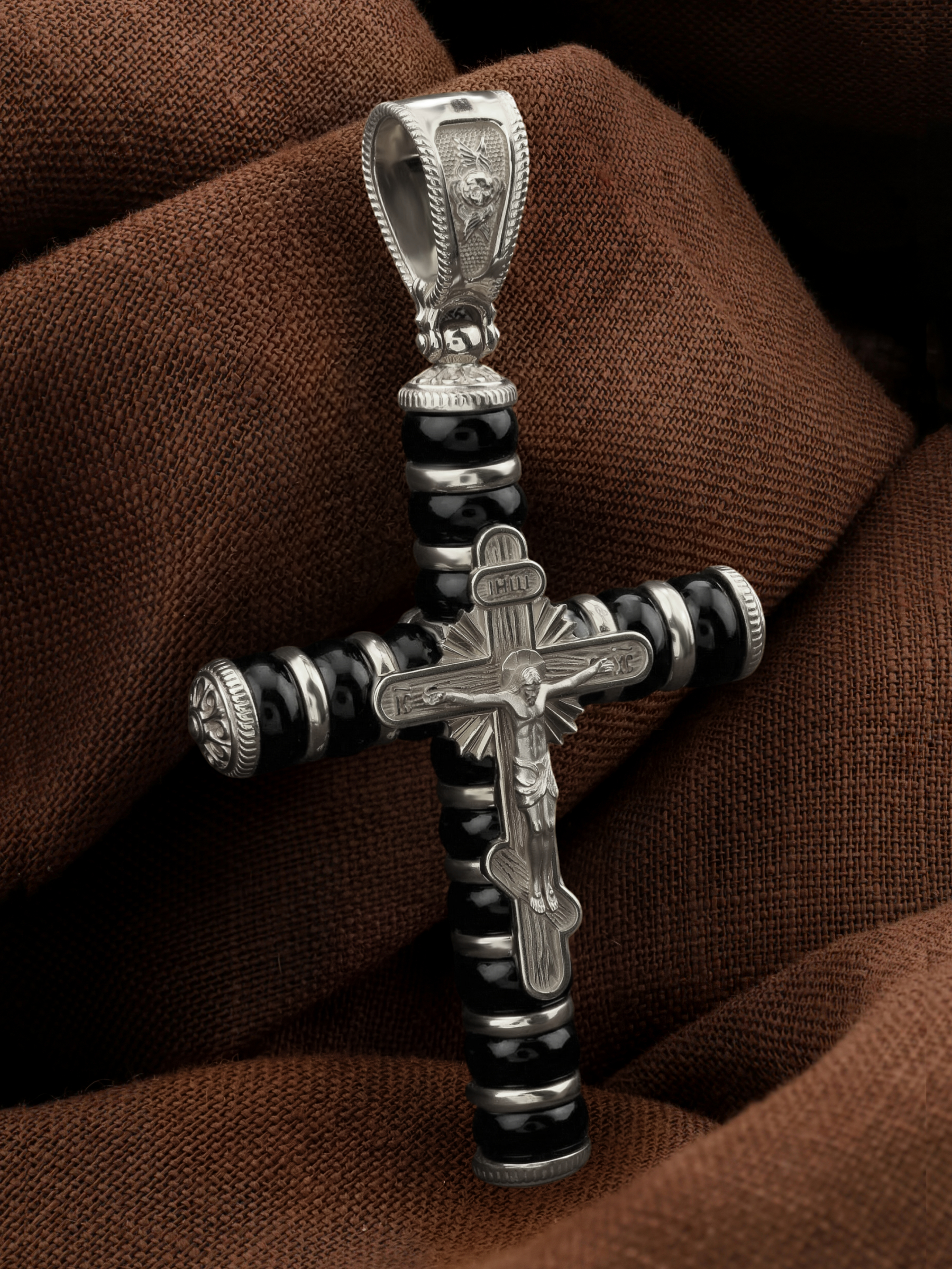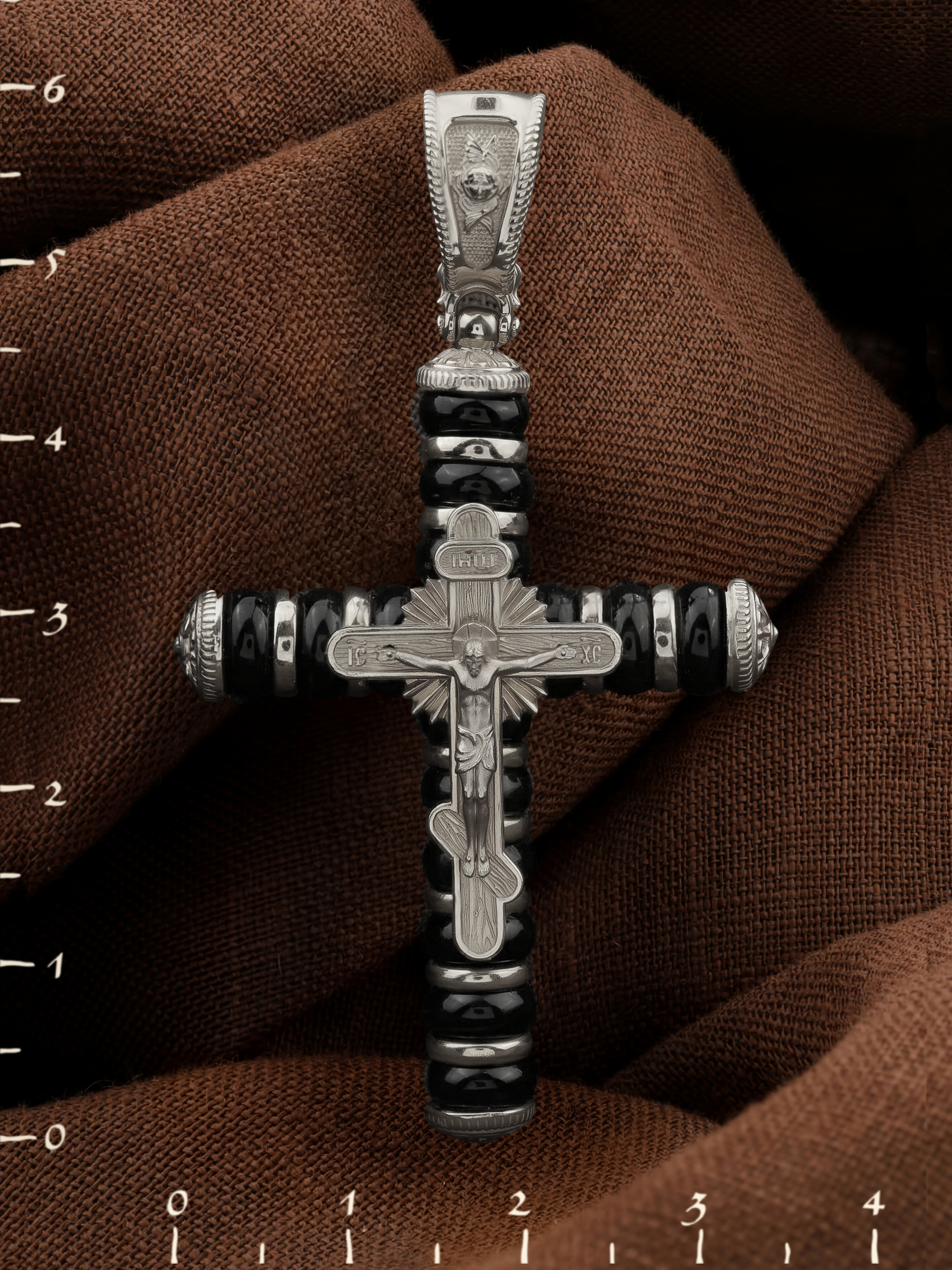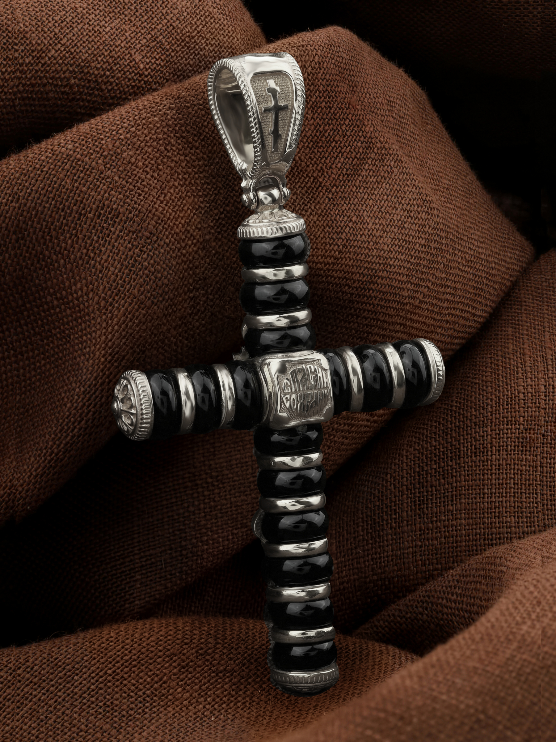 На лицевой стороне креста изображено Распятие Господа и Спасителя нашего Иисуса Христа. Своими крестными страданиями Господь смыл наши грехи, покрыл наш долг перед Богом или, на языке Писания, нас «искупил». В Голгофе сокрыта непостижимая тайна бесконечной правды и любви Бога. Крест стал символом победы добра над злом, жизни над смертью, напоминанием бесконечной Божьей любви, предметом радости. Воплотившийся Сын Божий Своею кровью освятил крест и сделал его проводником Своей благодати, источником освящения верующих. Господь сказал: кто хочет идти за Мною, отвергнись себя, и возьми крест свой, и следуй за Мною. (Мк. 8: 34). На верхней табличке, выше головы Иисуса, расположена надпись, составленная Понтием Пилатом — «IНЦI». Она означает «Иисус Назорей, Царь Иудейский». Надпись «IC» «ХC», означает Иисус Христос, помещается на разных сторонах поперечной перекладины креста. На православном кресте Христос не умирает, а свободно простирает руки, ладони Иисуса открыты, будто он хочет обнять все человечество, даря им свою любовь и открывая путь к вечной жизни. На кулонном кольце изображен шестикрылый Ангел Серафим.