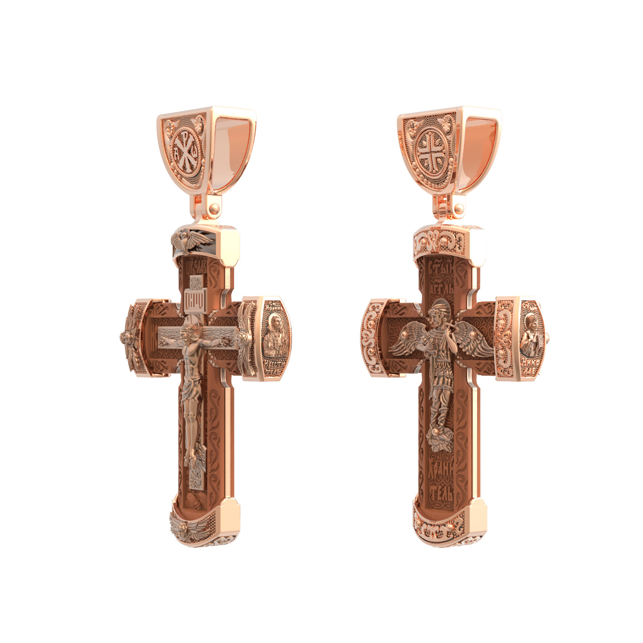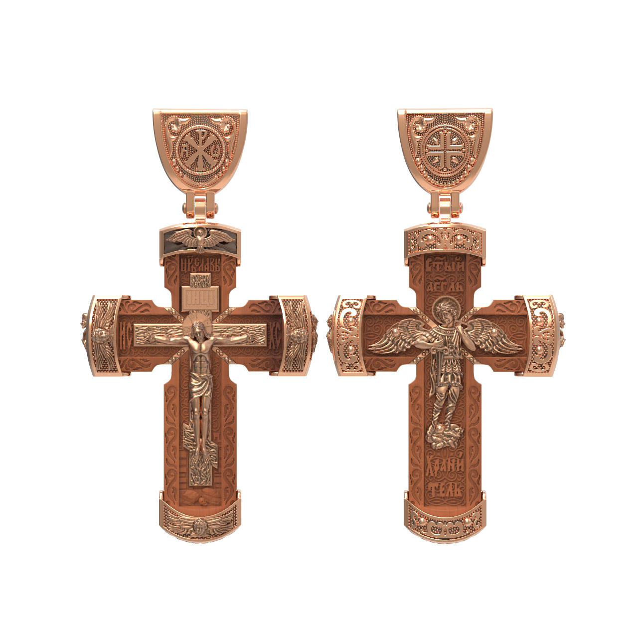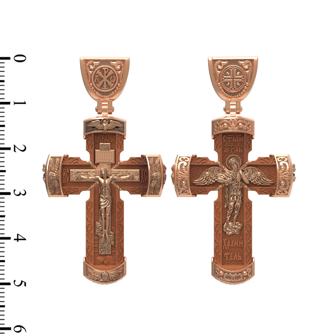 В центре оборота креста изображен Ангела Хранителя с традиционными атрибутами в руках: крестом, которым он осеняет человека, и мечом для прогнания бесов. По Православному учению, каждому, принявшему святое крещение, дается Господом Ангел Хранитель, который сопровождает человека всю его жизнь, помогая в добрых делах и охраняя от нападок злых духов. Святые отцы утверждают, что только верующий человек имеет рядом с собой Ангела Хранителя: «Тем, которые сподобились крещения и возносятся на высоту добродетелей, даны от Бога Ангелы, заботящиеся о них и содействующие им. В этом уверяет нас Господь, когда говорит, что есть Ангелы Хранители у всякого, кто верует в Него» (преп. Анастасий Синаит). Но Ангел Хранитель пребывает с христианином, если только мы не прогоним его греховными делами, поскольку «как дым разгоняет пчел, так и грех прогоняет от нас Ангела Хранителя» (свт. Василий Великий). Но и после завершения земного пути Ангел Хранитель не покидает христианина, а помогает душе преодолеть воздушные мытарства на пути в Царство Небесное.