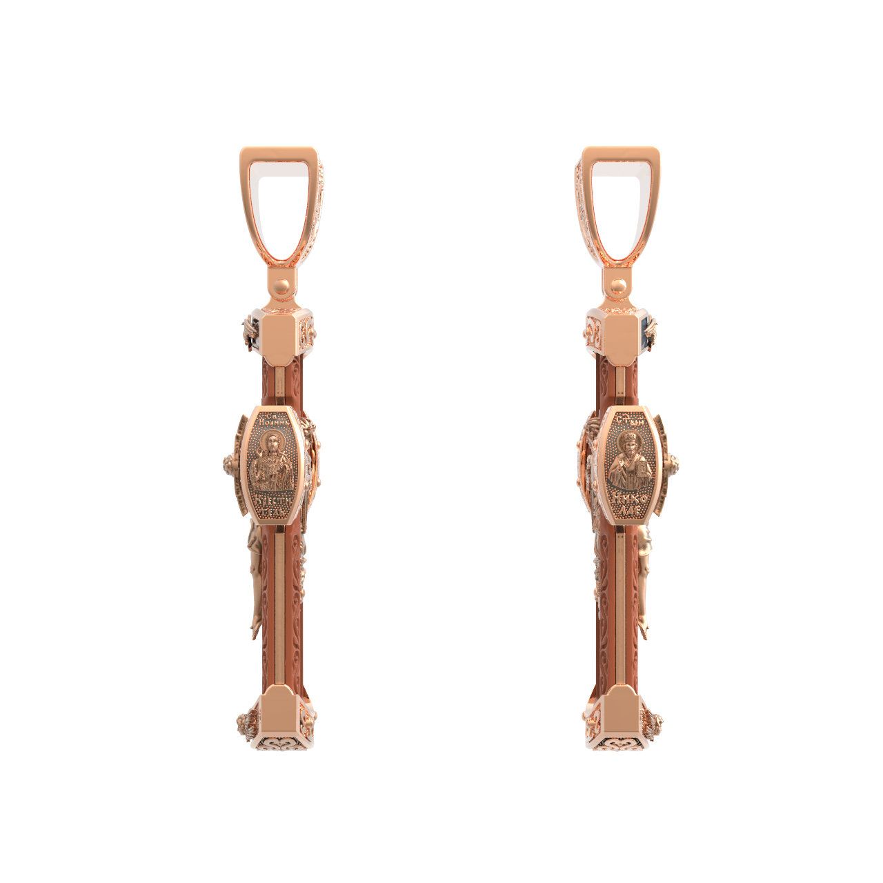На торце изделия с левой стороны помещена икона Святого Николая Чудотворца — самый почитаемый в Православной Церкви, которого еще называют Николай Угодник за то, что он угодил своей жизнью Богу. Николай Чудотворец, помощник в делах, покровитель учащихся, утешитель обиженных и нуждающихся, целитель самых страшных и тяжелых недугов, предстатель и молитвенник за людей перед Богом. Также Святитель Николай Чудотворец известен своими молитвами за путешественников, когда непрестанный ветер и бушующие волны утихают и корабль заходит в спокойную гавань. На торце изделия с правой стороны — икона Святого Иоанна Крестителя. Святой Иоанн был последним пророком Израиля. Он призывал к покаянию, предвозвещая приближение Царствия Небесного (Мф. 3, 2), и удостоился стать Крестителем Христа. Иисус Христос говорит о нем: «Сей есть о котором написано: «Вот, Я посылаю Ангела Моего пред лицем Твоим, который приготовит путь Твой пред Тобою» (Лк. 7, 27). И еще: «Из рожденных женами нет ни одного пророка больше Иоанна Крестителя» (Лк. 7, 28).
