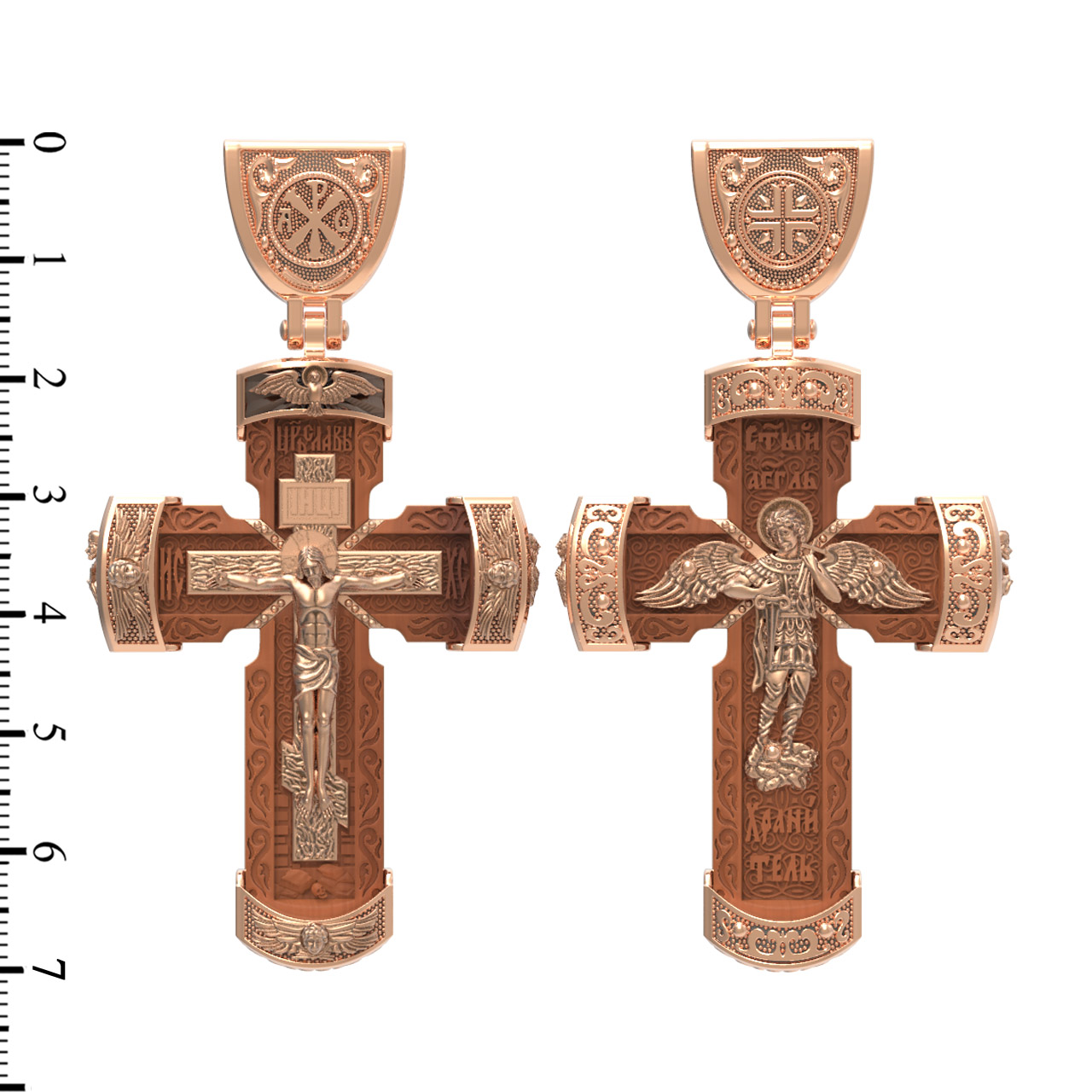 В центре оборота креста изображен Ангела Хранителя с традиционными атрибутами в руках: крестом, которым он осеняет человека, и мечом для прогнания бесов. По Православному учению, каждому, принявшему святое крещение, дается Господом Ангел Хранитель, который сопровождает человека всю его жизнь, помогая в добрых делах и охраняя от нападок злых духов. Святые отцы утверждают, что только верующий человек имеет рядом с собой Ангела Хранителя: «Тем, которые сподобились крещения и возносятся на высоту добродетелей, даны от Бога Ангелы, заботящиеся о них и содействующие им. В этом уверяет нас Господь, когда говорит, что есть Ангелы Хранители у всякого, кто верует в Него» (преп. Анастасий Синаит). Но Ангел Хранитель пребывает с христианином, если только мы не прогоним его греховными делами, поскольку «как дым разгоняет пчел, так и грех прогоняет от нас Ангела Хранителя» (свт. Василий Великий). Но и после завершения земного пути Ангел Хранитель не покидает христианина, а помогает душе преодолеть воздушные мытарства на пути в Царство Небесное.