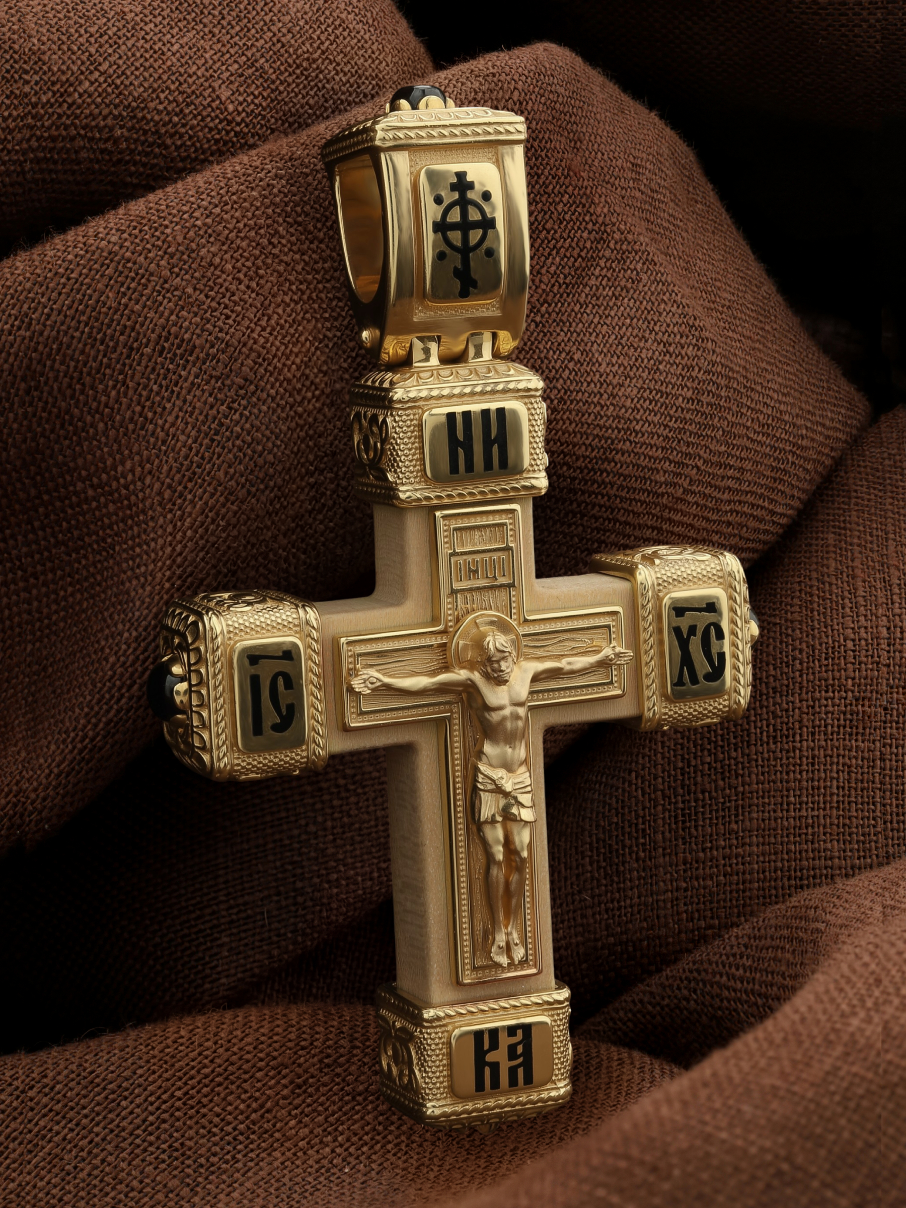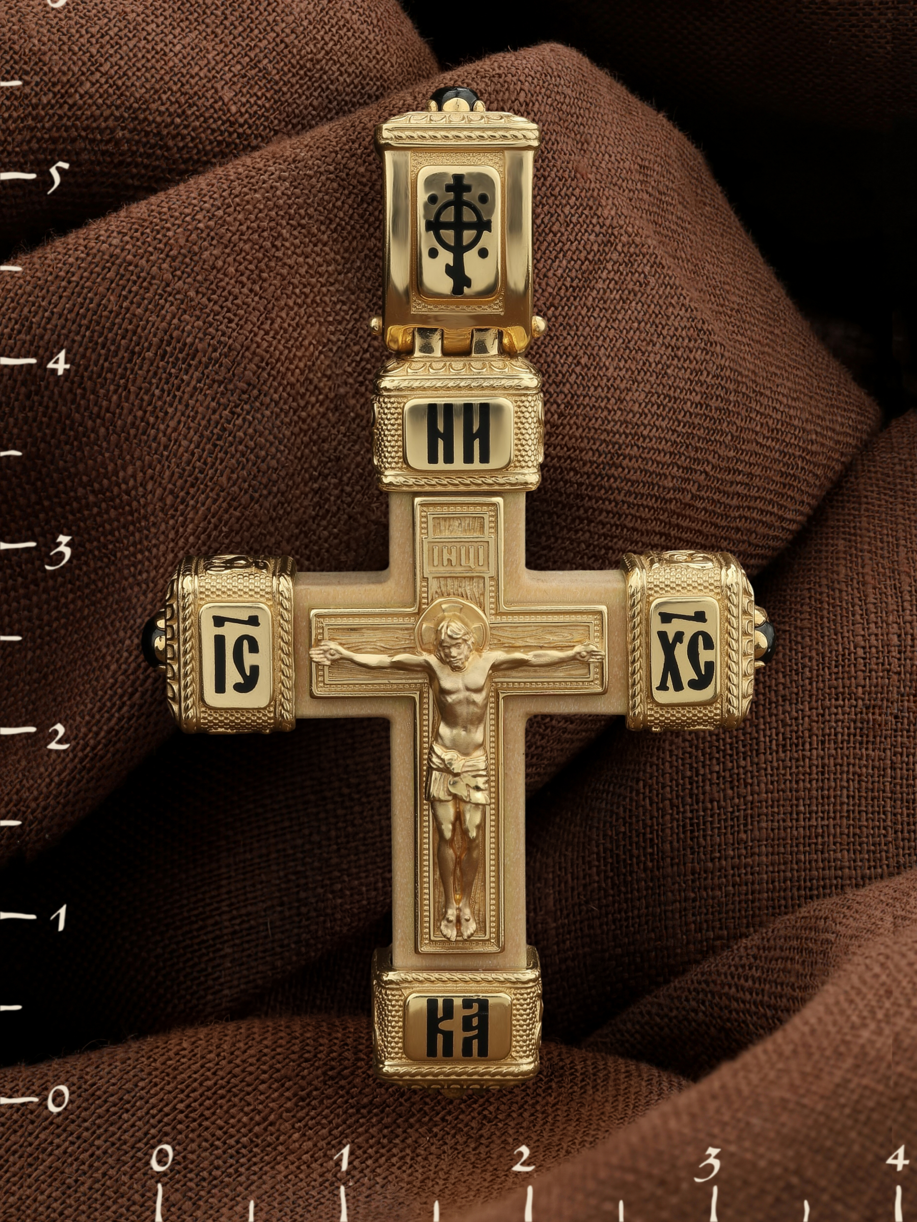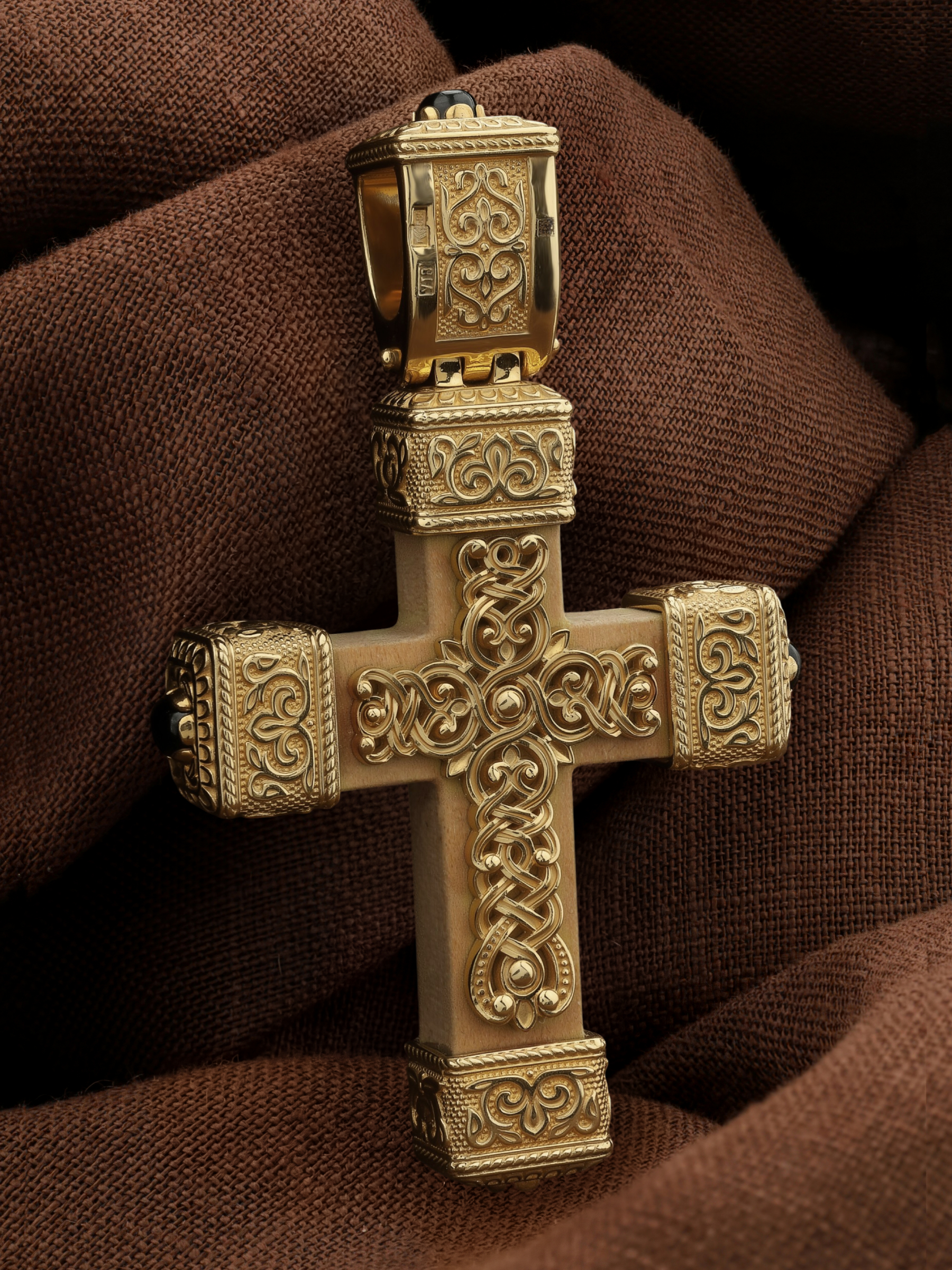 Крест из лимонного золота c эмалью, ониксом и деревом груши