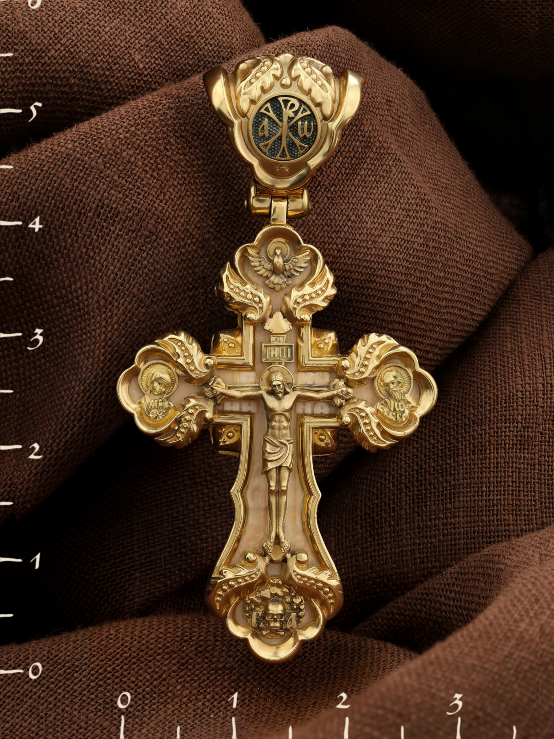 На лицевой стороне креста изображено Распятие Господа и Спасителя нашего Иисуса Христа. Крест- символ спасения и искупления рода человеческого, знамение победы над смертью и адом. Иисус Христос, как искупительная жертва освобождения человечества от власти греха, умер крестной смертью и в третий день воскрес. На верхней табличке, выше головы Иисуса, расположена надпись, составленная Понтием Пилатом — «ИНЦИ». Она означает «Иисус Назорей, Царь Иудейский». Над перекладиной написано сокращенно имя Спасителя «IC» «XC» — Иисус Христос. Ниже перекладины написано слово «НИКА» (греч. — Победитель). Крест стоит на горе камней, символизирующих Голгофу. В ее основании различается череп и надписи «Г.А.» — это голова Адама. Слева от Распятия помещен лик Пречистой Богородицы, скорой помощницы и заступницы рода Христианского. Слева изображен апостол и евангелист Иоанн Богослов, один из ближайших учеников Иисуса Христа. Над Распятием — изображение Духа Святого в виде голубя, сходящего с Небес. На кулонном кольце помещен крест.