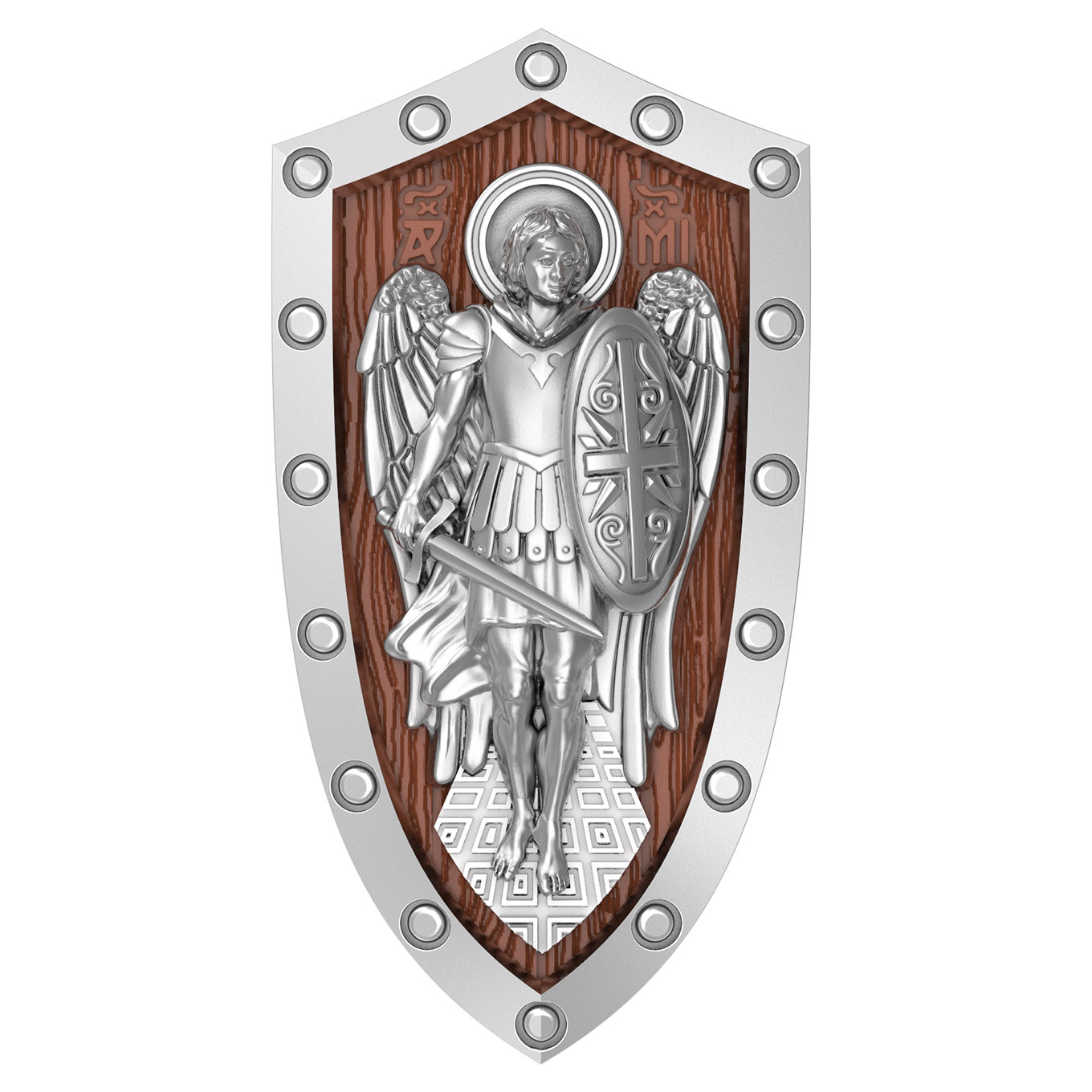 На лицевой стороне образка изображение Архангела Михаила — верного служителя Божия, который низринул с Неба возгордившегося денницу с другими павшими духами. В Православии его называют Архистратигом, что означает глава святого воинства Ангелов и Архангелов. Образок сделан в виде воинского щита. Архангел Михаил изображен в воинственном виде с огненным мечом в правой руке и щитом в левой. Архангел почитается как покровитель воинов и всех верных Богу и ведущих борьбу против сил зла, борец против ересей, а также защитник душ умерших, страж райских врат. С древних времен прославлен своими чудесами Архангел Михаил на Руси. Примеров явления и помощи Архистратига Михаила в русской истории бессчетно. Архангел Михаил не перестает ратоборствовать за славу Творца и Господа всяческих, за дело спасения рода человеческого, за церковь и чад ее. И, согласно, Откровению Иоанна Богослова во время последней битвы небесных и дьявольских сил Михаил и его ангелы опять низвергнут Люцифера вместе с его войском: «Михаил и Ангелы его воевали против дракона, и дракон и ангелы его воевали [против них], но не устояли, и не нашлось уже для них места на небе. И низвержен был великий дракон, древний змий, называемый диаволом и сатаною, обольщающий всю вселенную, низвержен на землю, и ангелы его низвержены с ним» (Откр.12:7−9).