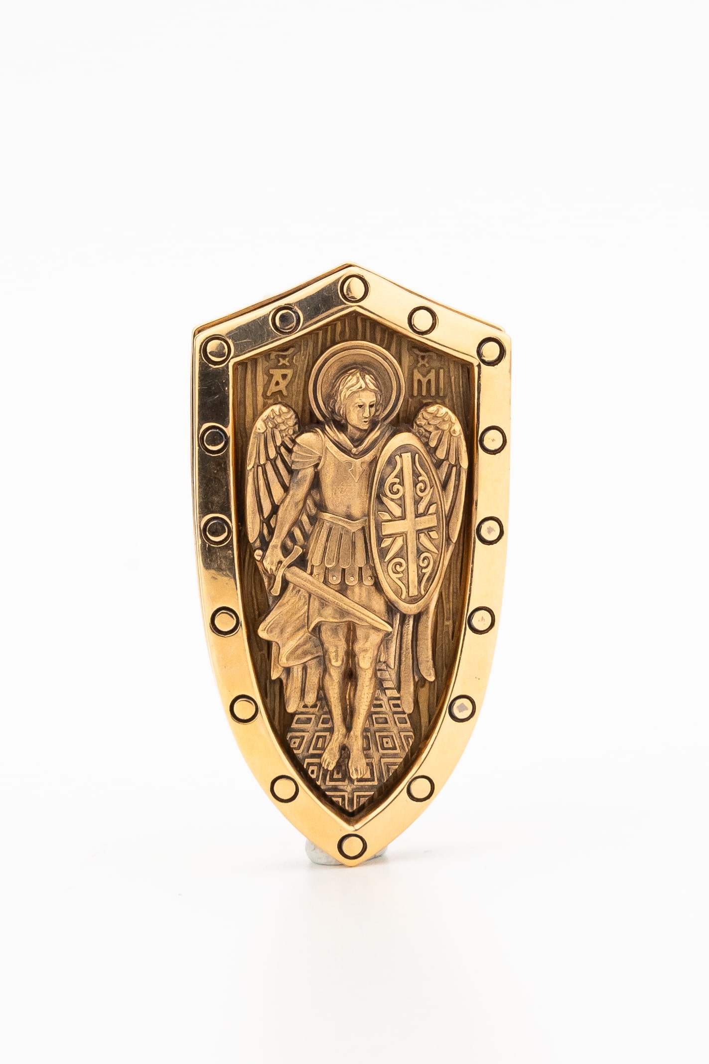 На лицевой стороне образка изображение Архангела Михаила — верного служителя Божия, который низринул с Неба возгордившегося денницу с другими павшими духами. В Православии его называют Архистратигом, что означает глава святого воинства Ангелов и Архангелов. Образок сделан в виде воинского щита. Архангел Михаил изображен в воинственном виде с огненным мечом в правой руке и щитом в левой. Архангел почитается как покровитель воинов и всех верных Богу и ведущих борьбу против сил зла, борец против ересей, а также защитник душ умерших, страж райских врат. С древних времен прославлен своими чудесами Архангел Михаил на Руси. Примеров явления и помощи Архистратига Михаила в русской истории бессчетно. Архангел Михаил не перестает ратоборствовать за славу Творца и Господа всяческих, за дело спасения рода человеческого, за церковь и чад ее. И, согласно, Откровению Иоанна Богослова во время последней битвы небесных и дьявольских сил Михаил и его ангелы опять низвергнут Люцифера вместе с его войском: «Михаил и Ангелы его воевали против дракона, и дракон и ангелы его воевали [против них], но не устояли, и не нашлось уже для них места на небе. И низвержен был великий дракон, древний змий, называемый диаволом и сатаною, обольщающий всю вселенную, низвержен на землю, и ангелы его низвержены с ним» (Откр.12:7−9).