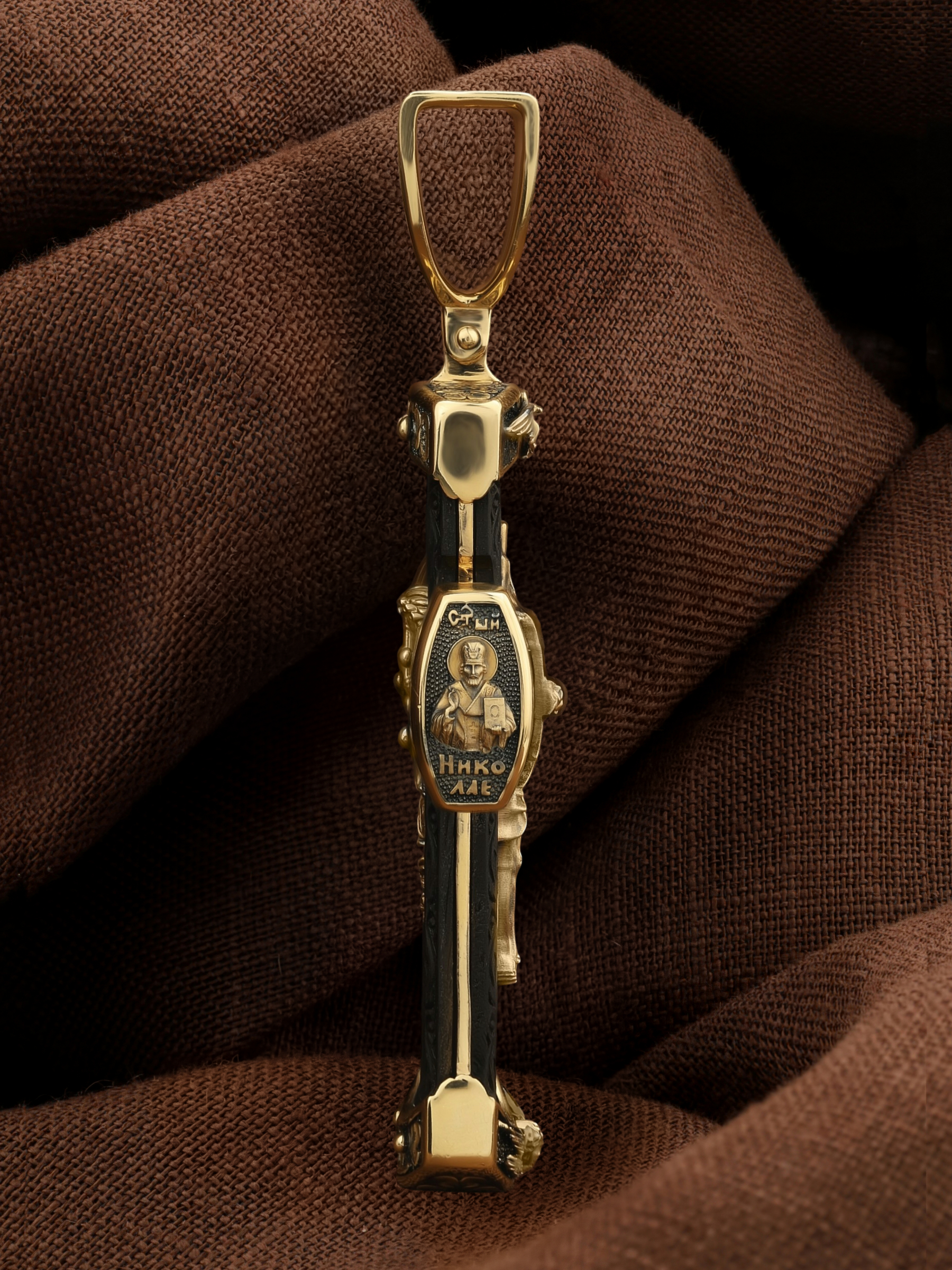 На торце изделия с левой стороны помещена икона Святого Николая Чудотворца — самый почитаемый в Православной Церкви, которого еще называют Николай Угодник за то, что он угодил своей жизнью Богу. Николай Чудотворец, помощник в делах, покровитель учащихся, утешитель обиженных и нуждающихся, целитель самых страшных и тяжелых недугов, предстатель и молитвенник за людей перед Богом. Также Святитель Николай Чудотворец известен своими молитвами за путешественников, когда непрестанный ветер и бушующие волны утихают и корабль заходит в спокойную гавань. На торце изделия с правой стороны — икона Святого Иоанна Крестителя. Святой Иоанн был последним пророком Израиля. Он призывал к покаянию, предвозвещая приближение Царствия Небесного (Мф. 3, 2), и удостоился стать Крестителем Христа. Иисус Христос говорит о нем: «Сей есть о котором написано: «Вот, Я посылаю Ангела Моего пред лицем Твоим, который приготовит путь Твой пред Тобою» (Лк. 7, 27). И еще: «Из рожденных женами нет ни одного пророка больше Иоанна Крестителя» (Лк. 7, 28).