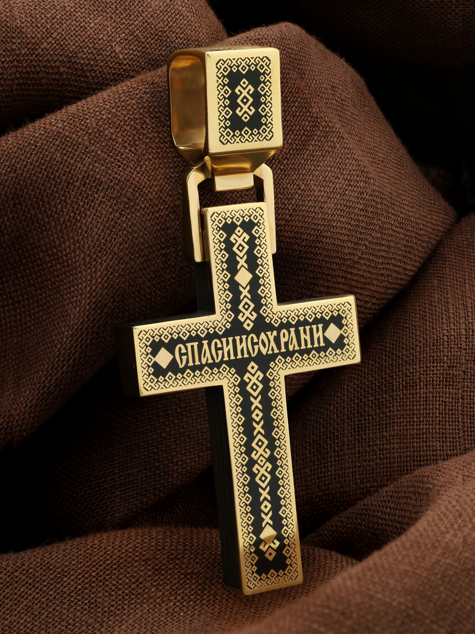 На лицевой стороне креста изображено Распятие Господа и Спасителя нашего Иисуса Христа. В Голгофе сокрыта непостижимая тайна бесконечной правды и любви Бога. Крест стал символом победы добра над злом, жизни над смертью, напоминанием бесконечной Божьей любви, предметом радости. Воплотившийся Сын Божий Своею кровью освятил крест и сделал его проводником Своей благодати, источником освящения верующих. На верхней табличке, выше головы Иисуса, расположена надпись, составленная Понтием Пилатом — «IНЦI». Она означает «Иисус Назорей, Царь Иудейский». Надпись «IС ХС» означает Иисус Христос размещается на разных сторонах поперечной перекладины креста. В нижней части креста находится надпись «НИКА», что в переводе с греческого означает «победитель». На православном кресте Христос не умирает, а свободно простирает руки, ладони Иисуса открыты, будто он хочет обнять все человечество, даря им свою любовь и открывая путь к вечной жизни. На кулонном кольце размещено изображение Спаса Нерукотворного — образ Спасителя, который Он запечатлел на плате и передал для исцеления больному проказой царю Эдессы. Ему придается победное и защитное значение.