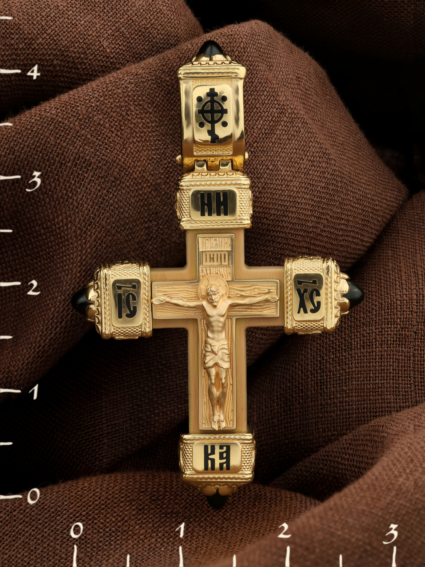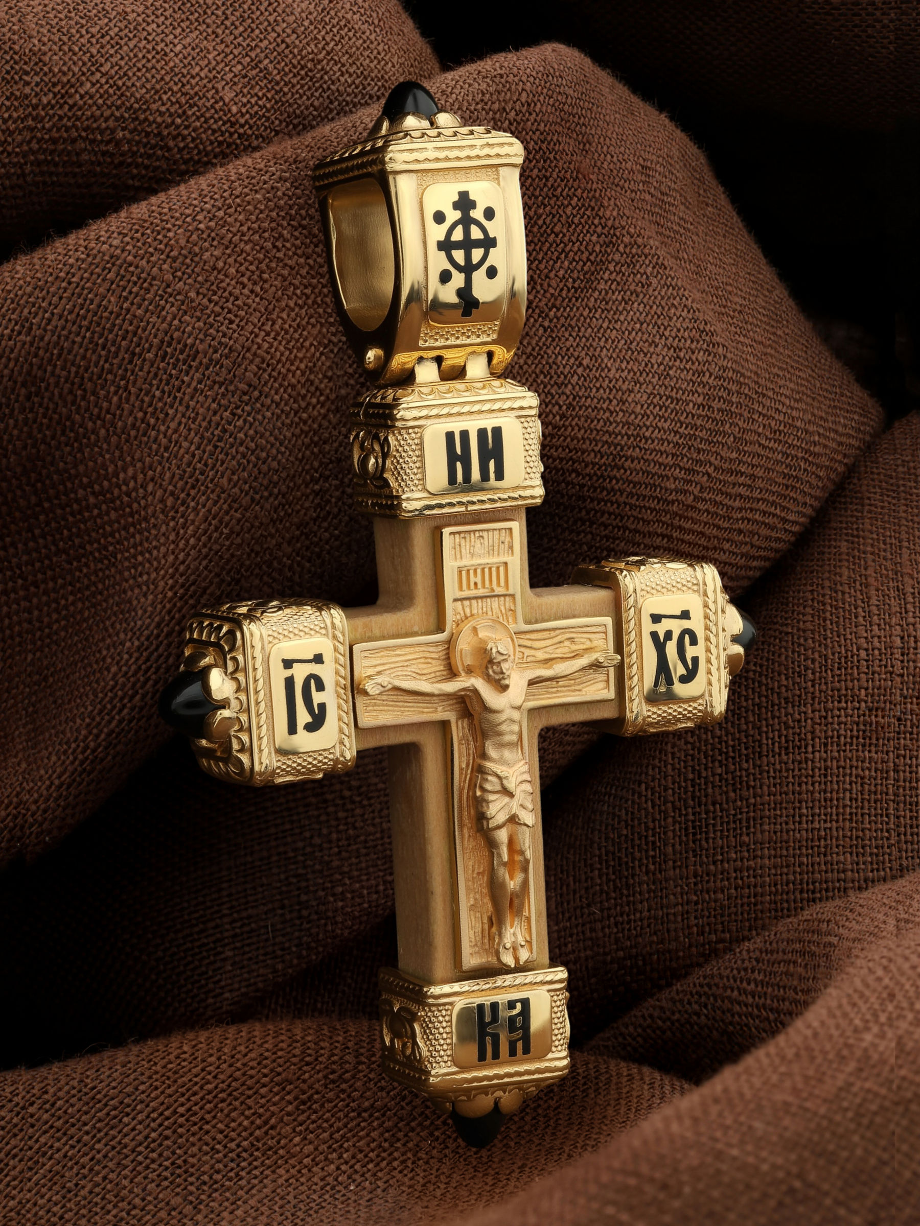 Крест из лимонного золота c эмалью, ониксом и деревом груши
