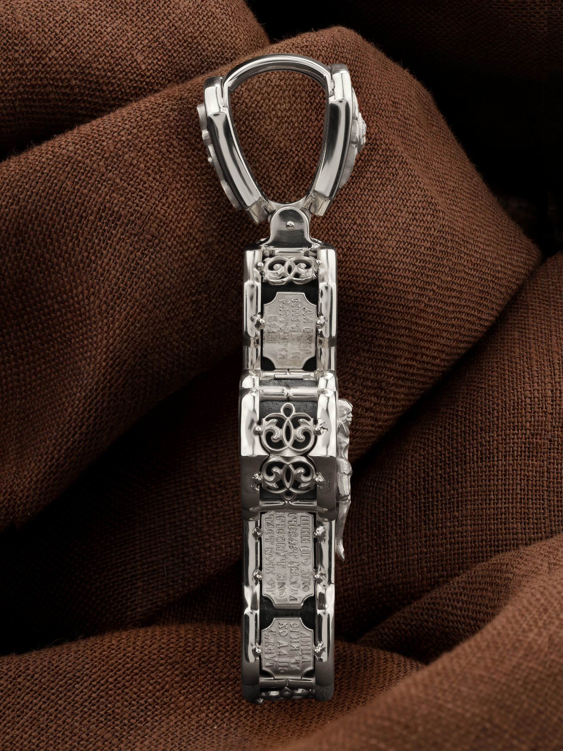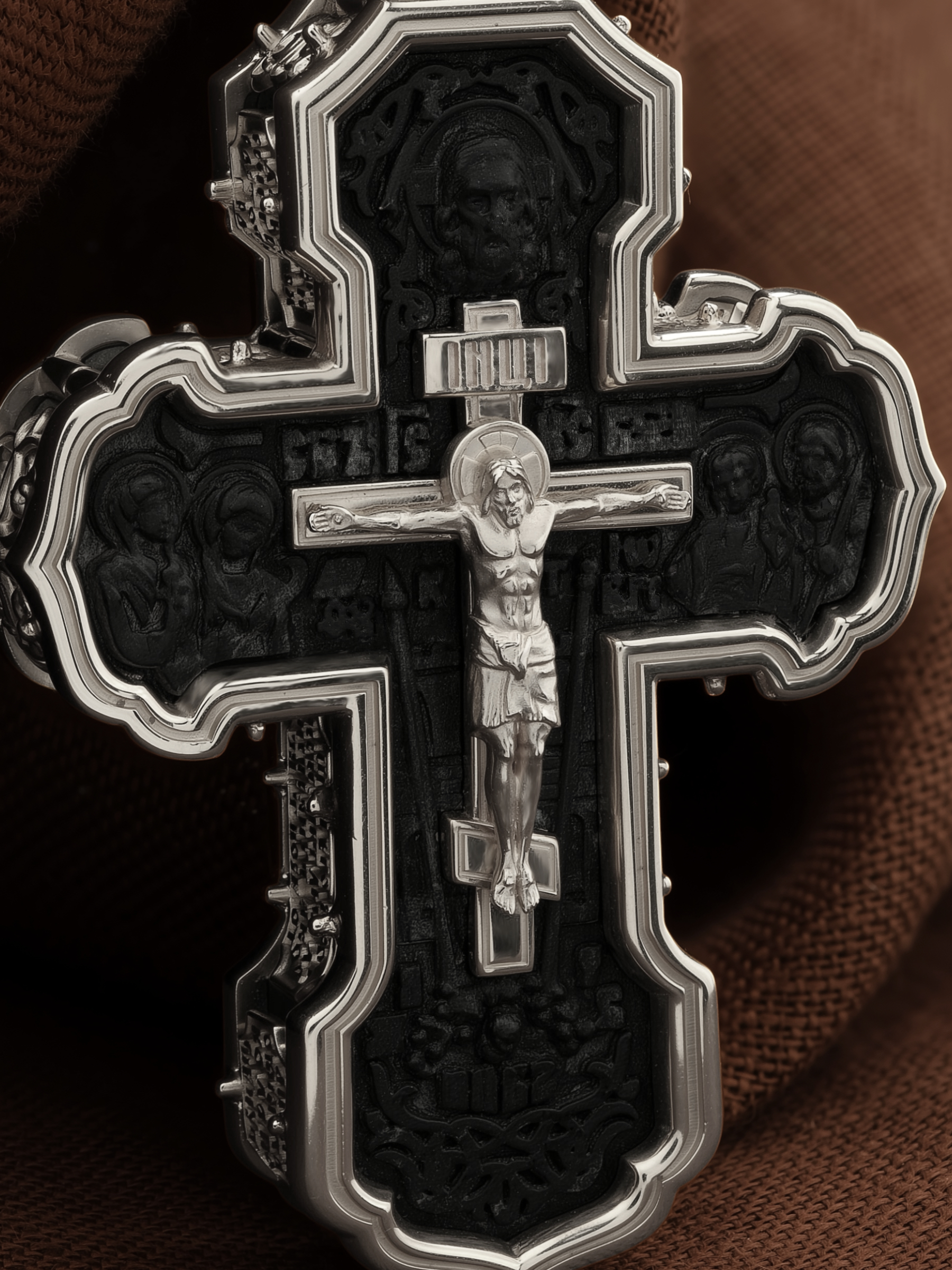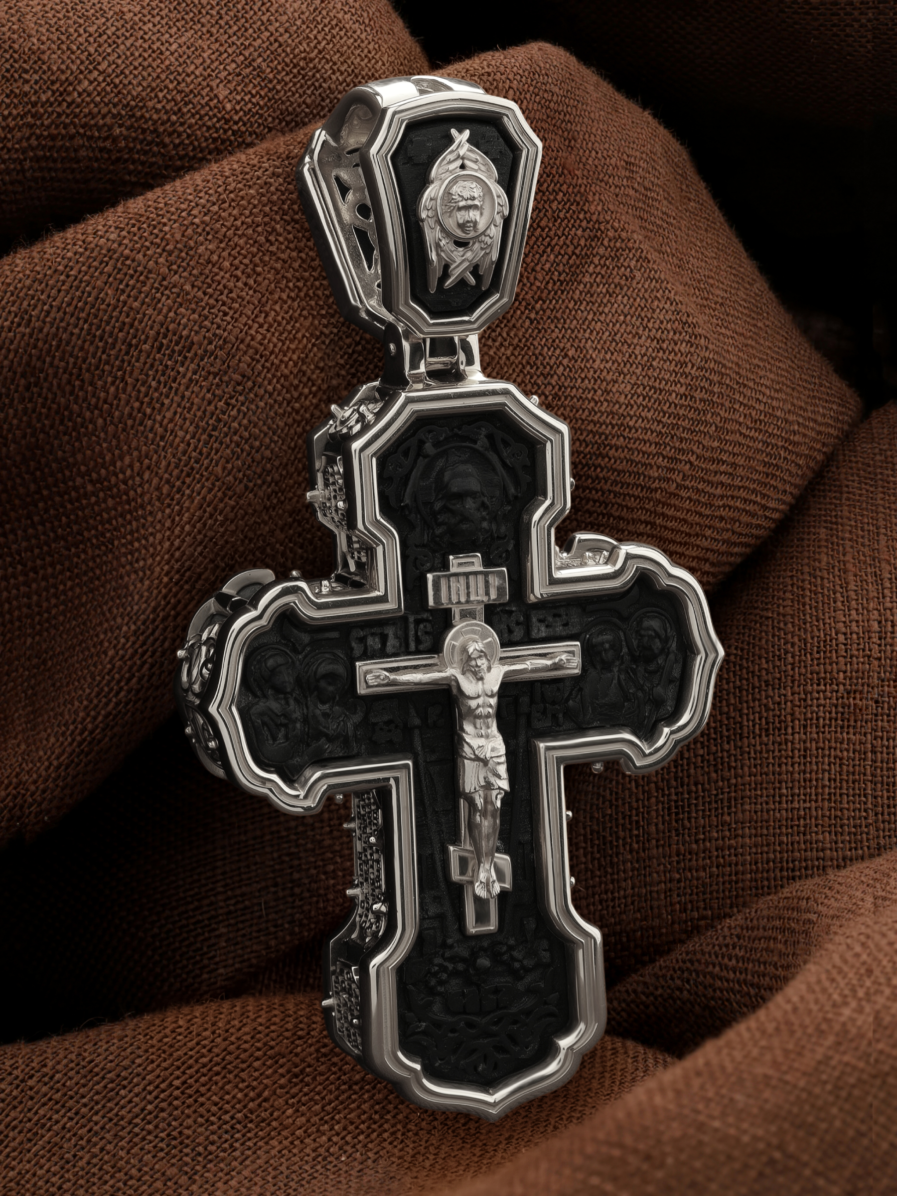 На лицевой стороне креста изображено Распятие Господа и Спасителя нашего Иисуса Христа. Крест- символ спасения и искупления рода человеческого, знамение победы над смертью и адом. Иисус Христос, как искупительная жертва освобождения человечества от власти греха, умер крестной смертью и в третий день воскрес. На верхней табличке, выше головы Иисуса, расположена надпись, составленная Понтием Пилатом — «IНЦI». Она означает «Иисус Назорей, Царь Иудейский». Надпись «IС» « ХС» означает Иисус Христос и помещается на разных сторонах поперечной (большой) перекладины креста. Рядом расположена надпись «Сын Божий». Выше Распятия изображен Нерукотворный образ Господа и Спасителя нашего Иисуса Христа. Слева от Распятия — Пресвятая Богородица и святая мироносица Мария Магдалина с крестом в руке. Справа — апостол и евангелист Иоанн Богослов, один из ближайших учеников Иисуса Христа и сотник Лонгин с крестом в правой руке и копьем — в левой. За крестом высится Иерусалимская стена. Крест стоит на горе камней, символизирующих Голгофу. В ее основании различается череп — это голова Адама. Вдоль креста изображены копие сотника Лонгина и трость с губкой и буквы «К» и «Т». Надпись «МЛРБ» — «место лобное рай бысть» означает, что место лобное стало раем и помещаются в нижней части креста. Рядом — слово «НИКА», что означает «победитель». На православном кресте Христос не умирает, а свободно простирает руки, ладони Иисуса открыты, будто он хочет обнять все человечество, даря им свою любовь и открывая путь к вечной жизни. На кулонном кольце изображен шестикрылый Серафим.