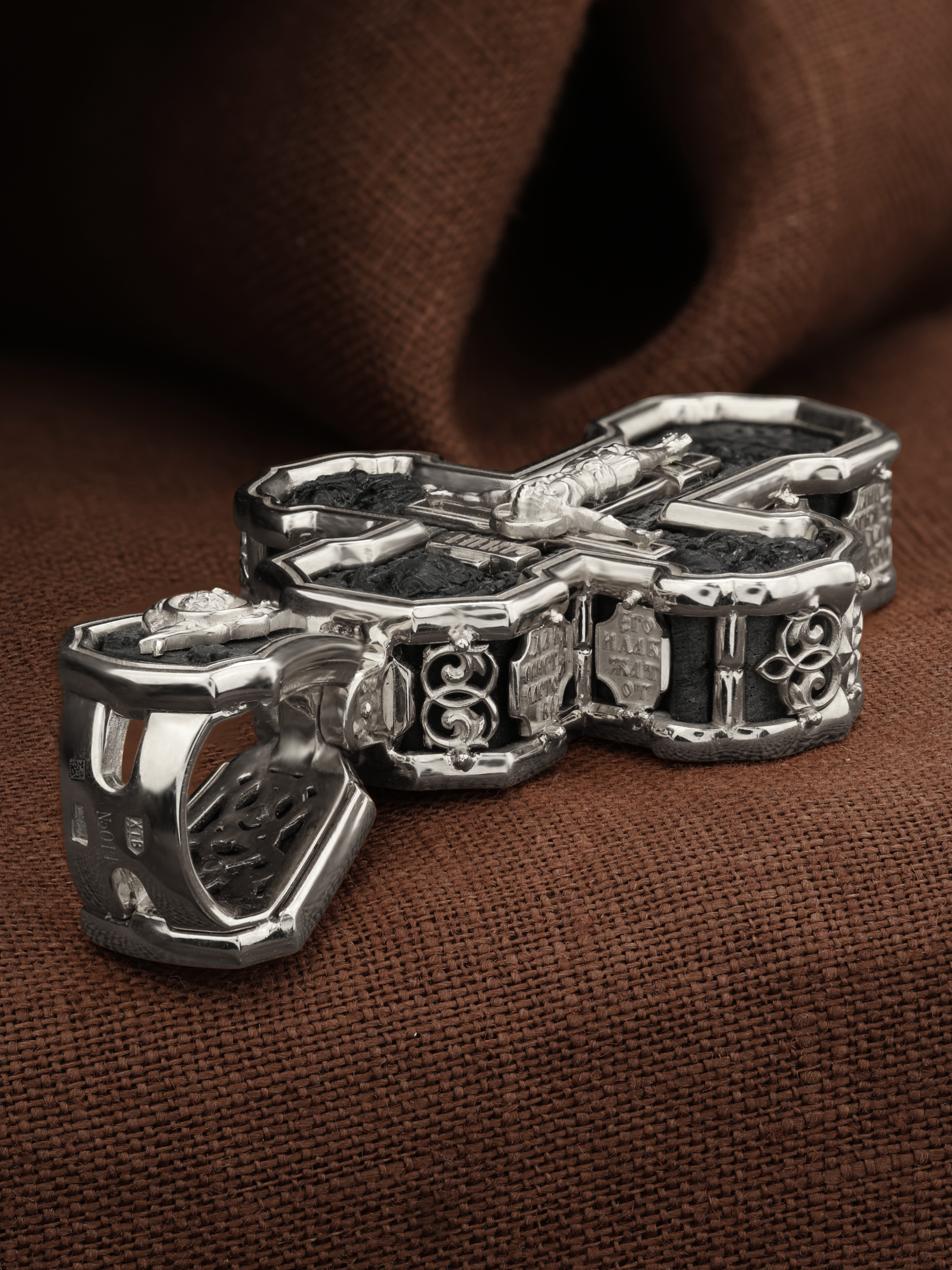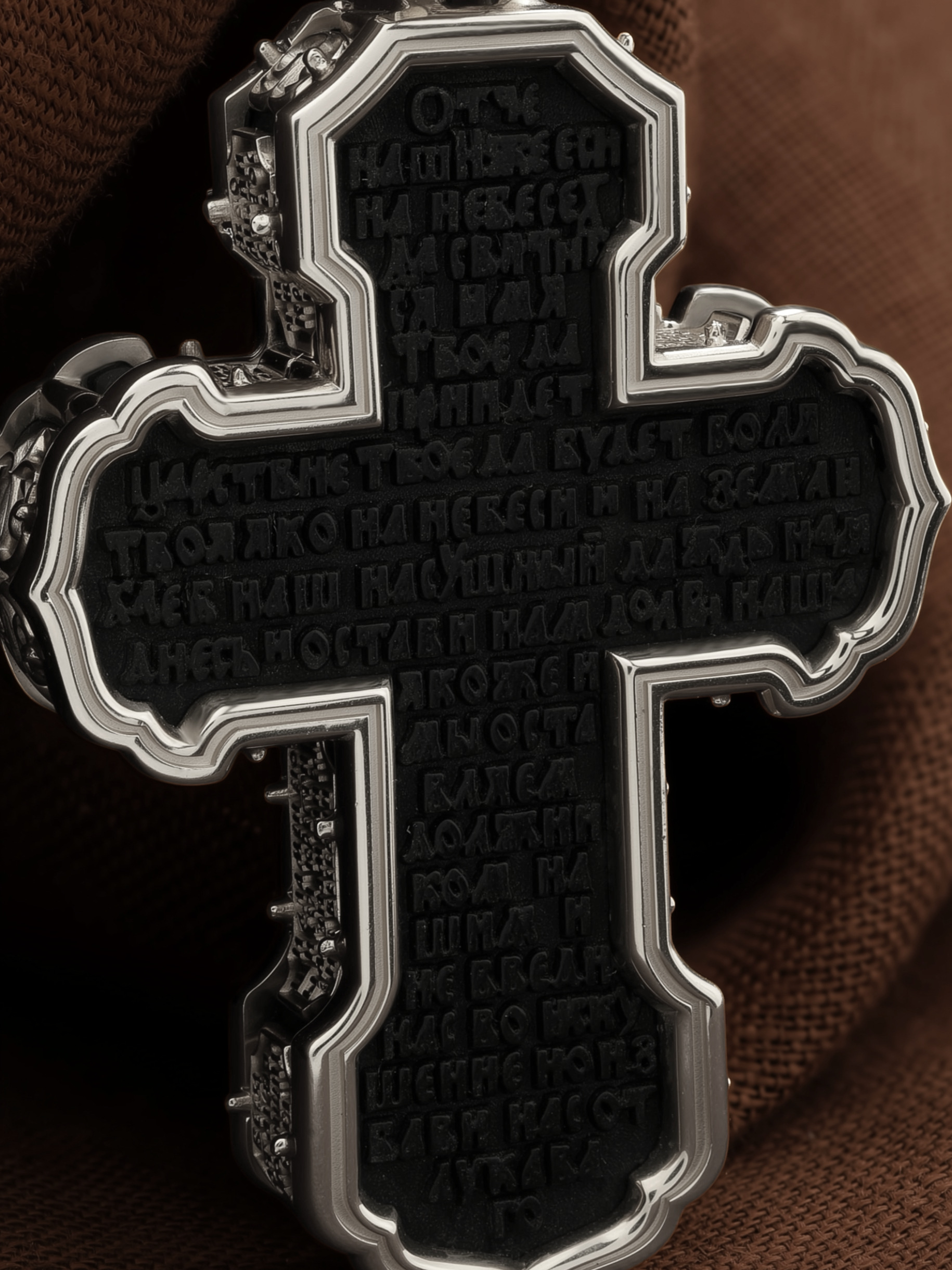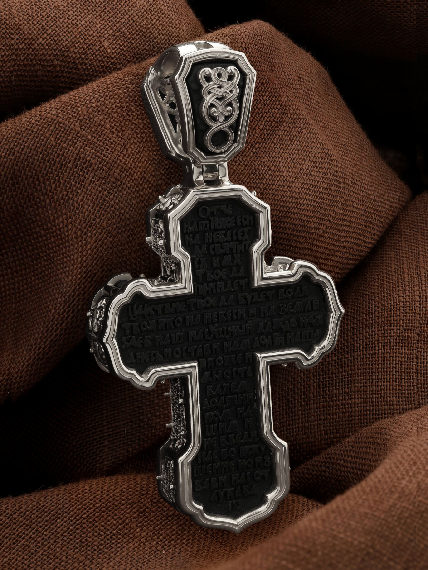 На лицевой стороне креста изображено Распятие Господа и Спасителя нашего Иисуса Христа. Крест- символ спасения и искупления рода человеческого, знамение победы над смертью и адом. Иисус Христос, как искупительная жертва освобождения человечества от власти греха, умер крестной смертью и в третий день воскрес. На верхней табличке, выше головы Иисуса, расположена надпись, составленная Понтием Пилатом — «IНЦI». Она означает «Иисус Назорей, Царь Иудейский». Надпись «IС» « ХС» означает Иисус Христос и помещается на разных сторонах поперечной (большой) перекладины креста. Рядом расположена надпись «Сын Божий». Выше Распятия изображен Нерукотворный образ Господа и Спасителя нашего Иисуса Христа. Слева от Распятия — Пресвятая Богородица и святая мироносица Мария Магдалина с крестом в руке. Справа — апостол и евангелист Иоанн Богослов, один из ближайших учеников Иисуса Христа и сотник Лонгин с крестом в правой руке и копьем — в левой. За крестом высится Иерусалимская стена. Крест стоит на горе камней, символизирующих Голгофу. В ее основании различается череп — это голова Адама. Вдоль креста изображены копие сотника Лонгина и трость с губкой и буквы «К» и «Т». Надпись «МЛРБ» — «место лобное рай бысть» означает, что место лобное стало раем и помещаются в нижней части креста. Рядом — слово «НИКА», что означает «победитель». На православном кресте Христос не умирает, а свободно простирает руки, ладони Иисуса открыты, будто он хочет обнять все человечество, даря им свою любовь и открывая путь к вечной жизни. На кулонном кольце изображен шестикрылый Серафим.
