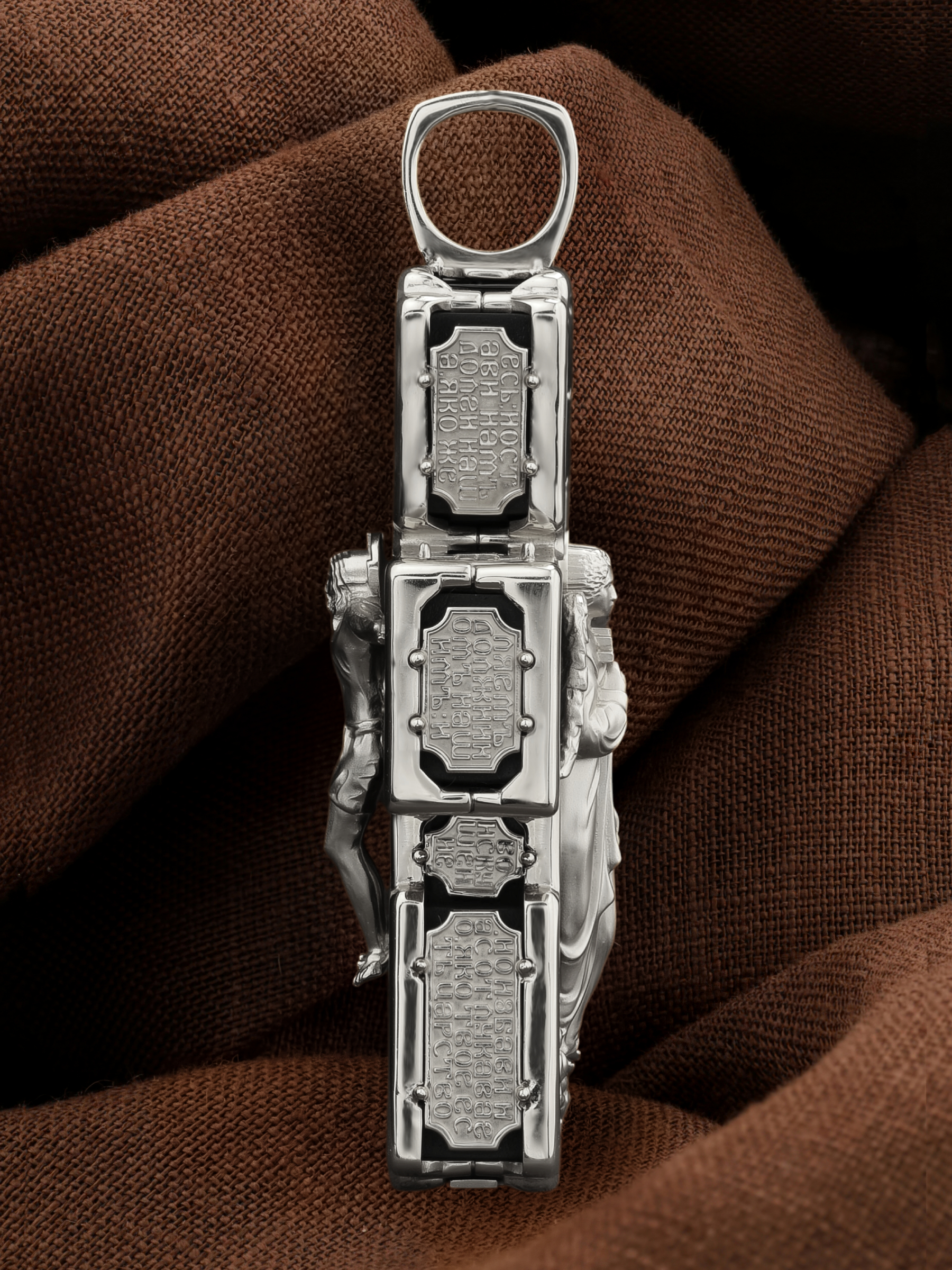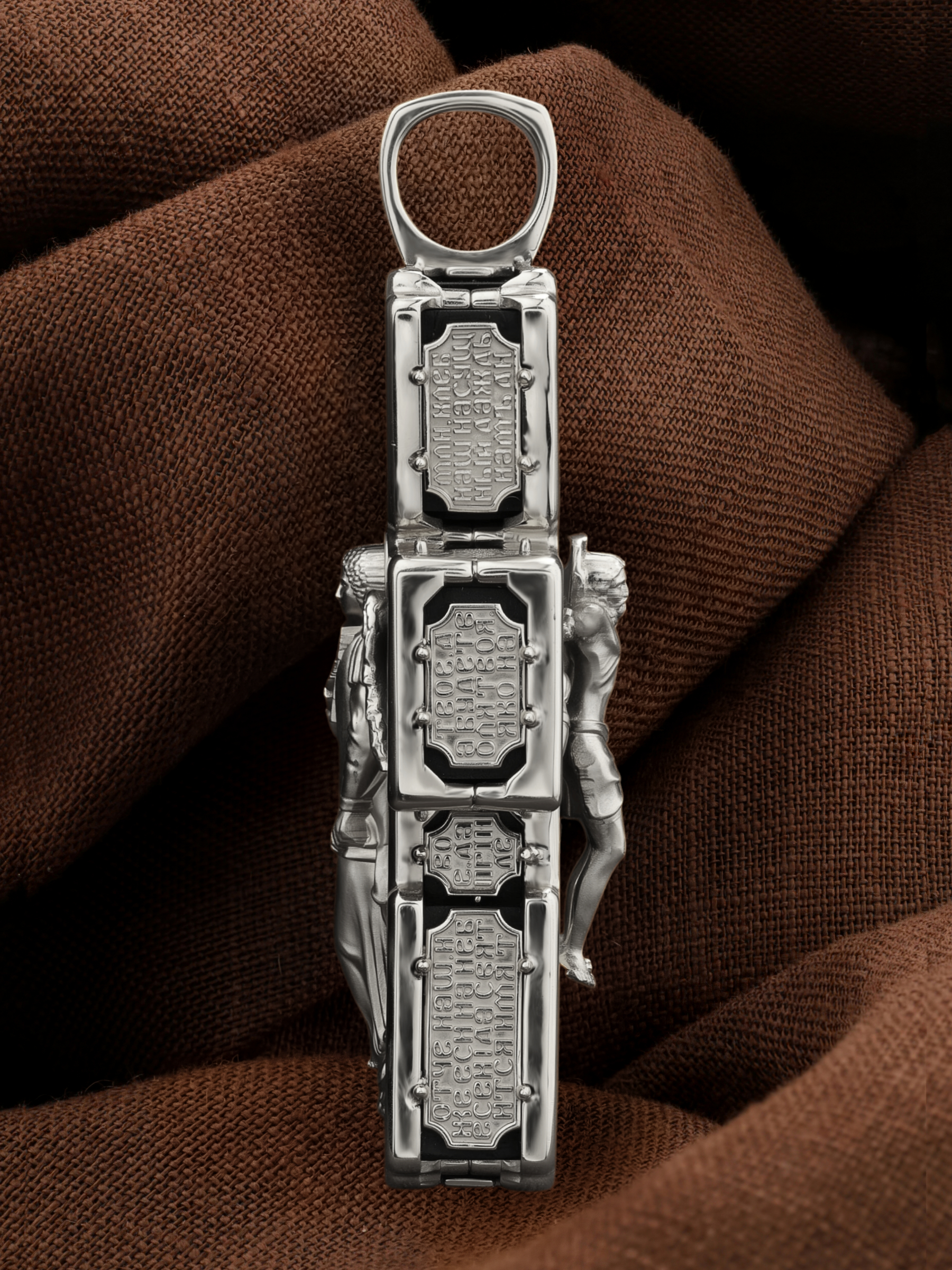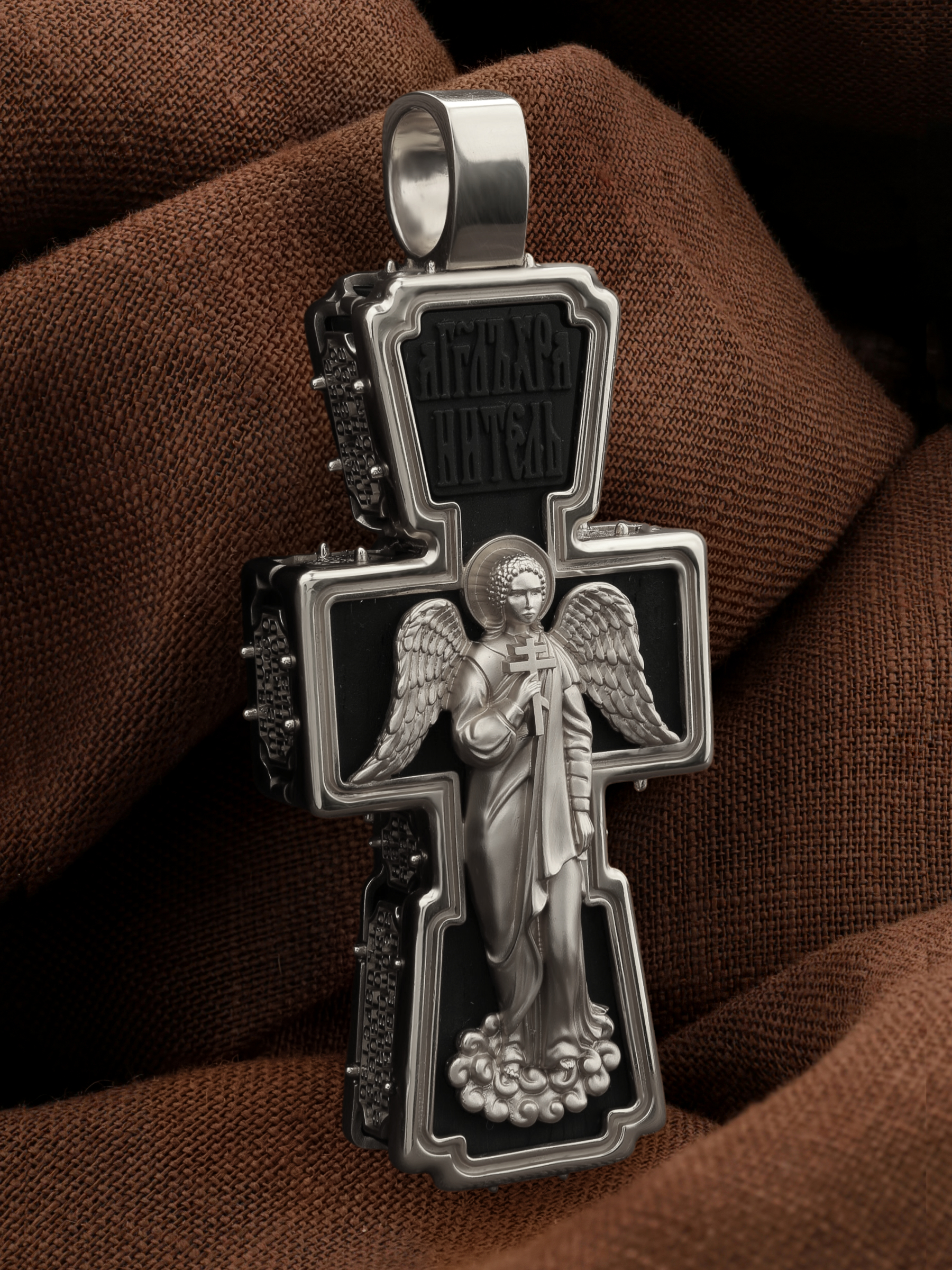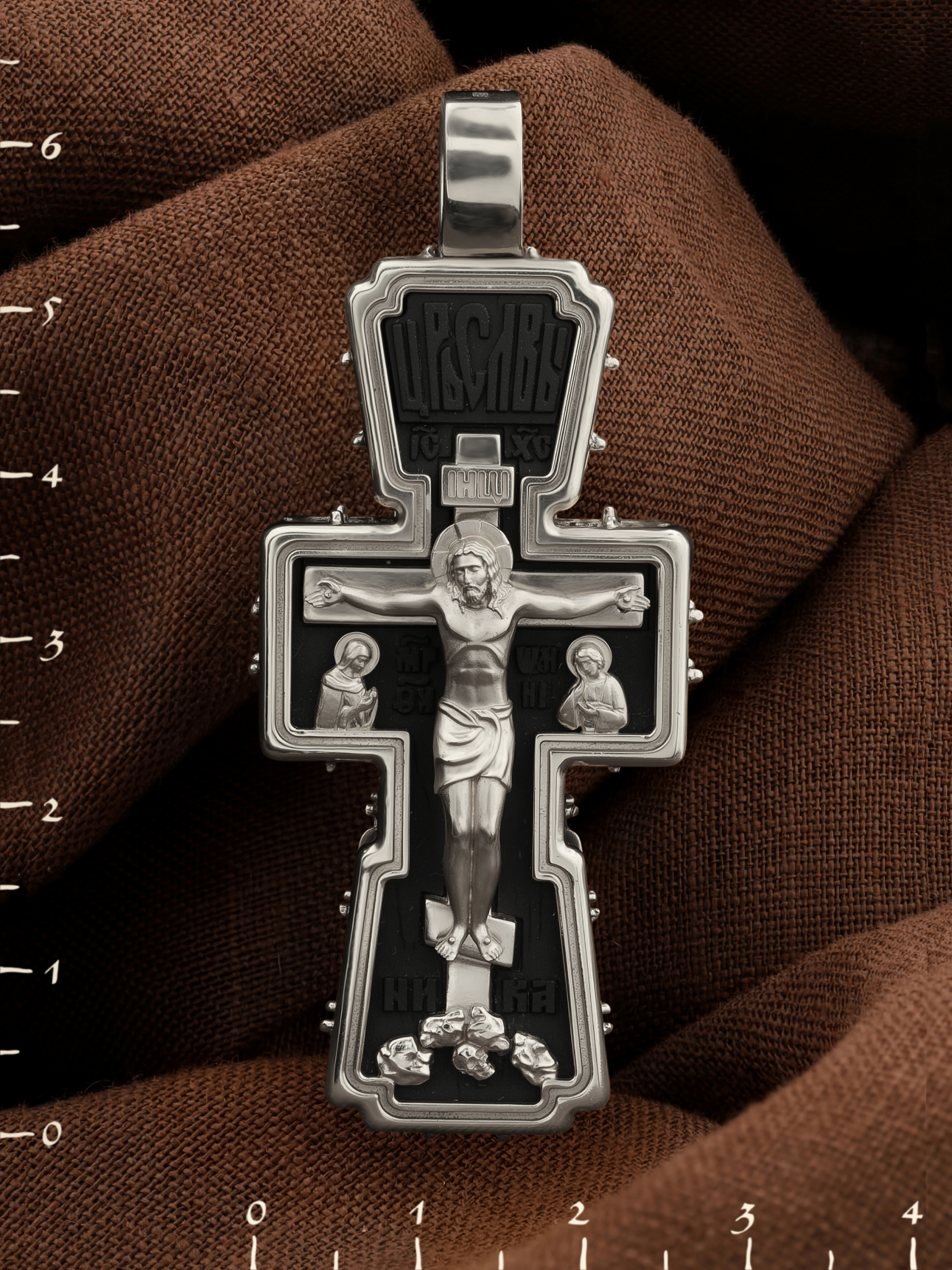 На лицевой стороне креста изображено Распятие Господа и Спасителя нашего Иисуса Христа. В Голгофе сокрыта непостижимая тайна бесконечной правды и любви Бога. Крест стал символом победы добра над злом, жизни над смертью, напоминанием бесконечной Божьей любви, предметом радости. Воплотившийся Сын Божий Своею кровью освятил крест и сделал его проводником Своей благодати, источником освящения верующих. Господь сказал: кто хочет идти за Мною, отвергнись себя, и возьми крест свой, и следуй за Мною. (Мк. 8: 34). Над Распятием помещена надпись «Царь Славы». Ниже расположена надпись «IC» «ХC», означает Иисус Христос. Слева от Распятия изображена Пресвятая Богородица, справа — апостол и евангелист Иоанн Богослов, один из ближайших учеников Иисуса Христа. В нижней части креста помещено слово «НИКА», что означает «победитель». Крест стоит на горе камней, символизирующих Голгофу. В ее основании различается череп — это голова Адама.