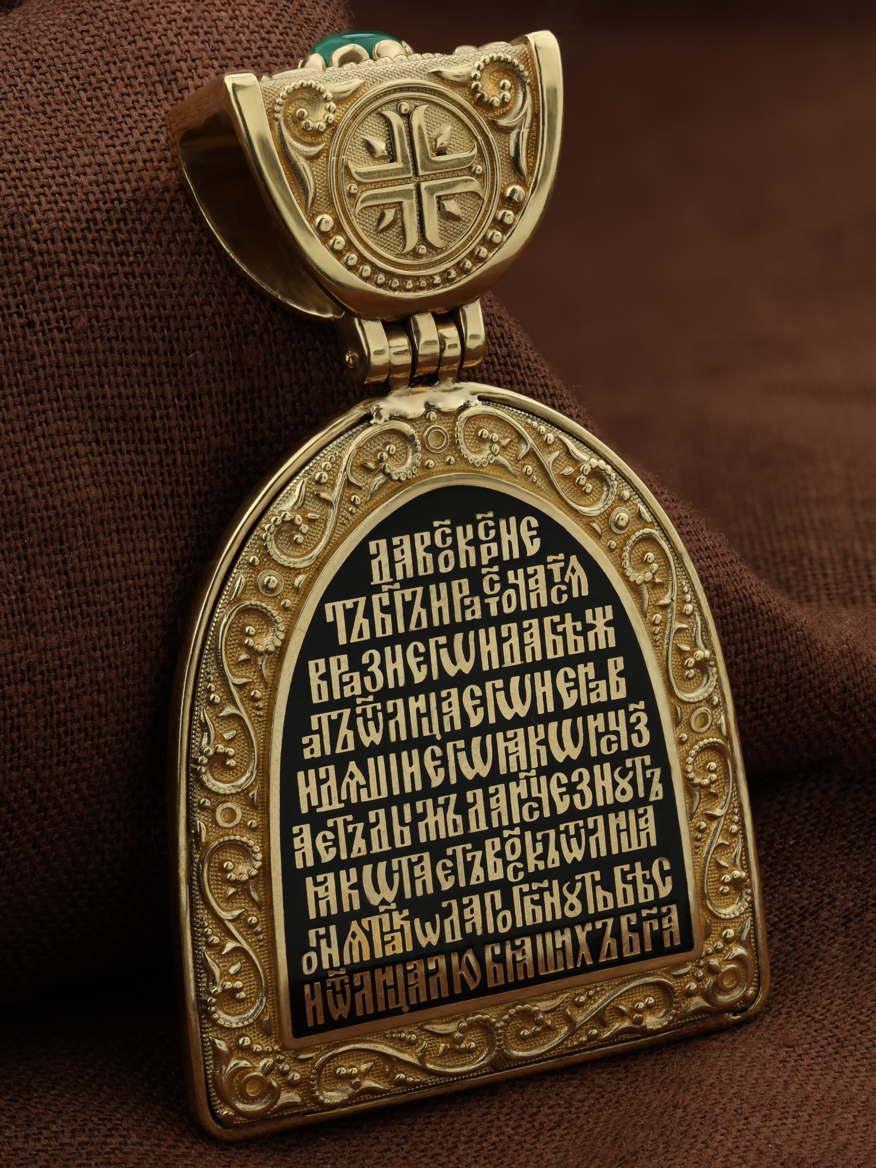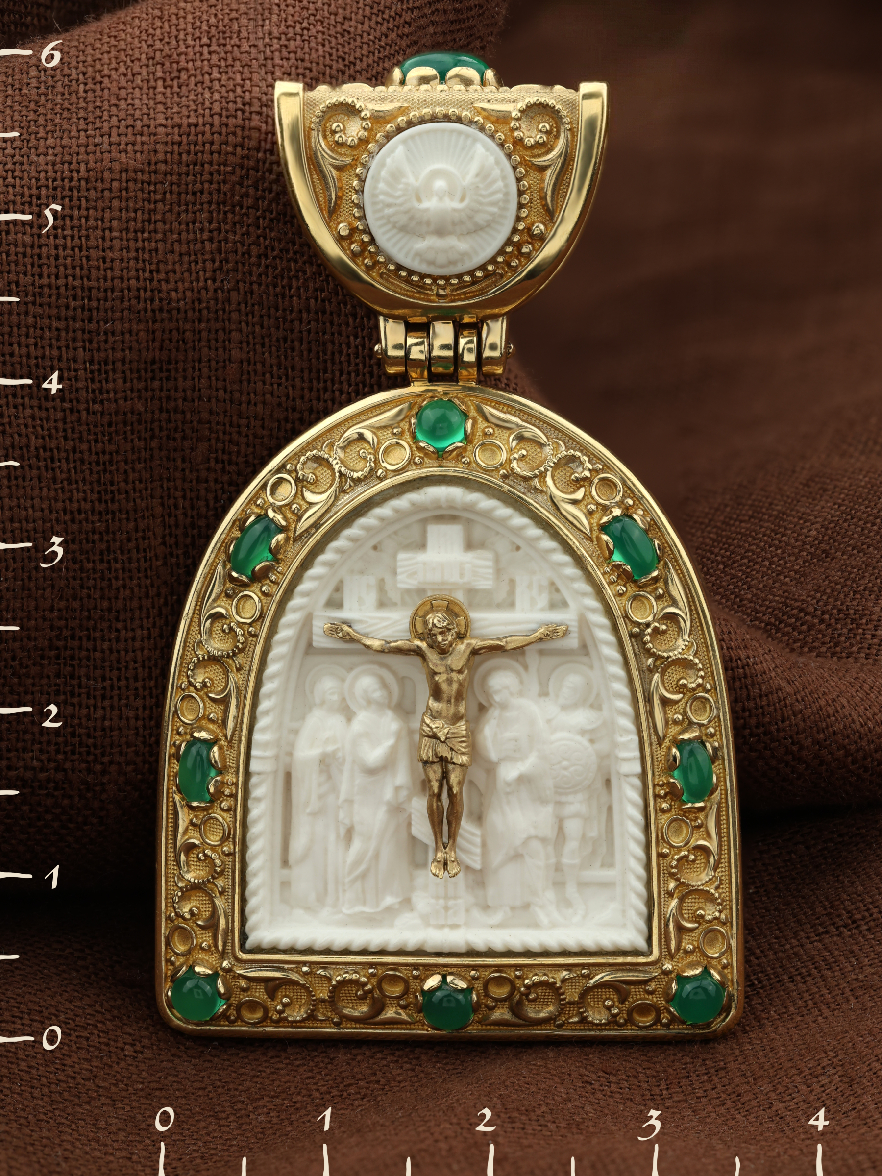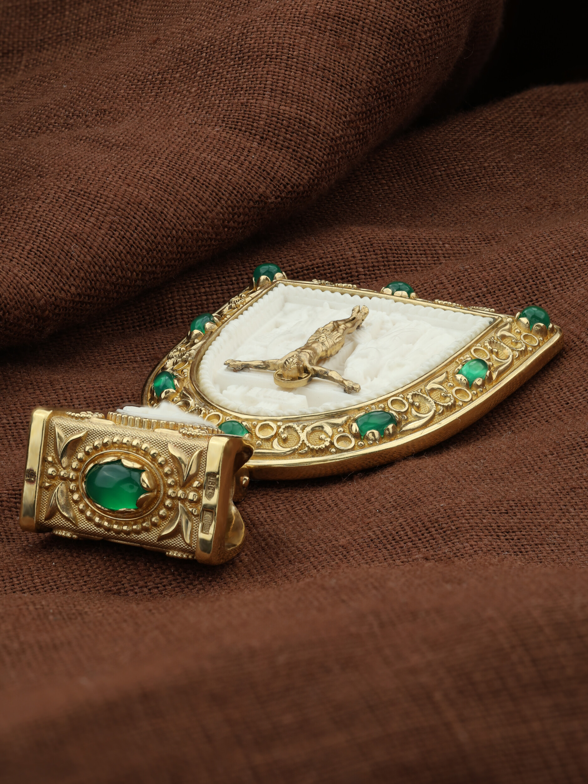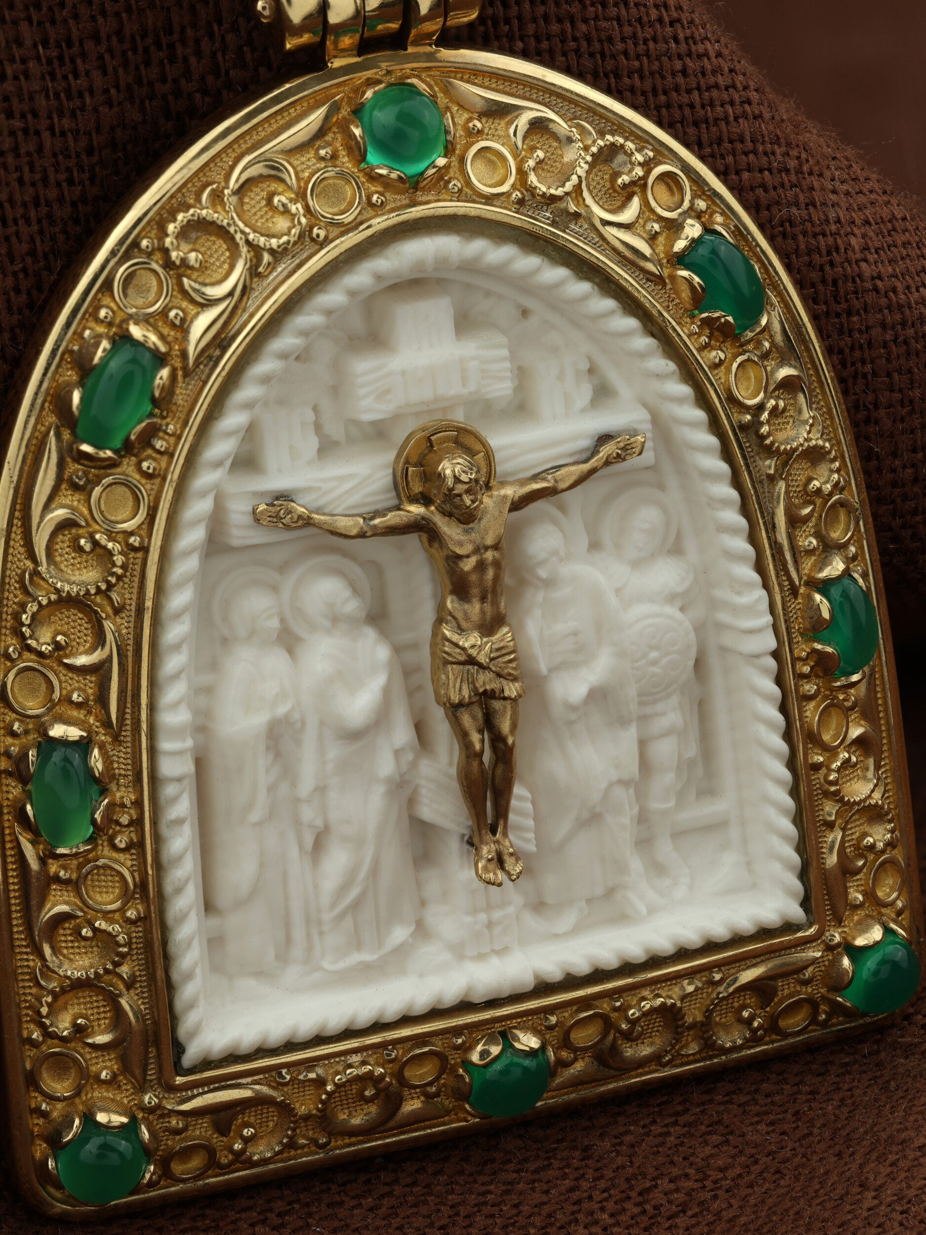 Образок из лимонного золота c эмаль, хризопразом и бивнем мамонта