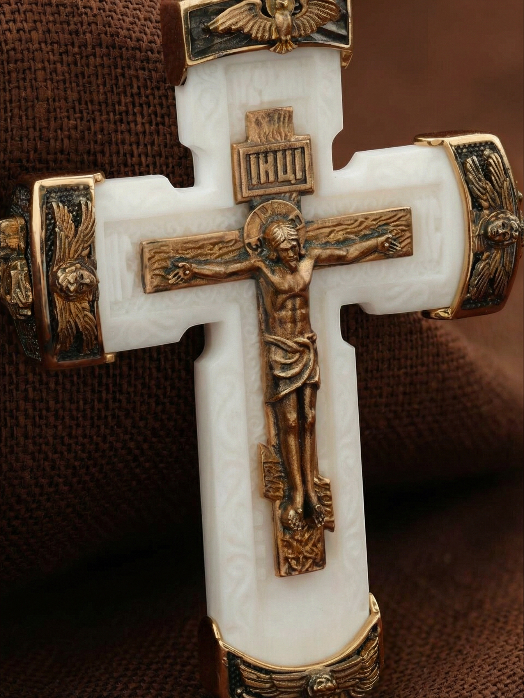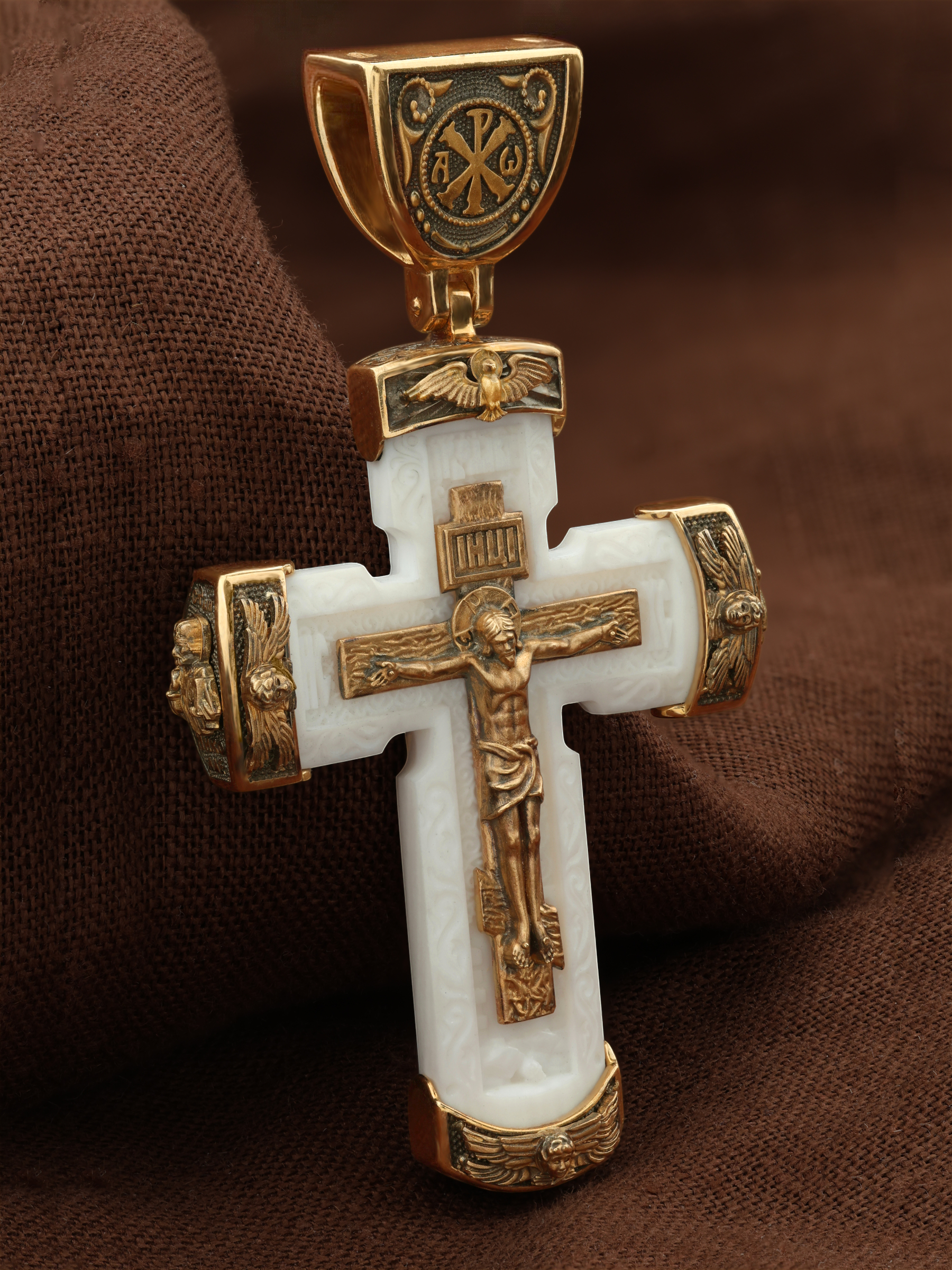 На лицевой стороне креста изображено Распятие, потому что это орудие казни Иисус Христос сделал орудием победы над грехом и смертью. Своими страданиями Он искупил грехи человечества, умерев и сошествовав во ад, победил сатану, освободил души праведников от вечной смерти и открыл им небесные врата рая. Жертва Христа сделала возможным спасение для каждого человека. На православном кресте Христос не умирает, а свободно простирает руки, ладони Иисуса открыты, будто он хочет обнять все человечество, даря им свою любовь и открывая путь к вечной жизни.