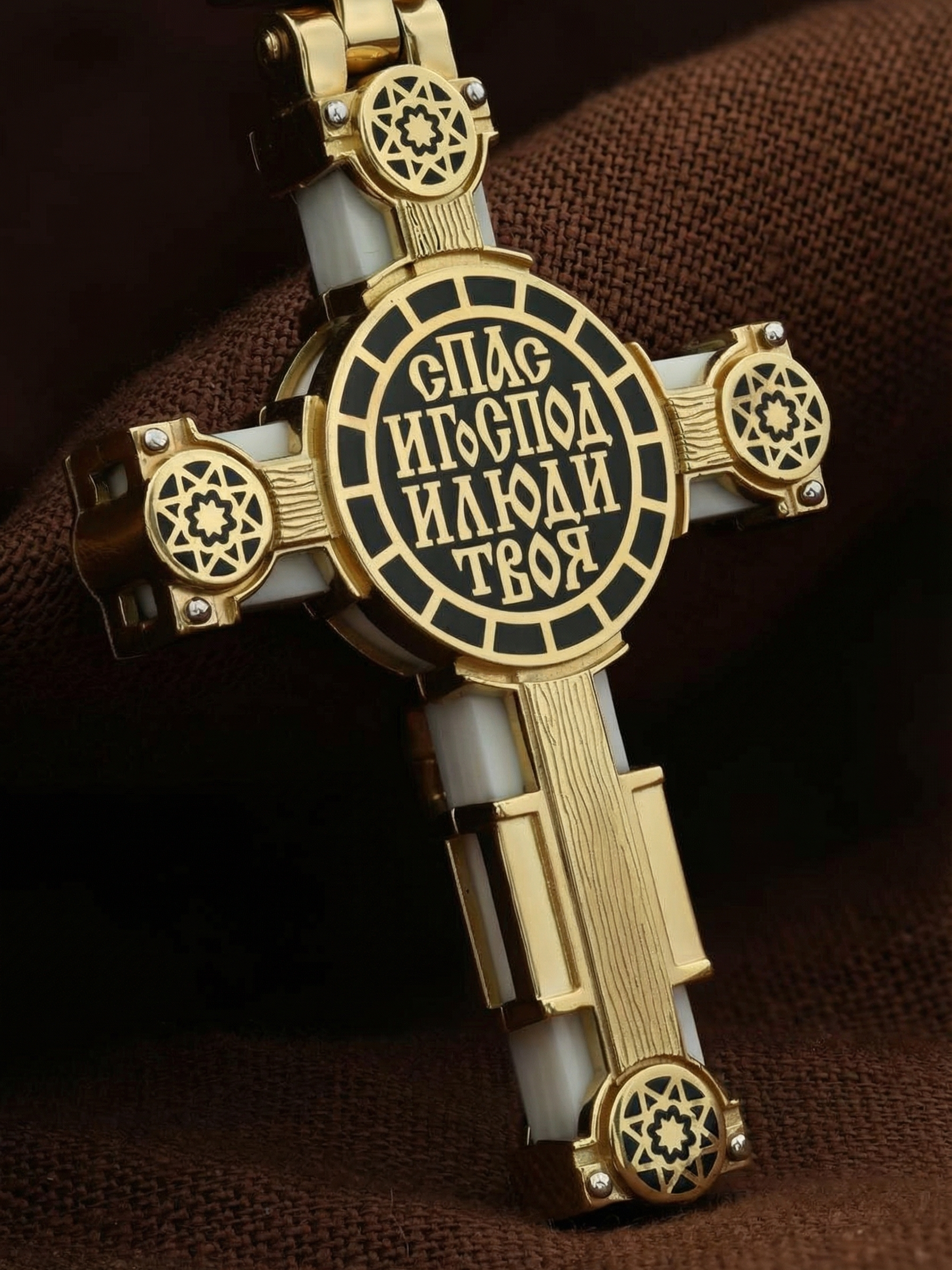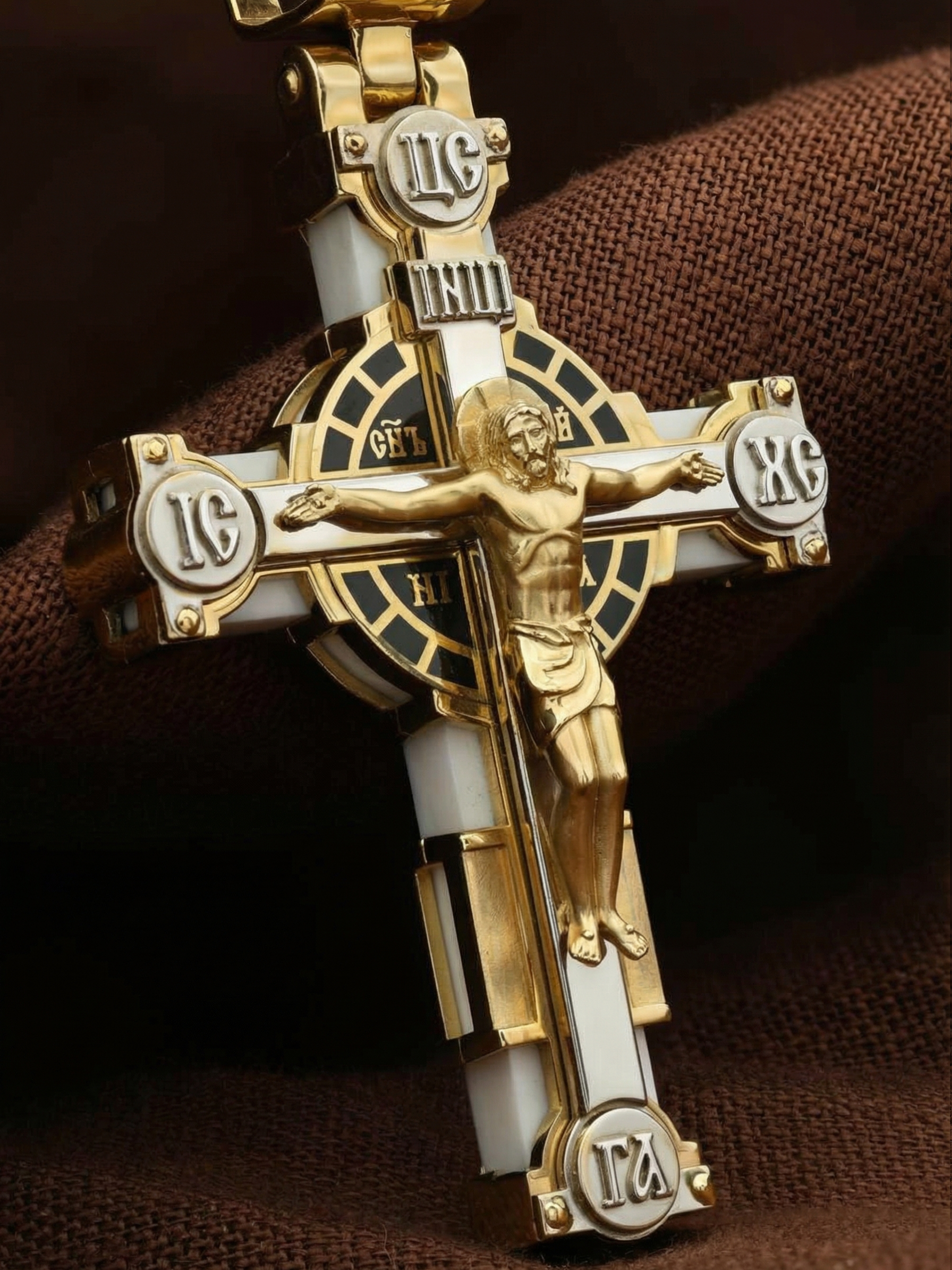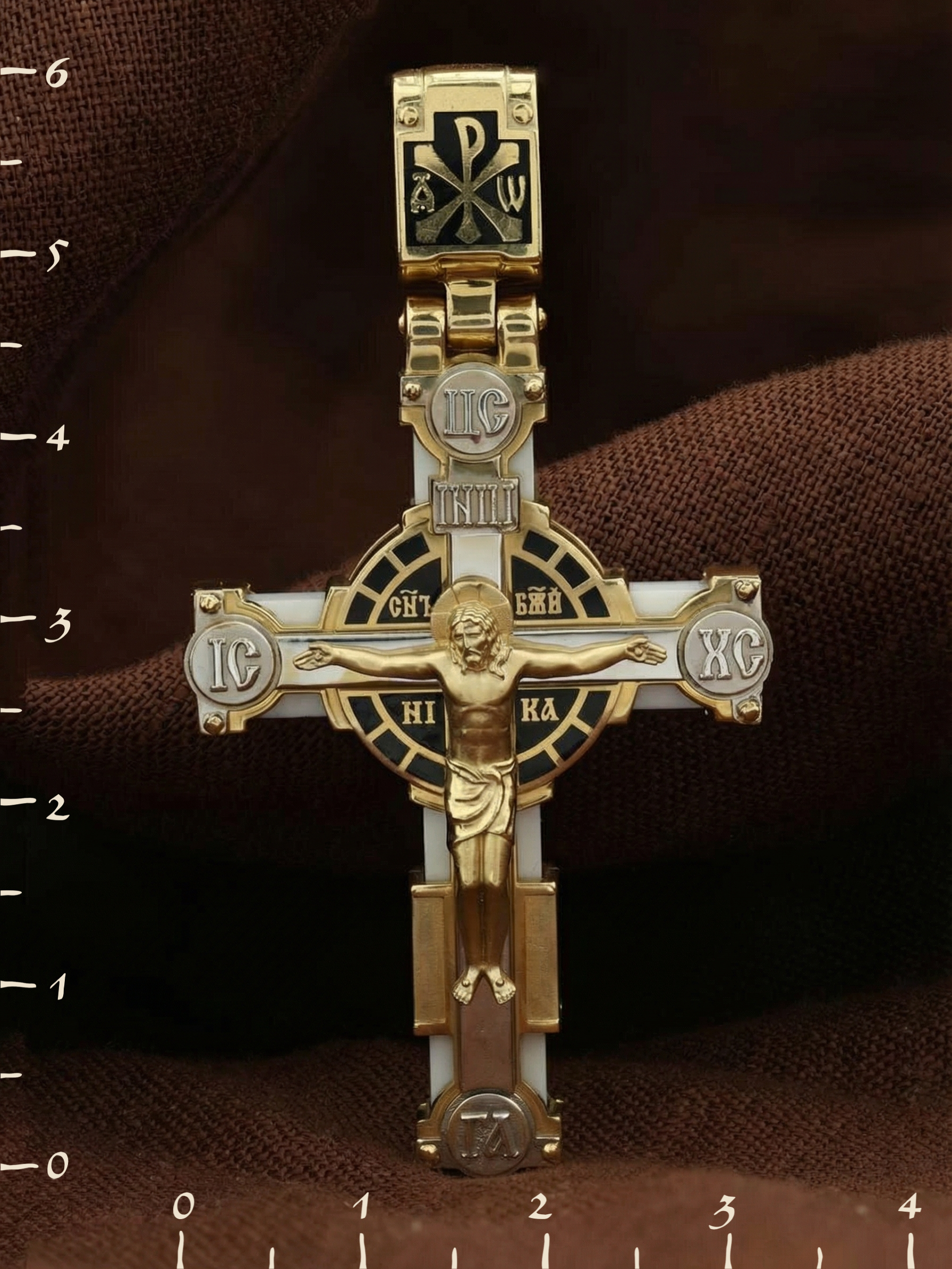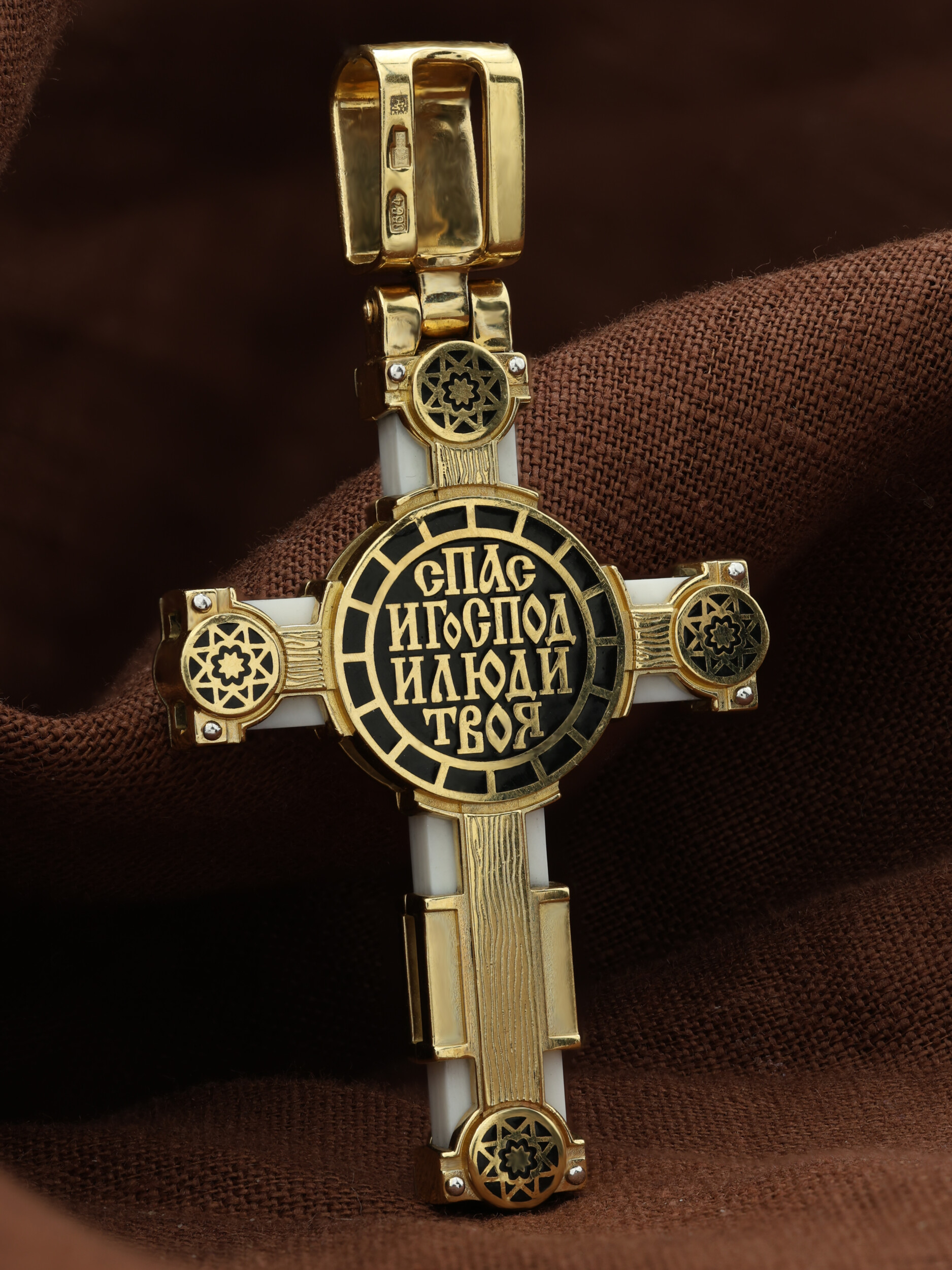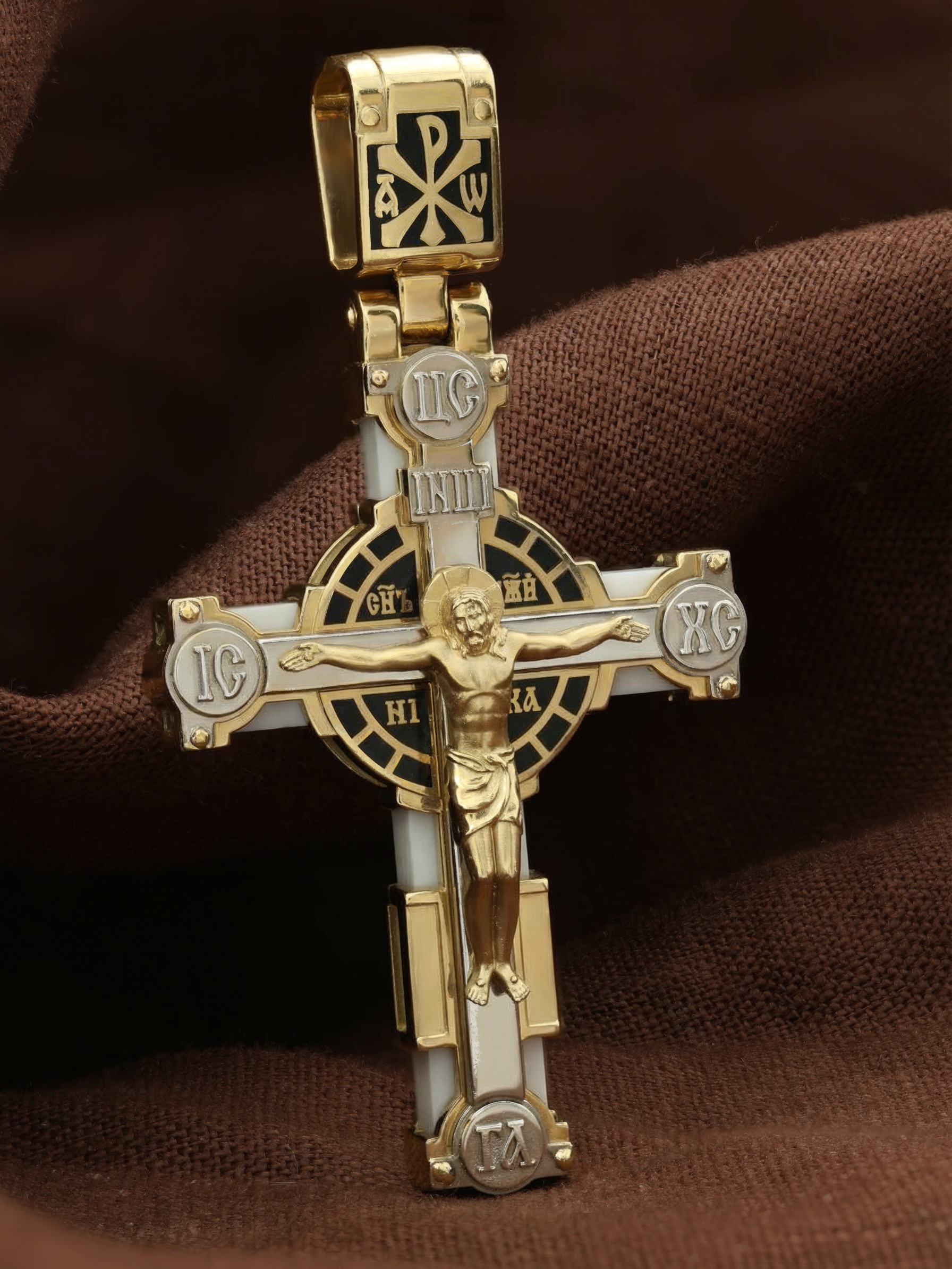 На лицевой стороне креста изображено Распятие Господа и Спасителя нашего Иисуса Христа. Христос, подвергнутый на кресте мучительной казни, своими страданиями искупил нас от древнего греха и даровал нам жизнь вечную. Без Распятия не было бы Воскресения Христова, и поэтому Крест из орудия казни обратился в святыню, в которой действует Благодать Божия. В Голгофе сокрыта непостижимая тайна бесконечной правды и любви Бога. Крест стал символом победы добра над злом, жизни над смертью, напоминанием бесконечной Божьей любви, предметом радости. Воплотившийся Сын Божий Своею кровью освятил крест и сделал его проводником Своей благодати, источником освящения верующих. Через крестную жертву Бог раскрывает нам Свою безмерную любовь и призывает к ответной любви. Над вершиной Распятия помещена надпись «Царь Славы». На верхней табличке, выше головы Иисуса, расположена надпись, составленная Понтием Пилатом — «IНЦI». Она означает «Иисус Назорей, Царь Иудейский». Надпись «IС ХС» означает Иисус Христос помещается на разных сторонах поперечной перекладины креста. Рядом помещены словосочетание «СЫН БОЖИЙ», что означает божественную природу Иисуса Христа и надпись –«НИКА», что означает победитель. Надпись «Г.А.» — голова Адама, грехи которого Христос омыл Своею Кровью, размещена под подножием креста. На православном кресте Христос не умирает, а свободно простирает руки, ладони Иисуса открыты, будто он хочет обнять все человечество, даря им свою любовь и открывая путь к вечной жизни. На кулонном кольце помещен крест Константина — монограмма, известная как «Хи-Ро» («хи» и «ро» — первые две буквы имени Христа по-гречески). Монограмма стала первым общепринятым символом христианства — как знак победы и спасения.