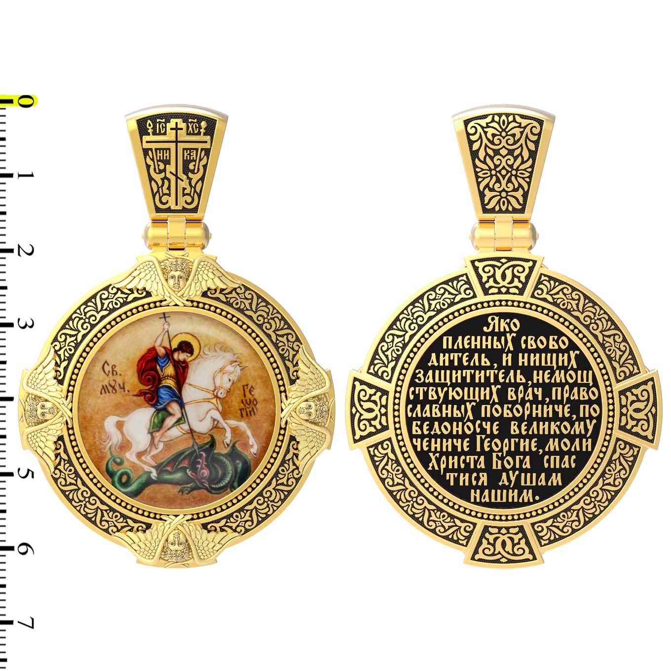 На обороте написана молитва"Яко пленных свободитель, и нищих защититель, немощствующих врач, православных поборниче, победоносче великому чениче Георгие, моли Христа Бога спастися душам нашим.»