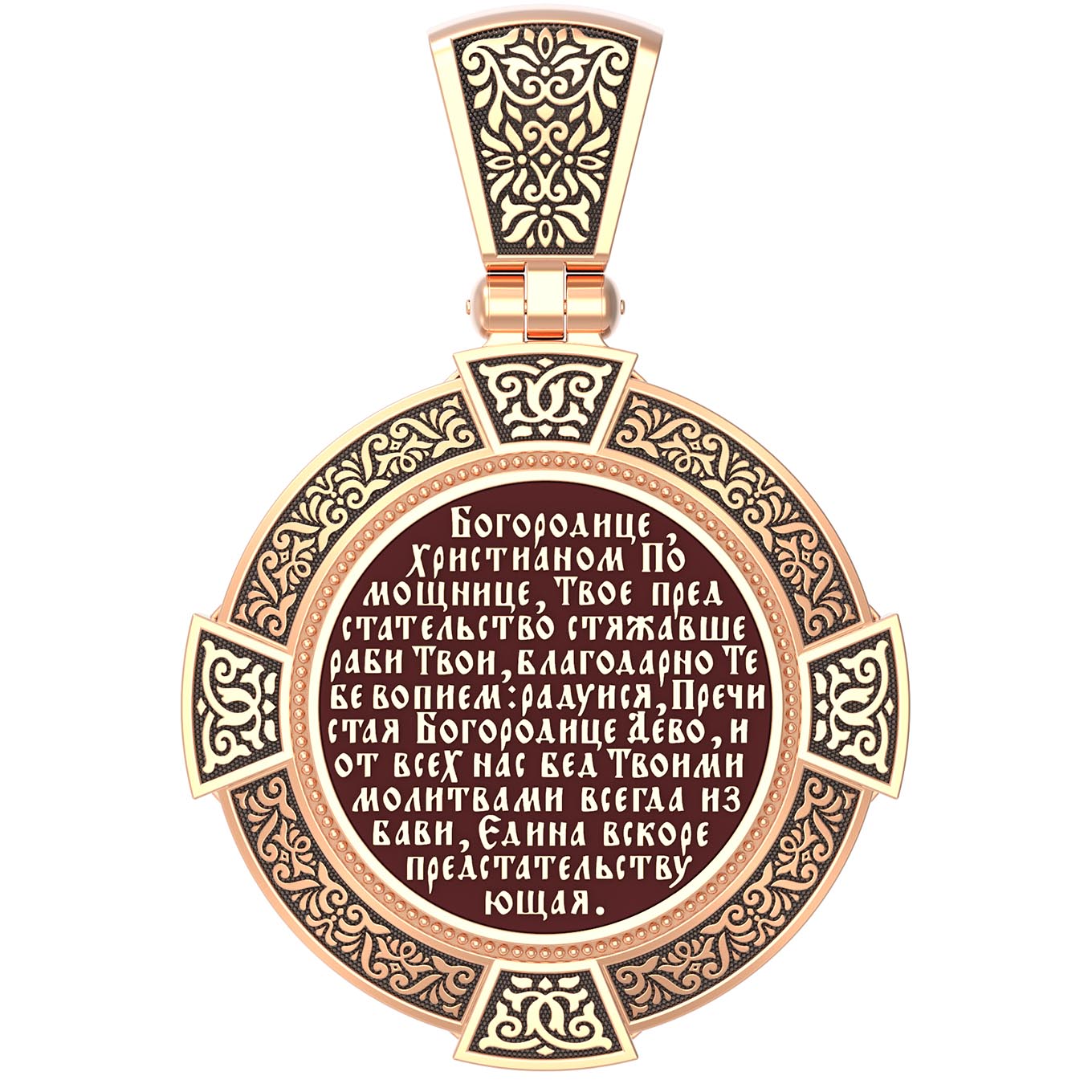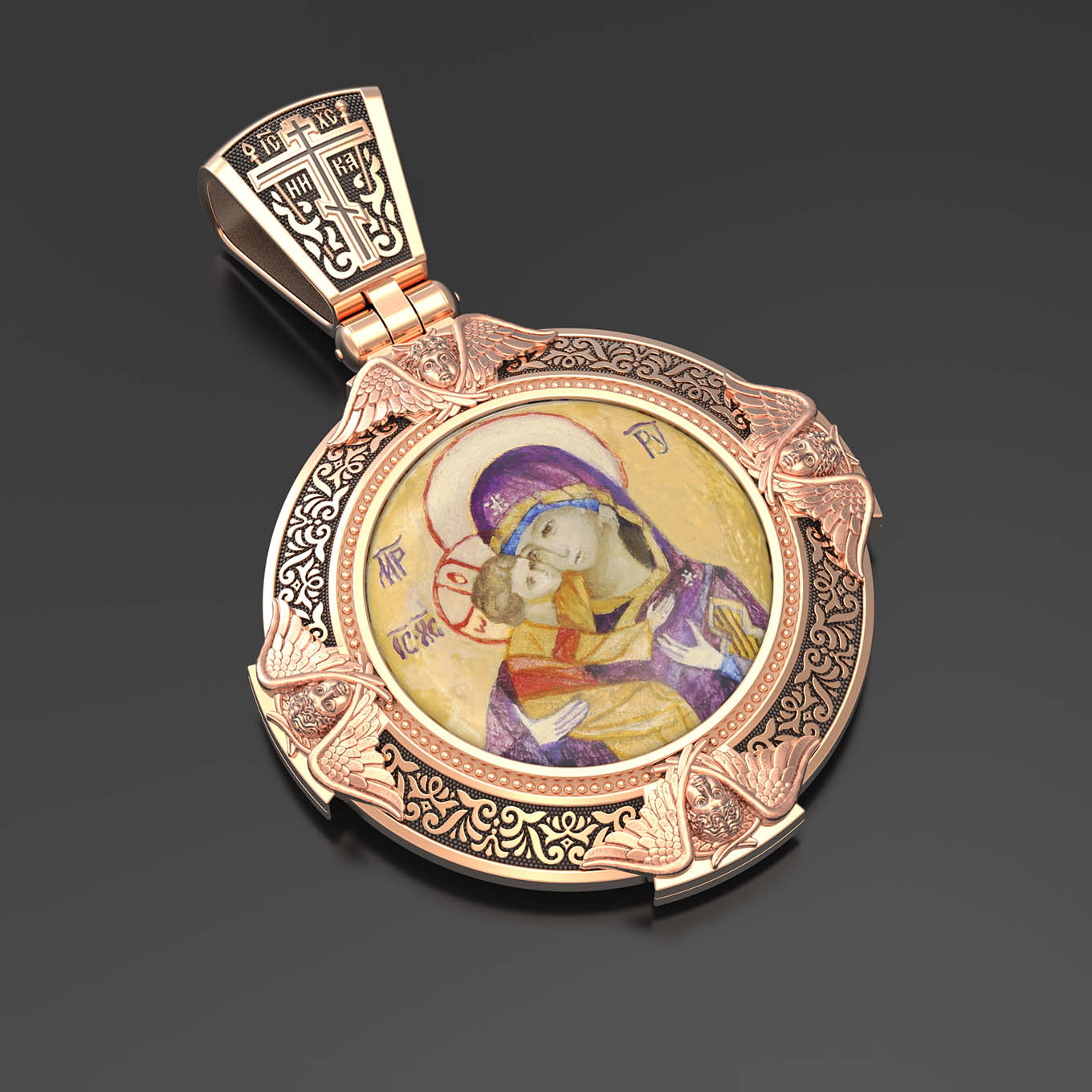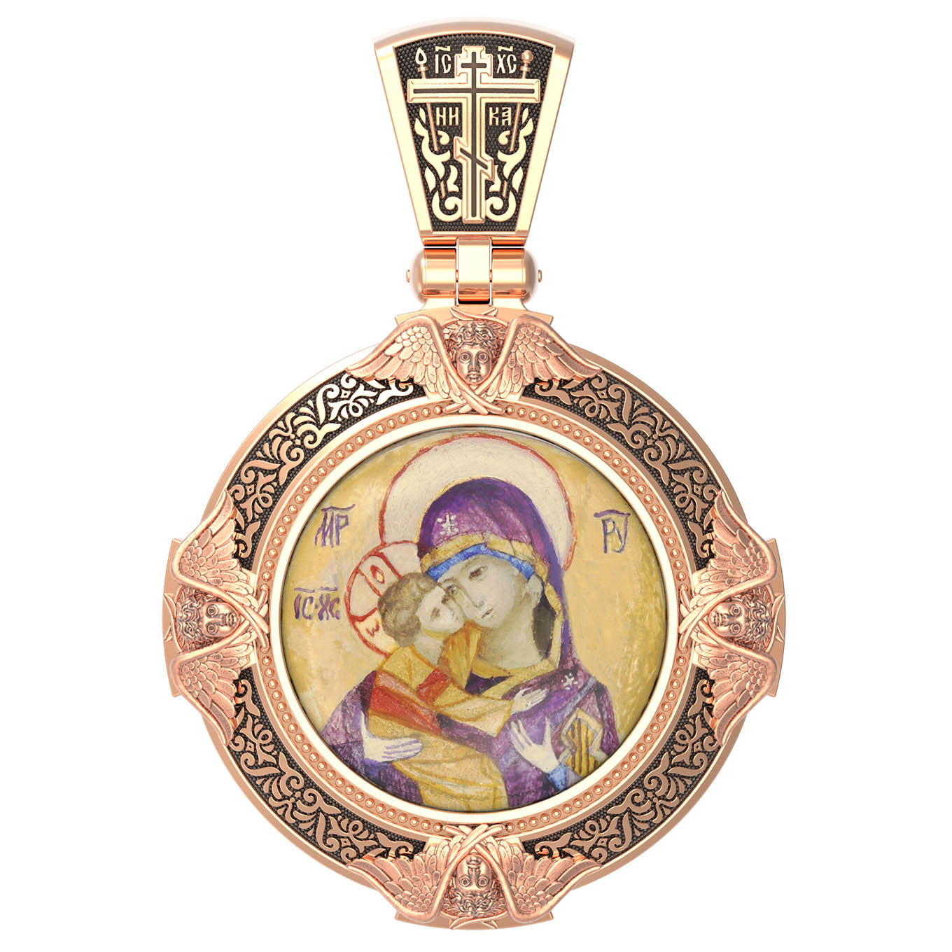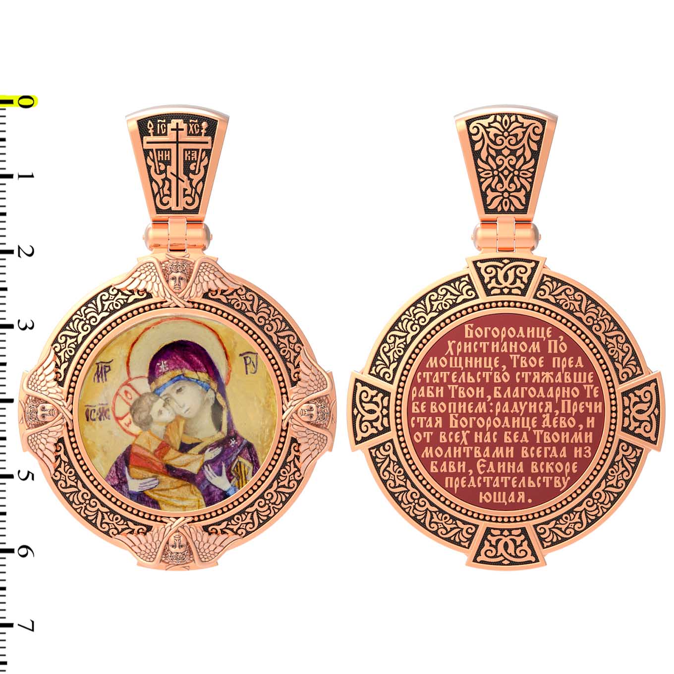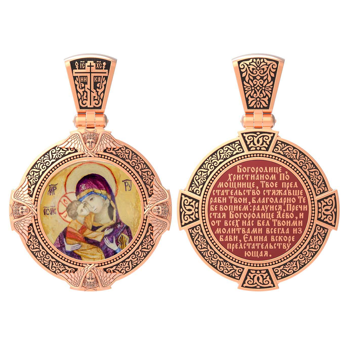 На лицевой стороне образка изображена Владимирская икона Божией Матери — одна из самых чтимых святынь Русской православной церкви. По преданию, икона была написана Святым апостолом и евангелистом Лукой во время земной жизни Богородицы. Дева Мария, увидев Свое изображение, молвила: «Отныне ублажат Мя вси роди. Благодать Рождшегося от Меня и Моя с сим образом да будет». Образ написан в лирическом иконографическом типе «Умиление». Младенец припал щекой к щеке Матери и тянется к ней правой рукой, другой нежно обнимая за шею. Икона вплоть до V века находилась в Иерусалиме, затем была перевезена в Византию. На Русь икона была привезена в 1131 г. За прошедшие столетия святыня неоднократно переезжала из Владимира в Москву и обратно, не раз спасая страну от захватчиков. Русская Православная Церковь установила троекратное празднование Владимирской иконе Божьей Матери. Каждый из дней празднования связан с избавлением русского народа от порабощения иноплеменниками по молитвам ко Пресвятой Богородице. В последующие века у иконы происходили многие важные исторические события: подписание актов, принятие присяги значимых государственных деятелей и возведение на престол. На кулонном кольце изображен Спас Нерукотворный — образ Господа и Спасителя нашего Иисуса Христа, чудесно отпечатавшийся на плате, котором Христос вытер свой лик.