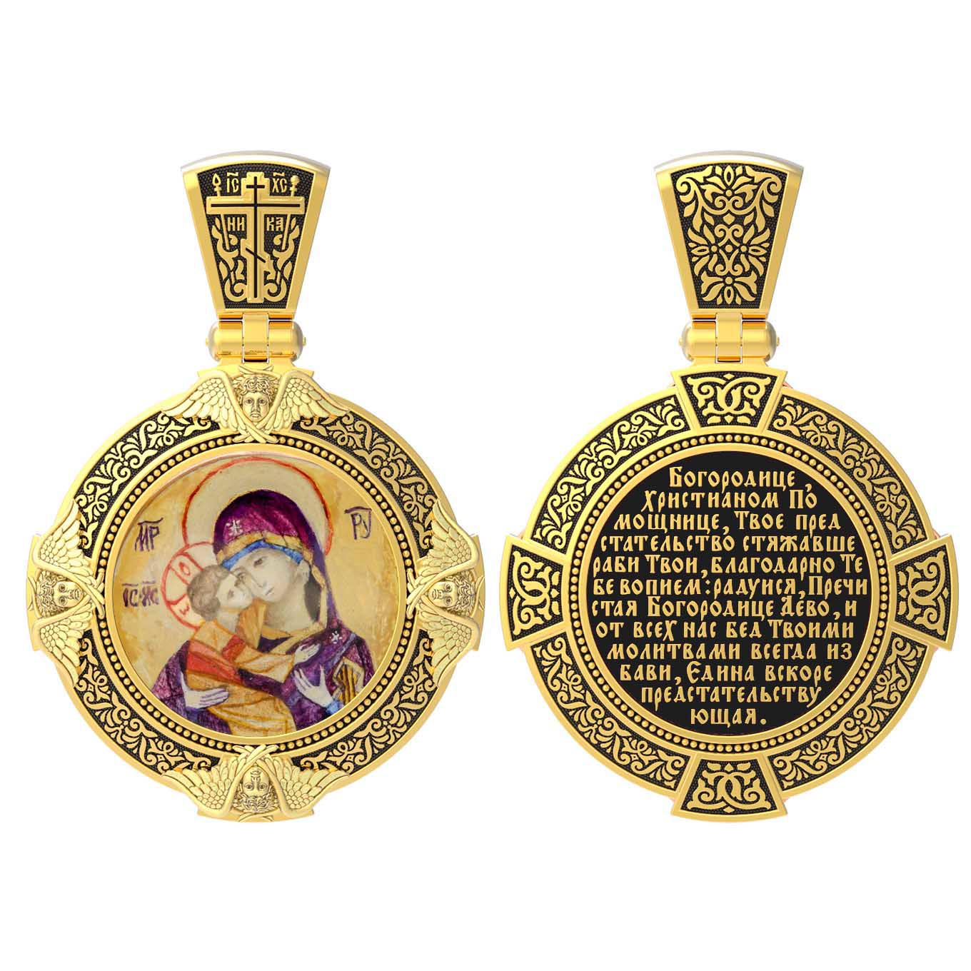 На лицевой стороне образка изображена Владимирская икона Божией Матери — одна из самых чтимых святынь Русской православной церкви. По преданию, икона была написана Святым апостолом и евангелистом Лукой во время земной жизни Богородицы. Дева Мария, увидев Свое изображение, молвила: «Отныне ублажат Мя вси роди. Благодать Рождшегося от Меня и Моя с сим образом да будет». Образ написан в лирическом иконографическом типе «Умиление». Младенец припал щекой к щеке Матери и тянется к ней правой рукой, другой нежно обнимая за шею. Икона вплоть до V века находилась в Иерусалиме, затем была перевезена в Византию. На Русь икона была привезена в 1131 г. За прошедшие столетия святыня неоднократно переезжала из Владимира в Москву и обратно, не раз спасая страну от захватчиков. Русская Православная Церковь установила троекратное празднование Владимирской иконе Божьей Матери. Каждый из дней празднования связан с избавлением русского народа от порабощения иноплеменниками по молитвам ко Пресвятой Богородице. В последующие века у иконы происходили многие важные исторические события: подписание актов, принятие присяги значимых государственных деятелей и возведение на престол. На кулонном кольце изображен Спас Нерукотворный — образ Господа и Спасителя нашего Иисуса Христа, чудесно отпечатавшийся на плате, котором Христос вытер свой лик.