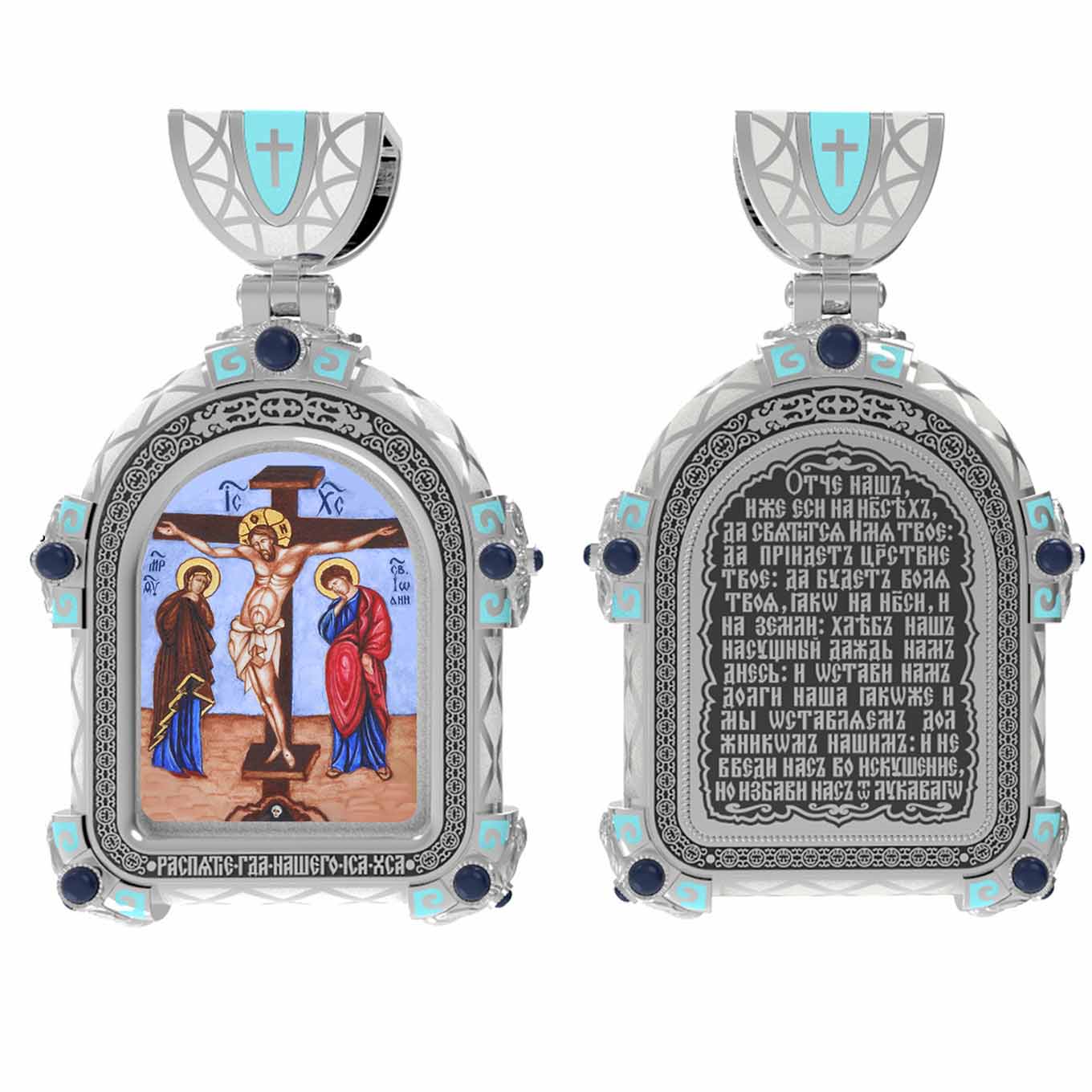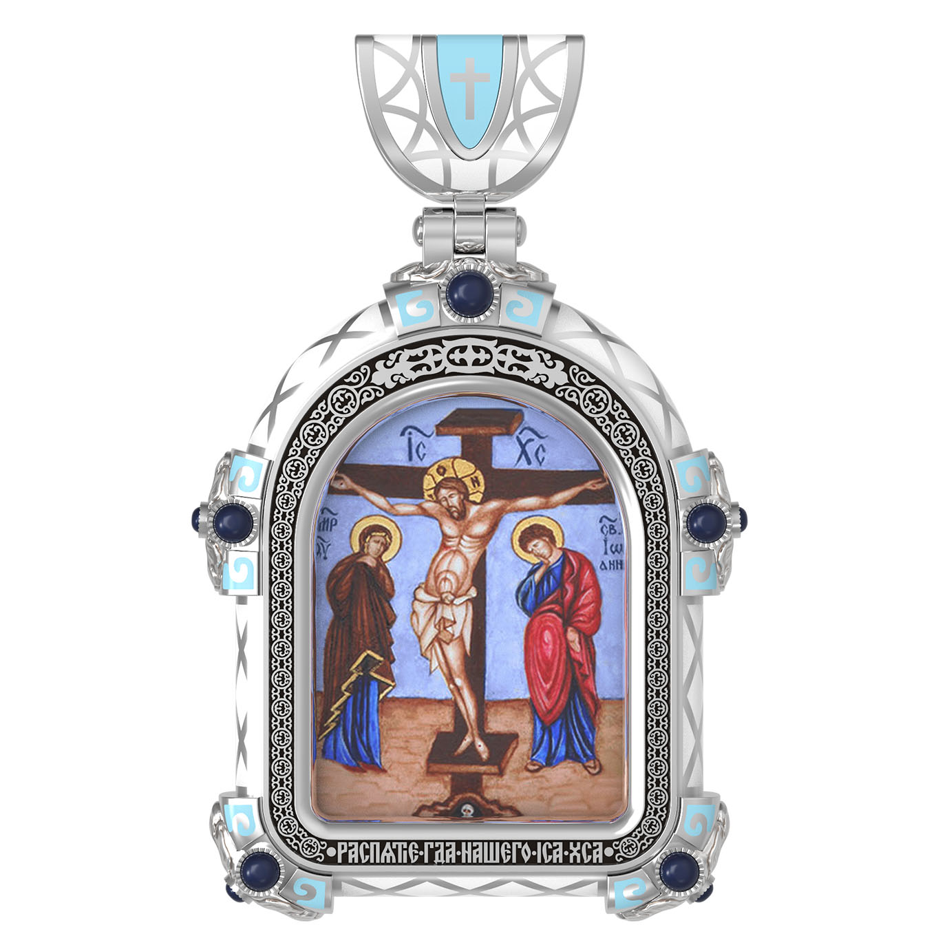 На лицевой стороне образка изображено Распятие Господа и Спасителя нашего Иисуса Христа. Своими крестными страданиями Господь смыл наши грехи, покрыл наш долг перед Богом или, на языке Писания, нас «искупил». В Голгофе сокрыта непостижимая тайна бесконечной правды и любви Бога. Крест стал символом победы добра над злом, жизни над смертью, напоминанием бесконечной Божьей любви, предметом радости. Воплотившийся Сын Божий Своею кровью освятил крест и сделал его проводником Своей благодати, источником освящения верующих. На верхней табличке, выше головы Иисуса, расположена надпись, составленная Понтием Пилатом — «IНЦI». Она означает «Иисус Назорей, Царь Иудейский». Ниже перекладины написано сокращенно имя Спасителя «IC» «XC» — Иисус Христос. Крест стоит на горе камней, символизирующих Голгофу. Под подножием Креста изображена покоящаяся голова (череп) Адама. Слева от Распятия стоят оплакивающие Господа Пресвятая Богородица и святая мироносица Мария Клеопова. Справа — апостол и евангелист Иоанн Богослов, один из ближайших учеников Иисуса Христа и сотник Лонгин с крестом в правой руке и копьем — в левой. По преданию, увидя, что они горько плачут, Иисус сказал Матери Своей: «Жено! Се сын Твой!» Потом сказал ученику Иоанну: «Се мати твоя». С этого времени Иоанн взял Матерь Божию к себе, и Она жила в его доме до самой смерти.