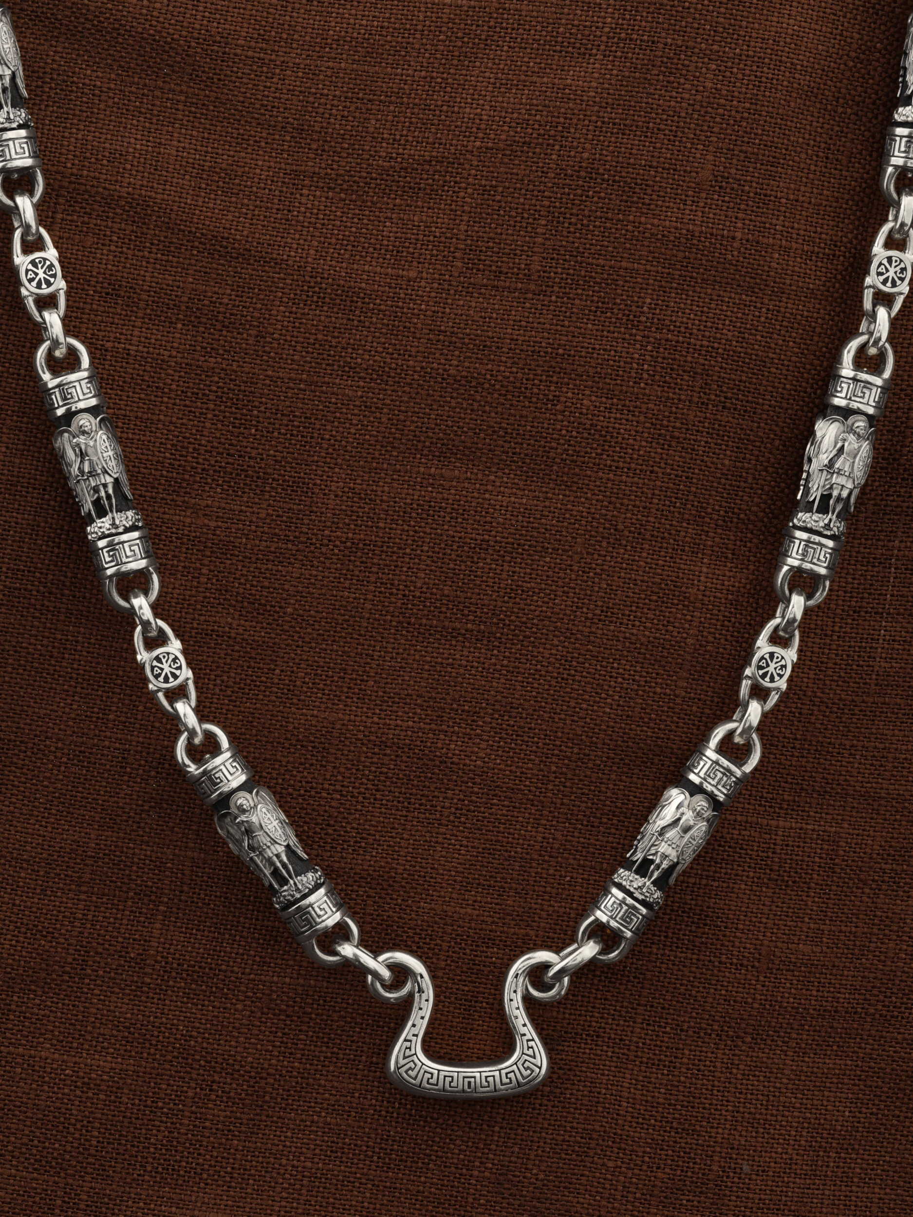 На звеньях цепи изображена Хризма — монограмма имени Христа, которая состоит из двух начальных греческих букв имени — Х (хи) и Р (ро), скрещённых между собой. По краям монограммы помещены греческие буквы a и w. Такое употребление этих букв восходит к тексту Апокалипсиса: «Аз есмь Альфа и Омега, начало и конец, говорит Господь, Который есть и был и грядет, Вседержитель.» (Откр. 1:8; см. также Откр. 22:13). Также на звеньях изображен Святой Ангел-Хранитель в виде прекрасного юноши держащего в правой руке мечь, а в левой — щит. Ангел-Хранитель — это Ангел приставляемый Богом к человеку при крещении для охраны и помощи в добрых делах. Он невидимо находится при человеке на протяжении всей его жизни, если человек сохраняет в себе любовь к Богу и истинную веру перед Ним. Ангел-Xранитель делают для нас все, что служит к истинному нашему благу и спасению. Невидимо пребывая при нас постоянно, он, руководствуя нас ко спасению, не только по нашему желанию таинственно наставляет нас на все доброе и полезное, не только возносит наши молитвы к Богу, но еще и сам от себя охраняют и защищают нас от врагов видимых и невидимых и ходатайствует за нас пред Богом. Ангел-Хранитель так любит нас, как никто на земле любить не может. Одного лишь каждому из нас он желает — спасения души; к этому он направляет все свои заботы. И если видит нас также заботящимися о спасении, радуется, если же видит нас пребывающими в нерадении о душе своей, скорбит. Но и самый великий грешник может примириться со своим Ангелом-Хранителем посредством искреннего раскаяния в грехах и оставления их навсегда. В таком случае, по слову Писания, великая радость бывает для всех ангелов на небесах (Лк. 15:10). Цепь украшена орнаментом.