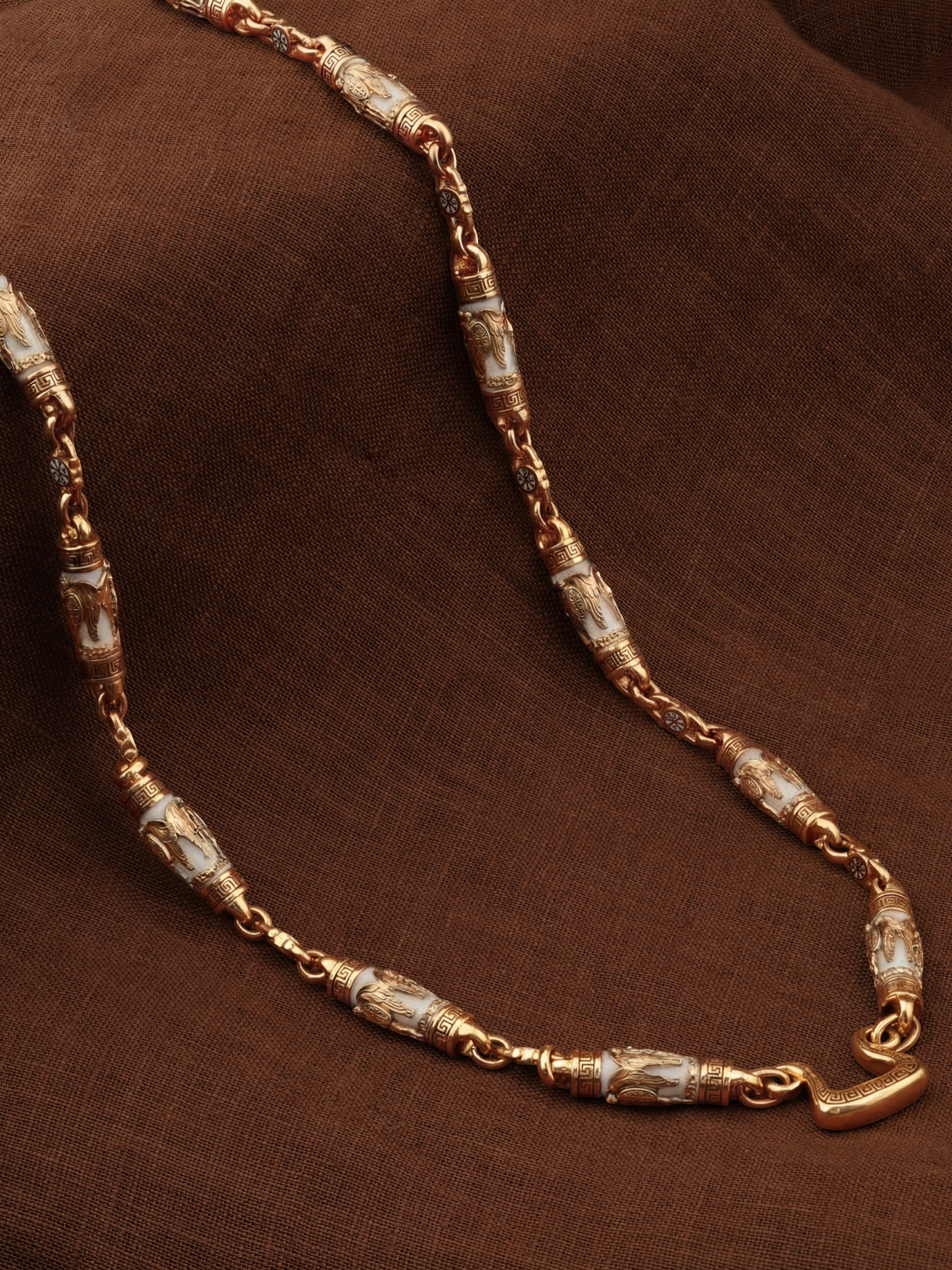На звеньях цепи изображена Хризма — монограмма имени Христа, которая состоит из двух начальных греческих букв имени — Х (хи) и Р (ро), скрещённых между собой. По краям монограммы помещены греческие буквы a и w. Такое употребление этих букв восходит к тексту Апокалипсиса: «Аз есмь Альфа и Омега, начало и конец, говорит Господь, Который есть и был и грядет, Вседержитель.» (Откр. 1:8; см. также Откр. 22:13). Также на звеньях изображен Святой Ангел-Хранитель в виде прекрасного юноши держащего в правой руке мечь, а в левой — щит. Ангел-Хранитель — это Ангел приставляемый Богом к человеку при крещении для охраны и помощи в добрых делах. Он невидимо находится при человеке на протяжении всей его жизни, если человек сохраняет в себе любовь к Богу и истинную веру перед Ним. Ангел-Xранитель делают для нас все, что служит к истинному нашему благу и спасению. Невидимо пребывая при нас постоянно, он, руководствуя нас ко спасению, не только по нашему желанию таинственно наставляет нас на все доброе и полезное, не только возносит наши молитвы к Богу, но еще и сам от себя охраняют и защищают нас от врагов видимых и невидимых и ходатайствует за нас пред Богом. Ангел-Хранитель так любит нас, как никто на земле любить не может. Одного лишь каждому из нас он желает — спасения души; к этому он направляет все свои заботы. И если видит нас также заботящимися о спасении, радуется, если же видит нас пребывающими в нерадении о душе своей, скорбит. Но и самый великий грешник может примириться со своим Ангелом-Хранителем посредством искреннего раскаяния в грехах и оставления их навсегда. В таком случае, по слову Писания, великая радость бывает для всех ангелов на небесах (Лк. 15:10). Цепь украшена орнаментом.