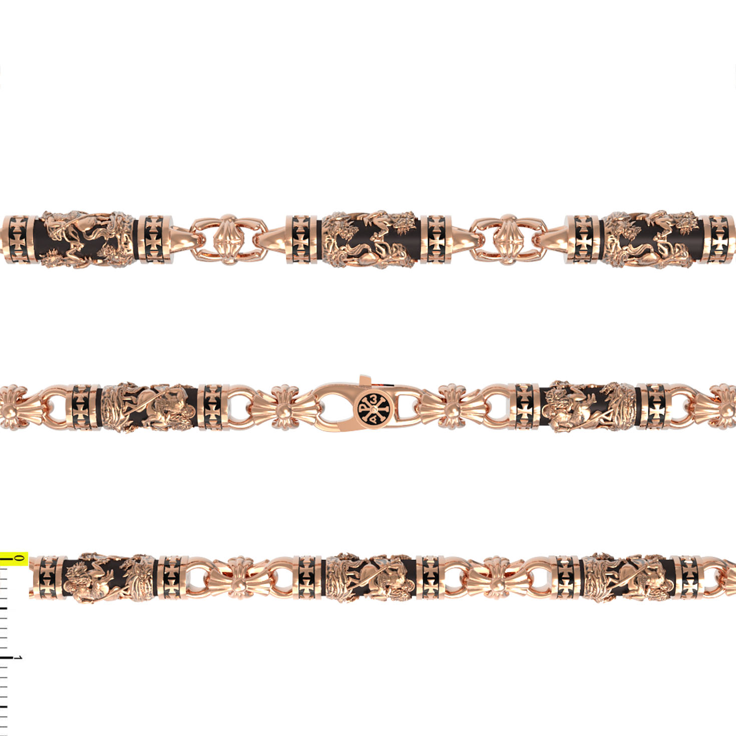 На звеньях цепи помещено изображение святого великомученика Георгия Победоносца — одного из самых почитаемых и удивительных святых. Георгий родился в Каппадокии (Малая Азия) в семье богатых и знатных горожан. Юношей поступил на службу к римскому императору Диоклетиану, за отличное знание военного дела и проявленную в боях и походах храбрость был приближен к императору и удостоен высокого воинского звания. Во время начавшихся гонений на христиан, перешел на сторону гонимых и, отвергнув человеческий страх, стал ярым проповедником учения Христа. Мучители подвергли опального воеводу жесточайшим восьмидневным пыткам и казнили его (обезглавили) в возрасте около тридцати лет в 303 году. На Руси он известен как Юрий или Егорий, заступник для верующих, чья жизнь имеет какое-либо отношение к военным делам, помощник в крестьянском труде. На цепи Георгий изображен как воитель, сидящий на вздыбленном коне и поражающий копьем огнедышащего змея. Змей символизирует собою сатанинские силы. Молитвами вознесенными к Всевышнему и своей непреклонной верой он смог одолеть чудовище. Святой убил змея, спас царскую дочь, принесенную в жертву, и жителей города, их души от влияния дьявола, породив в них надежду и веру в Господа, призывая людей принять христианскую веру.. На замке цепи изображена Хризма — монограмма имени Христа, которая состоит из двух начальных греческих букв имени — Х (хи) и Р (ро), скрещённых между собой. По краям монограммы помещены греческие буквы a и w. Такое употребление этих букв восходит к тексту Апокалипсиса: «Аз есмь Альфа и Омега, начало и конец, говорит Господь, Который есть и был и грядет, Вседержитель.» (Откр. 1:8; см. также Откр. 22:13).