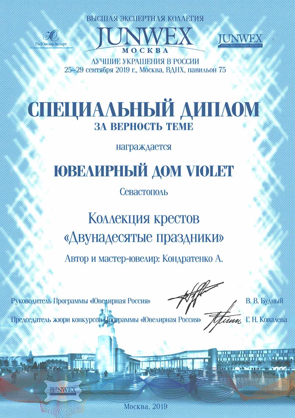 На оборотной стороне креста изображена икона «Преображение Господне». Иисус Христос вместе со своими учениками Петром, Яковом и Иоанном взошел на гору Фавор для молитвы. Пока Господь молился, ученики заснули, а проснувшись увидели, что Иисус преобразился — «лицо Его просияло, а одежды сделались ослепительно белыми». Рядом с Сыном Божьим они увидели ветхозаветных пророков — Моисея и Илию, которые беседовали с Ним о грядущих искупительных страданиях. Увидев такую картину, апостолов охватила неземная благодать, они захотели, чтобы это состояние продолжалось все время. А через некоторое время сверху сошло облако, которое скрыло Иисуса, Илию и Моисея от взора учеников и они услышали из облака Божий глас: « Сей есть Сын Мой возлюбленный, в Котором Мое благоволение. Его слушайте!» (Мф. 17,1−13). В страхе и почтении Петр, Иоанн и Иаков повалились на землю. Вскоре к ним подошел Иисус Христос в своей обычной одежде и сказал им, чтобы больше никто из людей, до Его Воскрешения, не знал о том, что произошло на этой горе. На кулонном кольце изображен парящий голубь — символ Святого Духа и Его благодати.