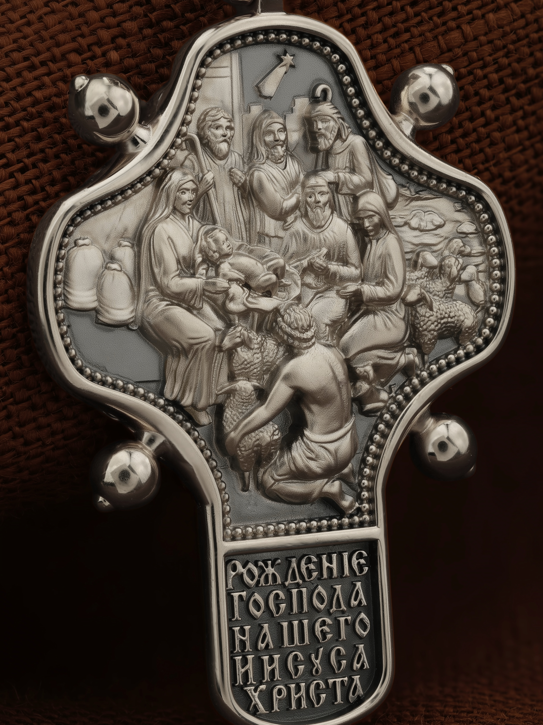 На оборотной стороне креста помещено изображение иконы «Рождество Христово». Господь Иисус Христос родился от Пресвятой Девы Марии в царствование императора Августа в городе Вифлееме. Как раз в это время Август повелел сделать всенародную перепись по всей своей империи, согласно которой каждый житель Палестины должен был идти в тот город, к которому испокон веков принадлежал его род. Пресвятая Богородица и праведный Иосиф, как происходившие от рода Давидова, должны были идти в Вифлеем (город Давида), чтобы внести свои имена в список подданных кесаря: «Пошел также и Иосиф из Галилеи, из города Назарета, в Иудею, в город Давидов, называемый Вифлеем, потому что он был из дома и рода Давидова, записаться с Мариею, обрученною ему женою, которая была беременна. Когда же они были там, наступило время родить Ей; и родила Сына своего Первенца, и спеленала Его, и положила Его в ясли, потому что не было им места в гостинице» (Лк.2:4−7).После рождения Спасителя на поле близ Вифлеема простым пастухам явились ангелы, благовествовавшие о пришествии в мир Христа песней славословия Господу: «Слава в вышних Богу, и на земли мир, в человецех благоволение!». Они повелели пастырям идти поклониться Младенцу. В это же время к Рожденному с дарами из дальних стран — златом, ливаном и смирной — пришли волхвы, которых к яслям Богомладенца привела воссиявшая в небе новая звезда. На кулонном кольце изображен Дух Святой в виде голубя сходящего с небес.