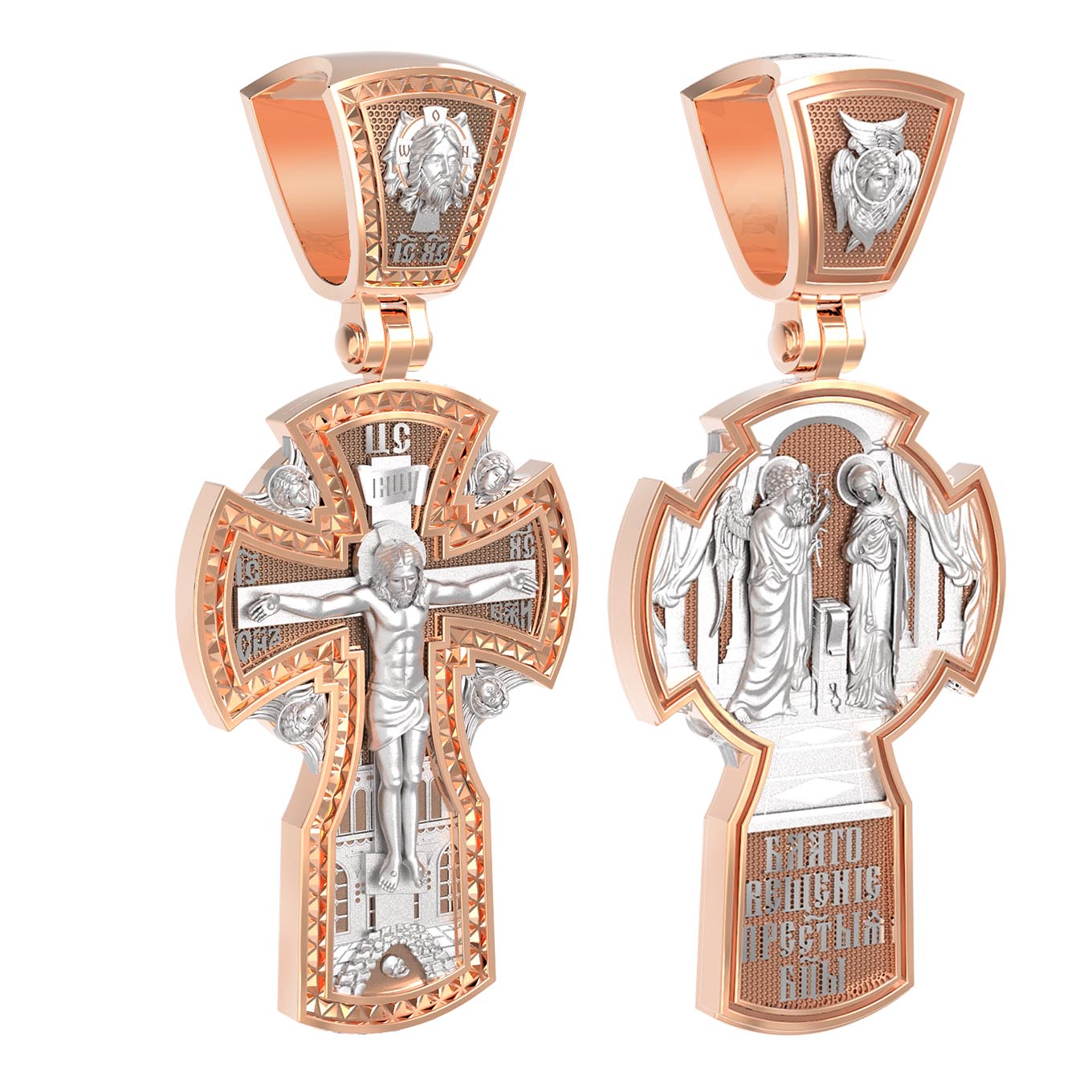 На оборотной стороне креста изображена икона «Благовещение Пресвятой Богородицы». Как нам повествует Священное Писание, Архангел Гавриил послан был от Бога в город Назарет к Пресвятой Деве Марии с радостной вестью, что Господь избрал Ее быть Матерью Спасителя мира. Ангел сказал: «Радуйся благодатная! Господь с Тобою! Благословенна Ты между женами». Мария cмутилась от слов Ангела и думала: что значит это приветствие? Ангел же продолжал говорить Ей: «не бойся, Мария, ибо Ты обрела благодать у Бога. И вот, Ты родишь Сына и наречешь имя Ему Иисус. Он будет велик, и назовется сыном Всевышнего, и Царству Его не будет конца…» На кулонном кольце изображен Ангел Серафим.