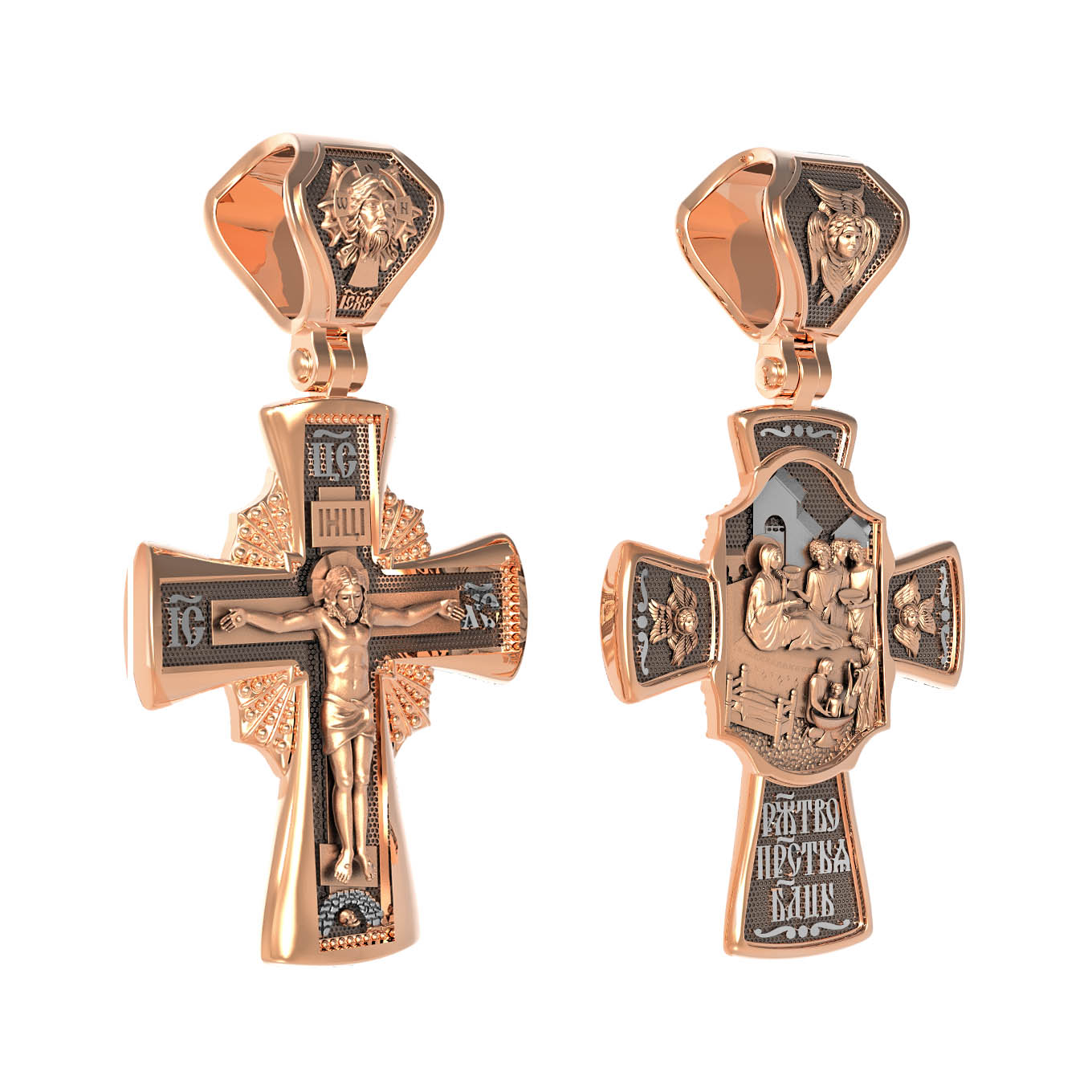 На лицевой стороне креста изображено Распятие Господа и Спасителя нашего Иисуса Христа, отдавшего Себя на смерть, для искупления грехов мира. Крест является символом жертвенной любви Всеблагого Бога к падшим людям, всепобеждающим духовным оружием христиан, основанием и средоточием церковной жизни. Господь сказал: кто хочет идти за Мною, отвергнись себя, и возьми крест свой, и следуй за Мною. (Мк. 8: 34). Над Распятием помещена надпись «Царь Славы». На верхней табличке, выше головы Иисуса, расположена надпись, составленная Понтием Пилатом — «IНЦI». Она означает «Иисус Назорей, Царь Иудейский». Надпись «IC» «ХC», означает Иисус Христос, помещается на разных сторонах поперечной перекладины креста. Возвышение, на котором стоит Крест, символизирует гору Голгофу, на которой произошло Распятие. Под подножием Креста изображена покоящаяся голова (череп) Адама. На кулонном кольце изображен Нерукотворный образ Господа и Спасителя нашего Иисуса Христа, чудесно отпечатавшийся на плате, которым Христос вытер свой лик. Ниже надпись — «IC» «ХC».