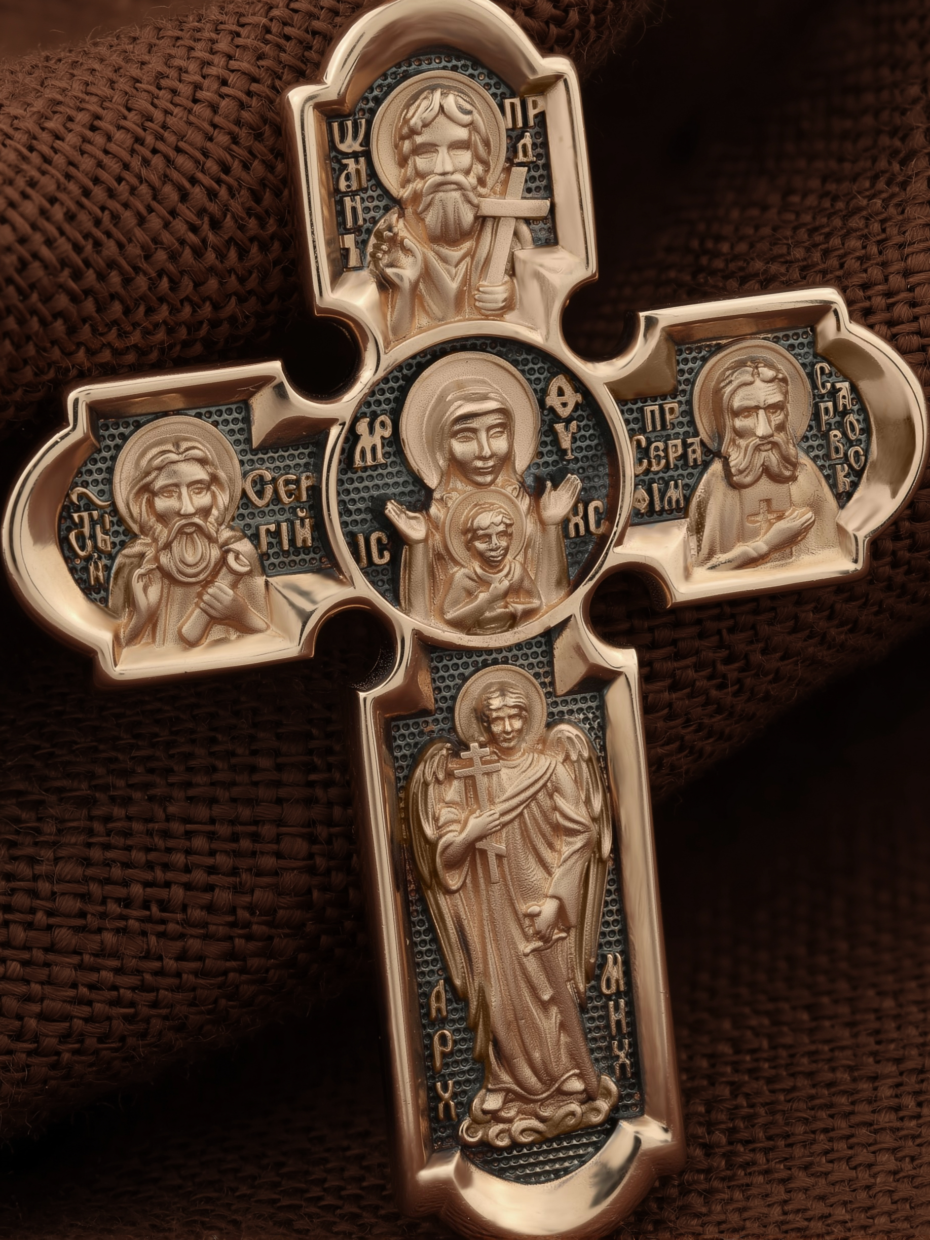 Центральную часть оборотной стороны креста украшает икона Божией Матери «Знамение». Иконы Божией Матери, известные под именем «Знамение», появились на Руси в XI — XII веках, а называться так стали после чудесного знамения от Новгородской иконы, случившегося в 1170 году. Многочисленные списки с иконы Знамения известны по всей России. На кресте внизу изображен Архангел Михаил, слева — Преподобный Сергий Радонежский, справа — Преподобный Серафим Саровский, вверху  — Предтеча Господень Иоанн Креститель. На кулонном кольце помещено изображение Спаса Нерукотворного — образ Спасителя, который Он запечатлел на плате и передал для исцеления больному проказой царю Эдессы. Ему придается победное и защитное значение.