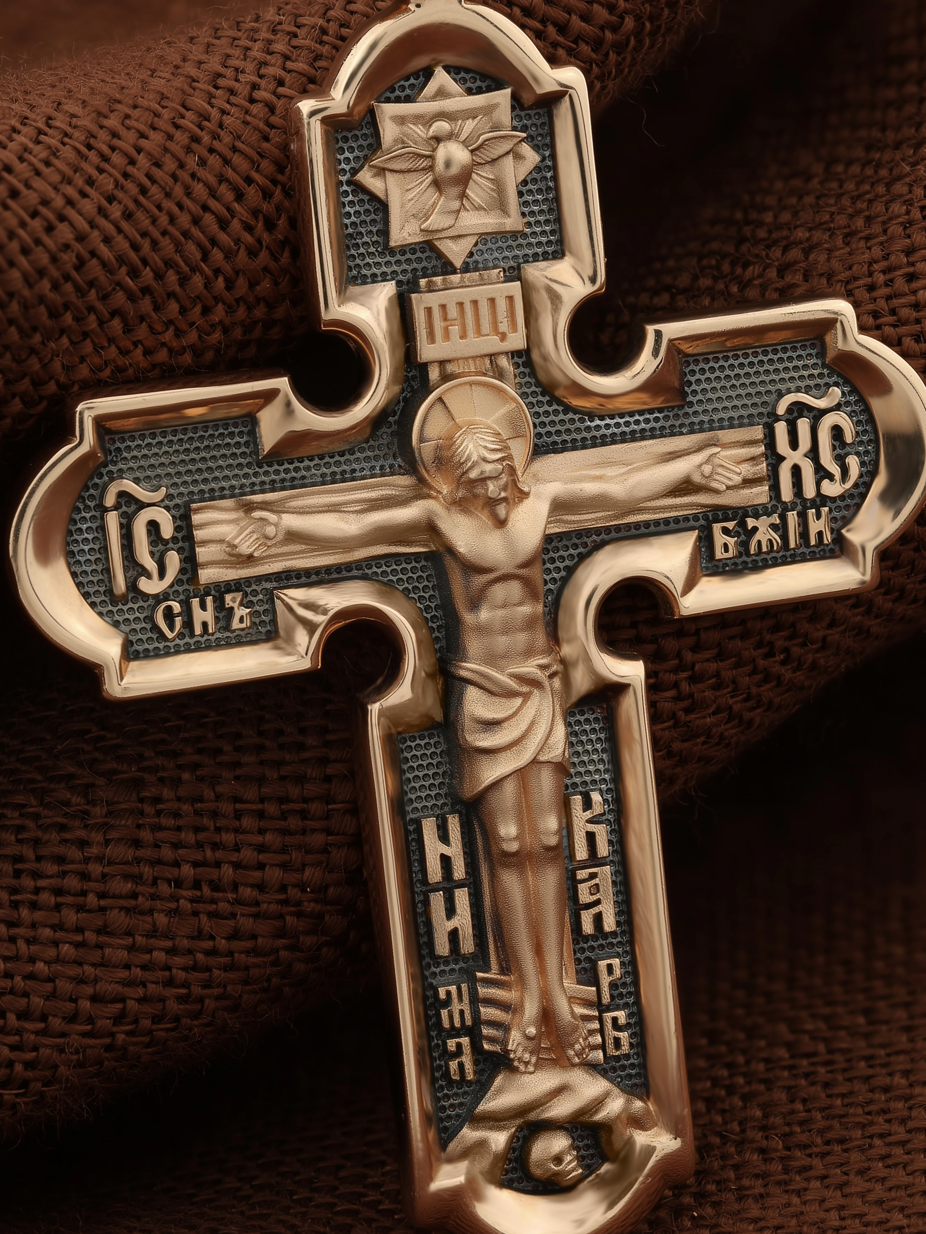 На лицевой стороне креста изображено Распятие Господа и Спасителя нашего Иисуса Христа. Христос, подвергнутый на кресте мучительной казни, своими страданиями искупил нас от древнего греха и даровал нам жизнь вечную. На верхней табличке, выше головы Иисуса, расположена надпись, составленная Понтием Пилатом — «IНЦI». Она означает «Иисус Назорей, Царь Иудейский». Надпись «IС» « ХС» означает Иисус Христос и словосочетание «СЫН БОЖИЙ», что означает божественную природу Иисуса Христа. В нижней части креста находятся надписи «НИКА» и «МЛРБ». В переводе с греческого, слово «НИКА» означает «победитель». Надпись «МЛРБ» — «место лобное рай бысть» — означает, что место лобное стало раем. Крест стоит на горе камней, символизирующих Голгофу. Под подножием Креста изображена покоящаяся голова (череп) Адама.