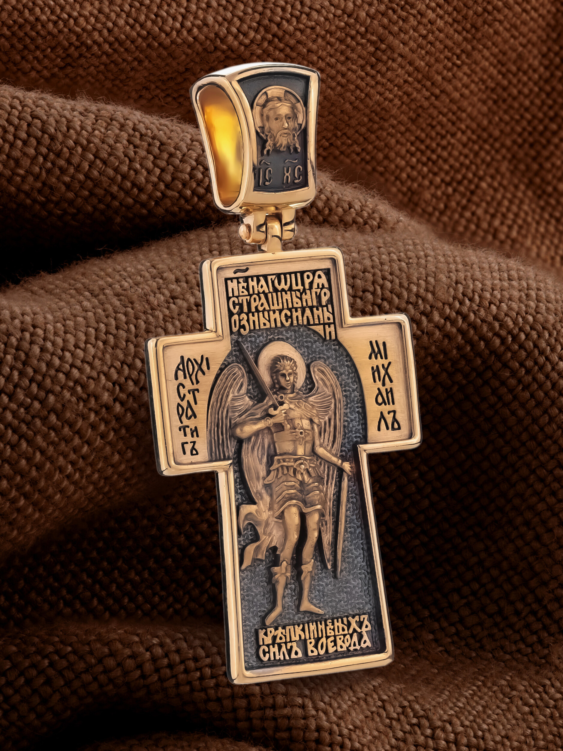 В центре оборота креста изображен Архистратиг Михаил. Могучий Архангел почитается как покровитель воинов и всех верных Богу и ведущих борьбу против сил зла, а также защитник душ умерших, страж райских врат. Вокруг его образа написаны слова: «Небесного царя страшный, грозный, сильный, крепкий небесных сил воевода Архистратиг Михаил».На кулонном кольце изображен Спас Нерукотворный — Символ вочеловечившегося Божества и шестикрылый Серафим — самый приближенный к Господу Ангел.