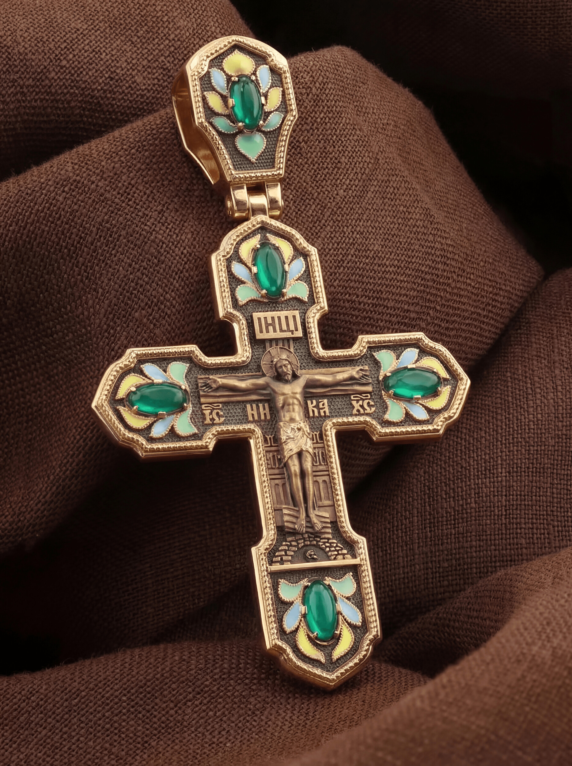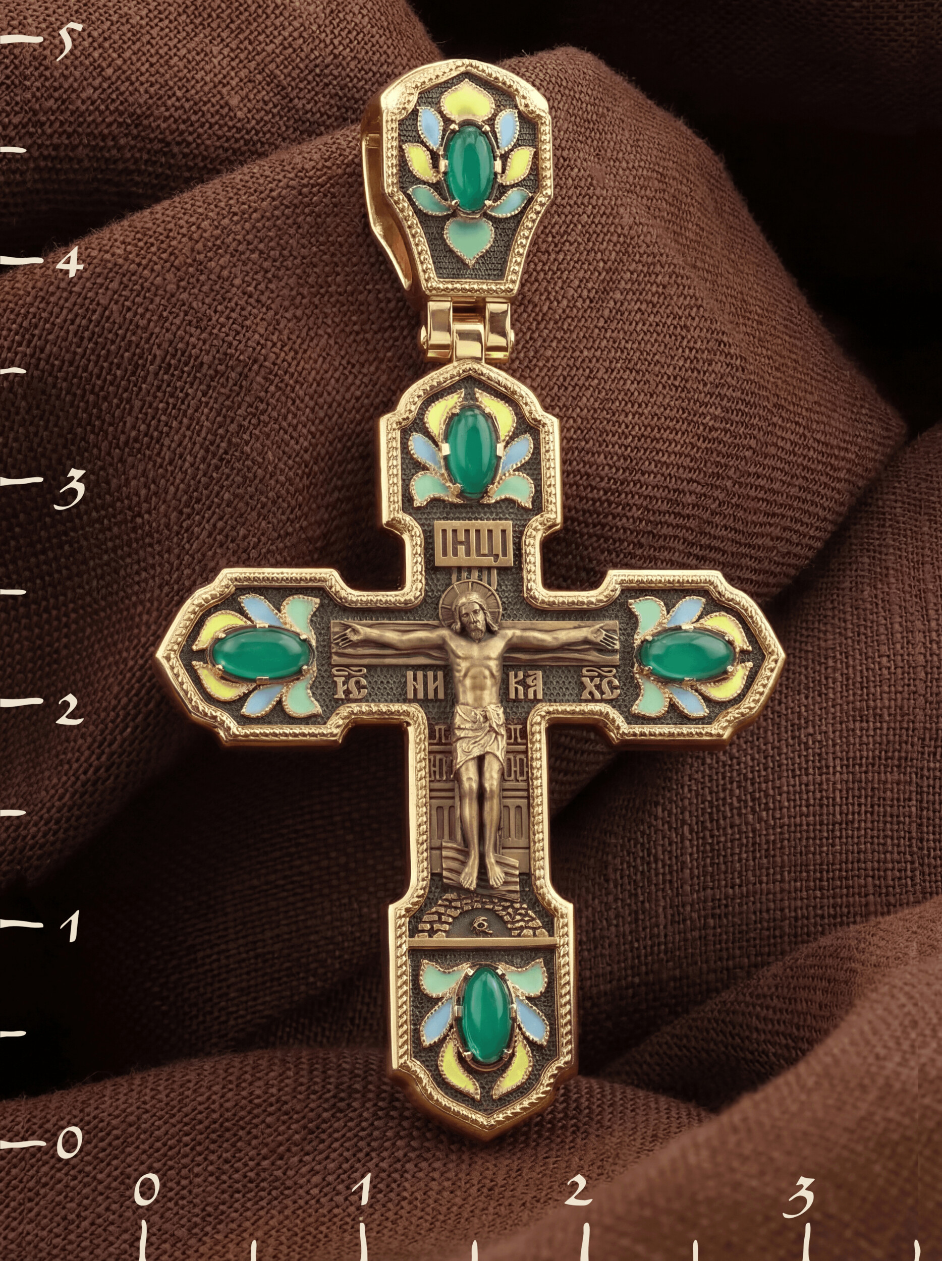 В верхней части Распятия у изголовья Иисуса Христа видна табличка с аббревиатурой «IНЦI» — «Иисус Назорей Царь Иудейский», которая, согласно Евангелию, была прибита к кресту после Его Распятия. Внизу, у подножия Господа, можно увидеть гору Голгофу с Главой Адамовой в пещере. Сам образ Распятия сопровождается каноническими надписями. Это святое имя Христа, которое принято писать на иконах сокращенно — «ИС ХС», словосочетание «СЫН БОЖИЙ», что означает божественную природу Иисуса Христа, и надпись «НИКА», обозначающая «победитель».