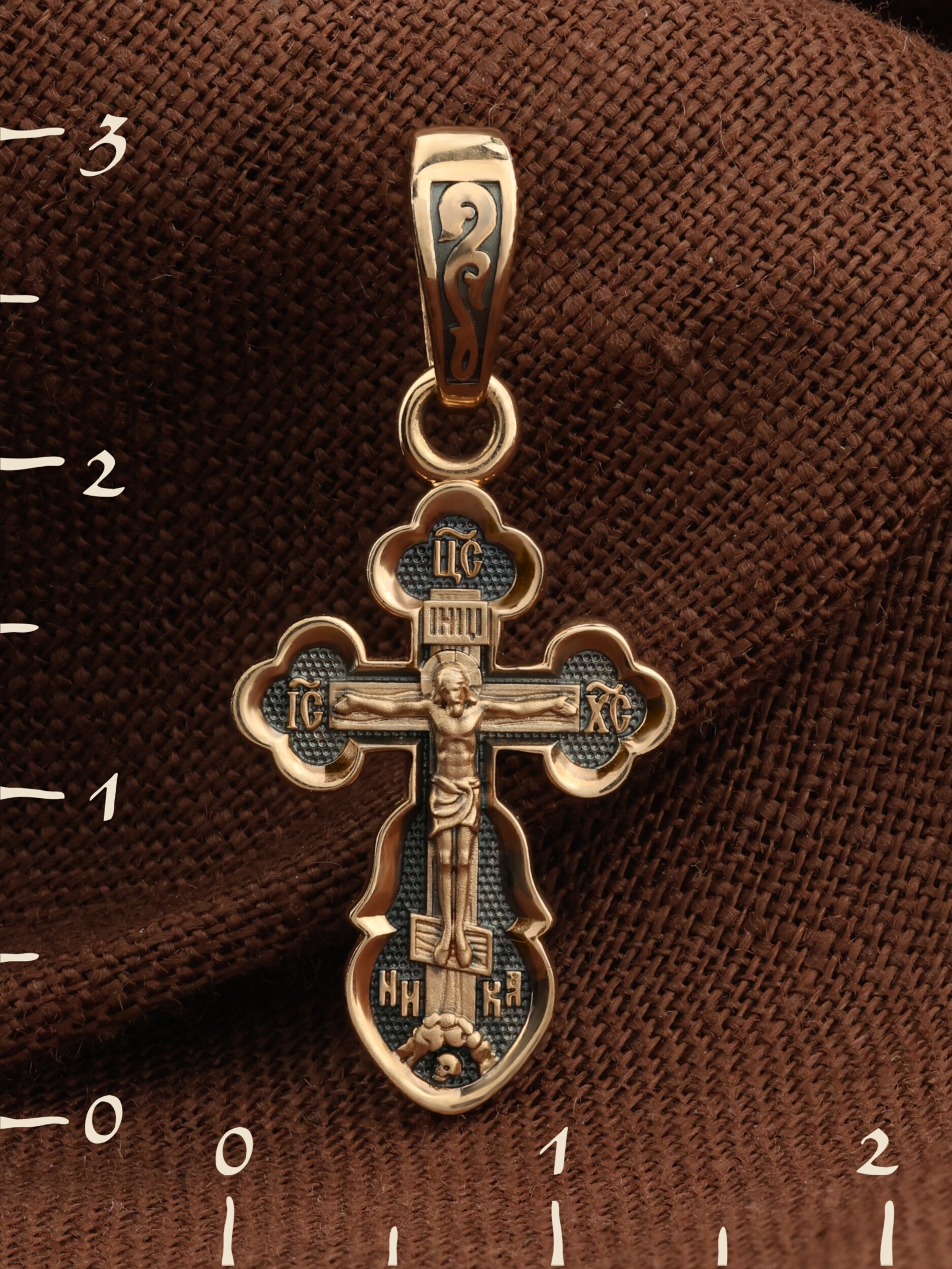 На лицевой стороне креста изображено Распятие Господа и Спасителя нашего Иисуса Христа, отдавшего Себя на смерть для искупления грехов мира. Крест является символом жертвенной любви Всеблагого Бога к падшим людям, всепобеждающим духовным оружием христиан, основанием и средоточием церковной жизни. Над вершиной Распятия помещена надпись «Царь Славы». На верхней перекладине расположена надпись «IНЦI». Она символизирует титло — табличку, на которой, согласно Евангелию, было начертано: Иисус Назорей, Царь Иудейский. Надпись «IC» «ХC»», означает Иисус Христос, помещаются на разных сторонах поперечной перекладины креста. Ниже помещена надпись «НИКА», что означает «победитель». Крест стоит на горе камней, символизирующих Голгофу. Под подножием Креста изображена покоящаяся голова (череп) Адама.