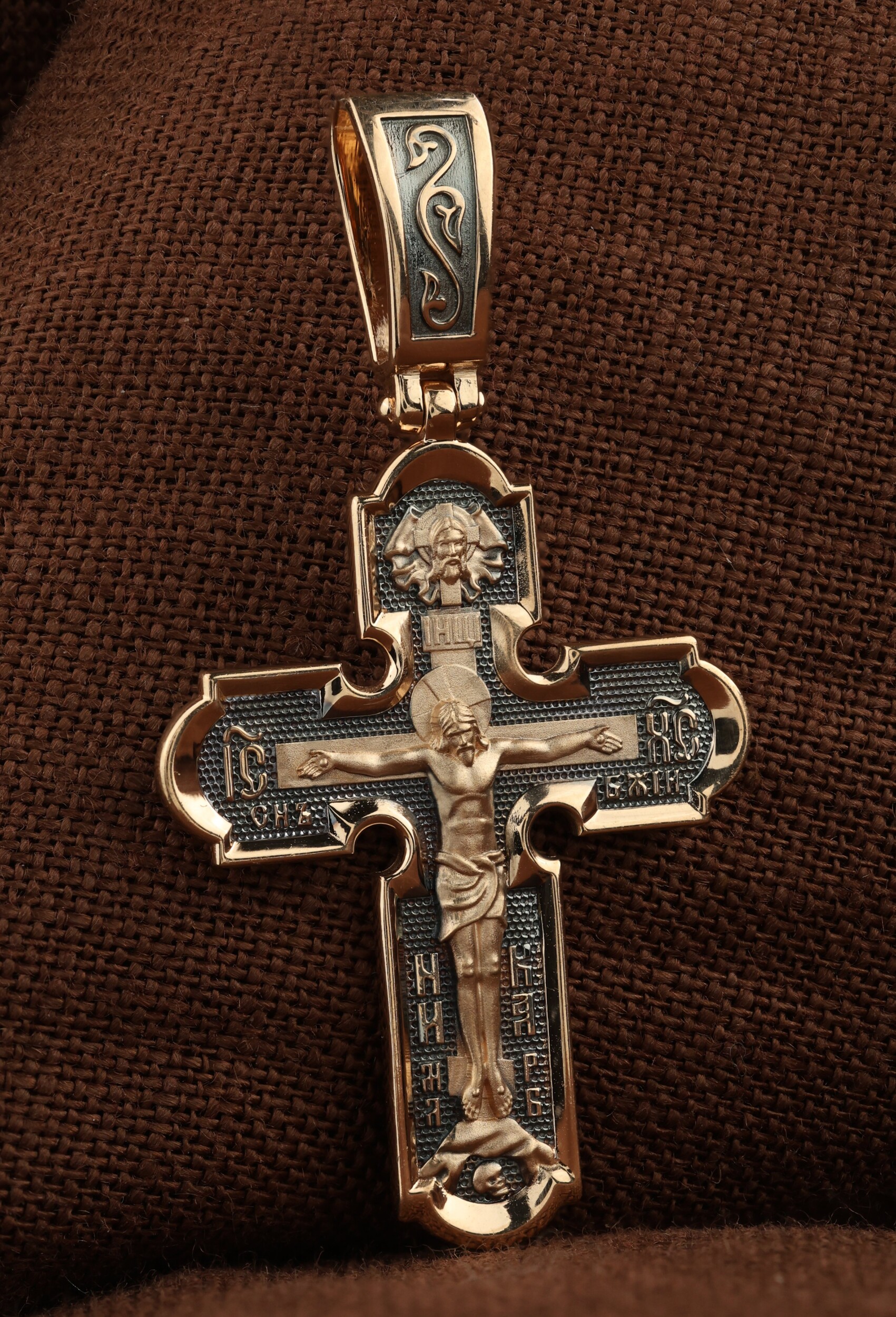 На лицевой стороне нательного креста по традиции изображено Распятие Господа нашего Иисуса Христа. Крест Господень стоит на небольшом каменистом возвышении, символизирующем гору Голгофу, которая обозначена буквами МЛРБ (Место Лобное Рай Бысть). Над головой Господа на поперечной перекладине написано «ИНЦИ», что символизирует табличку, которая была прибита к Кресту, с надписью «Иисус Назорей Царь Иудейский». Этим иудеи хотели посмеяться над Христом, не зная, что распинают истинного Царя всех царей. По сторонам основной перекладины расположены позолоченные рельефные инициалы Христа «ИС ХС». Под перекладиной, по сторонам древа, находится надпись «СЫН БОЖИЙ», а в основании креста — надпись «НИКА» (Победитель).