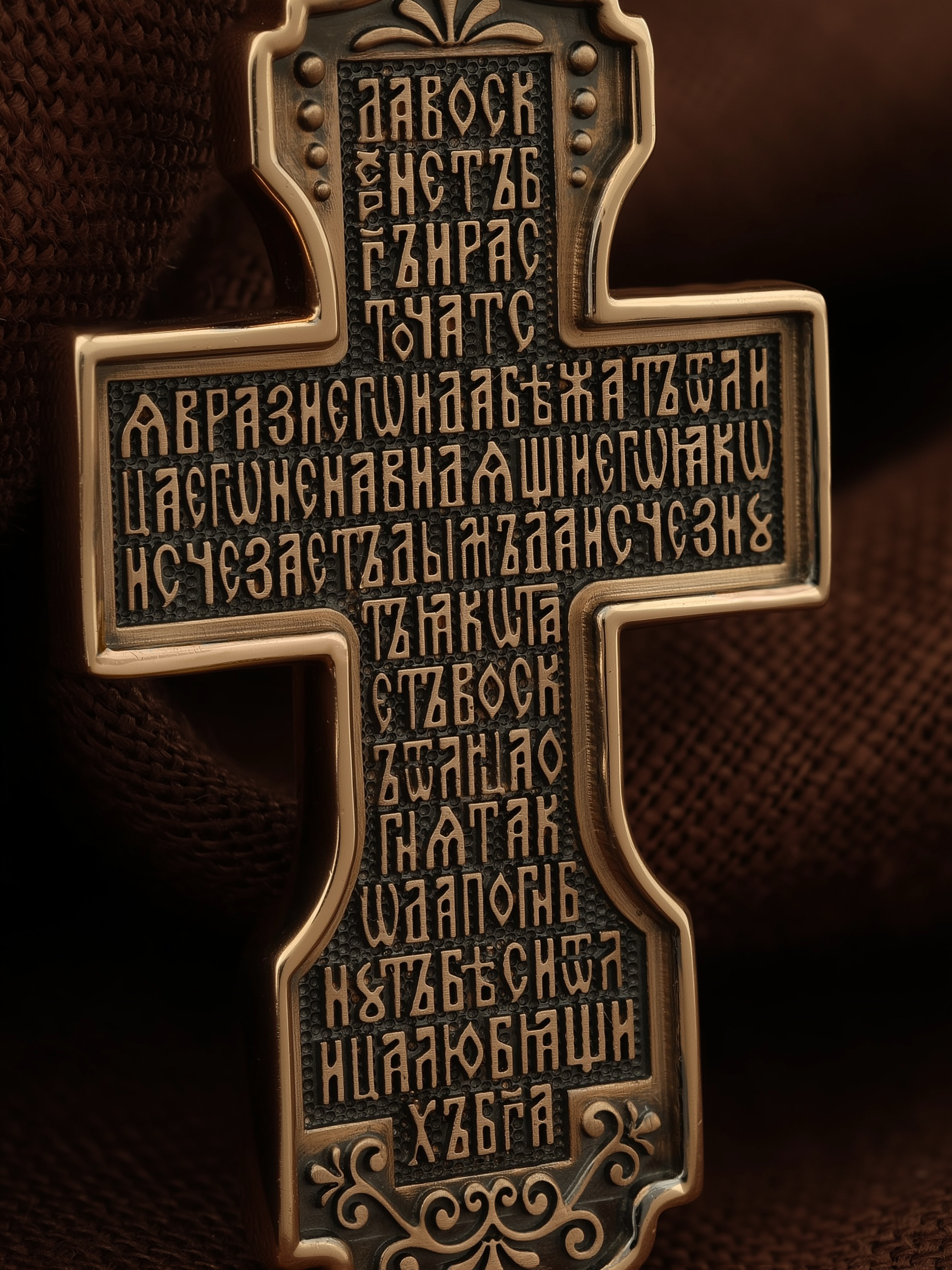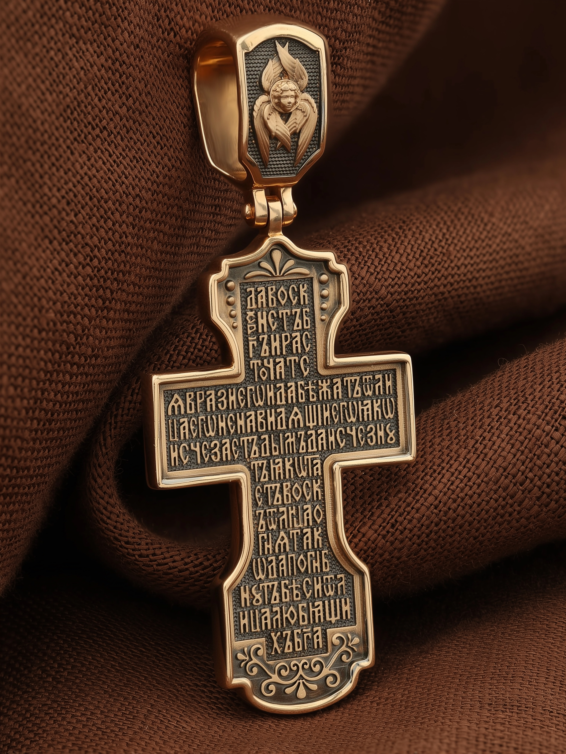 На оборотной стороне креста помещена молитва Честному Кресту Господню: «Да воскреснет Бог, и расточатся врази Его, и да бежат от лица Его ненавидящии Его. Яко исчезает дым, да исчезнут; яко тает воск от лица огня, тако да погибнут беси от лица любящих Бога…». На кулонном кольце изображен шестикрылый Серафим.