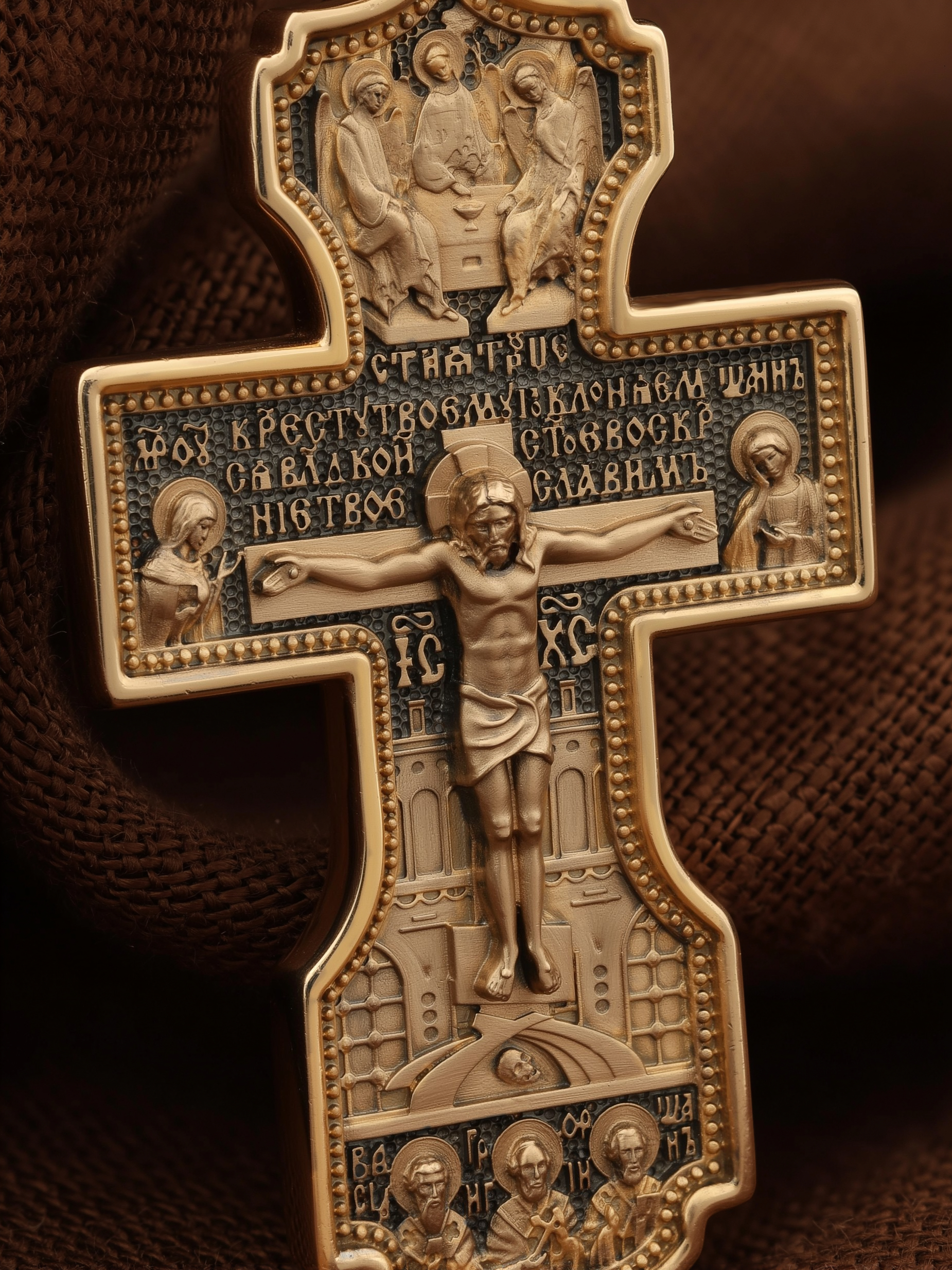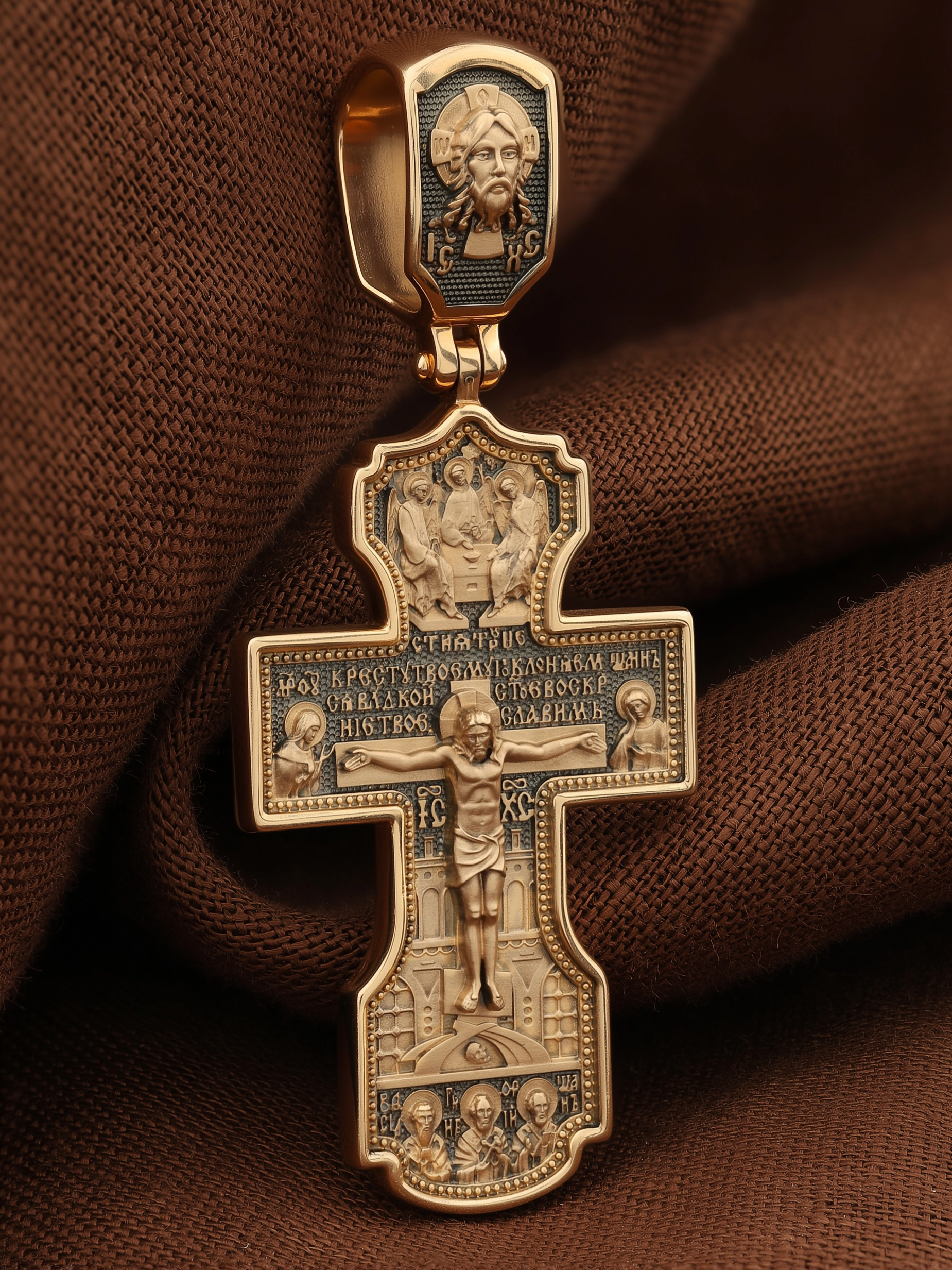 На лицевой стороне креста изображено Распятие Господа и Спасителя нашего Иисуса Христа, отдавшего Себя на смерть, для искупления грехов мира. Крест является символом жертвенной любви Всеблагого Бога к падшим людям, всепобеждающим духовным оружием христиан, основанием и средоточием церковной жизни. Господь сказал: «кто хочет идти за Мною, отвергнись себя, и возьми крест свой, и следуй за Мною». (Мк. 8: 34). Выше Распятия помещены слова молитвы:"Кресту Твоему поклоняемся, Владыко, и святое Воскресение Твое Славим». Над Распятием — образ Святой Троицы в виде трех ангелов. Надпись «IС» « ХС» означает Иисус Христос и находится ниже поперечной перекладины креста. Слева от Распятия изображена Пресвятая Богородица. Справа — апостол и евангелист Иоанн Богослов, один из ближайших учеников Иисуса Христа. За крестом высится Иерусалимская стена. Крест стоит на горе камней, символизирующих Голгофу. В ее основании различается череп — это голова Адама. Ниже распятия изображены отцы Церкви — Святители Василий Великий, Григорий Богослов и Иоанн Златоуст. На православном кресте Христос не умирает, а свободно простирает руки, ладони Иисуса открыты, будто он хочет обнять все человечество, даря им свою любовь и открывая путь к вечной жизни. На кулонном кольце изображен Нерукотворный образ Господа и Спасителя нашего Иисуса Христа, чудесно отпечатавшийся на плате, которым Христос вытер свой лик.