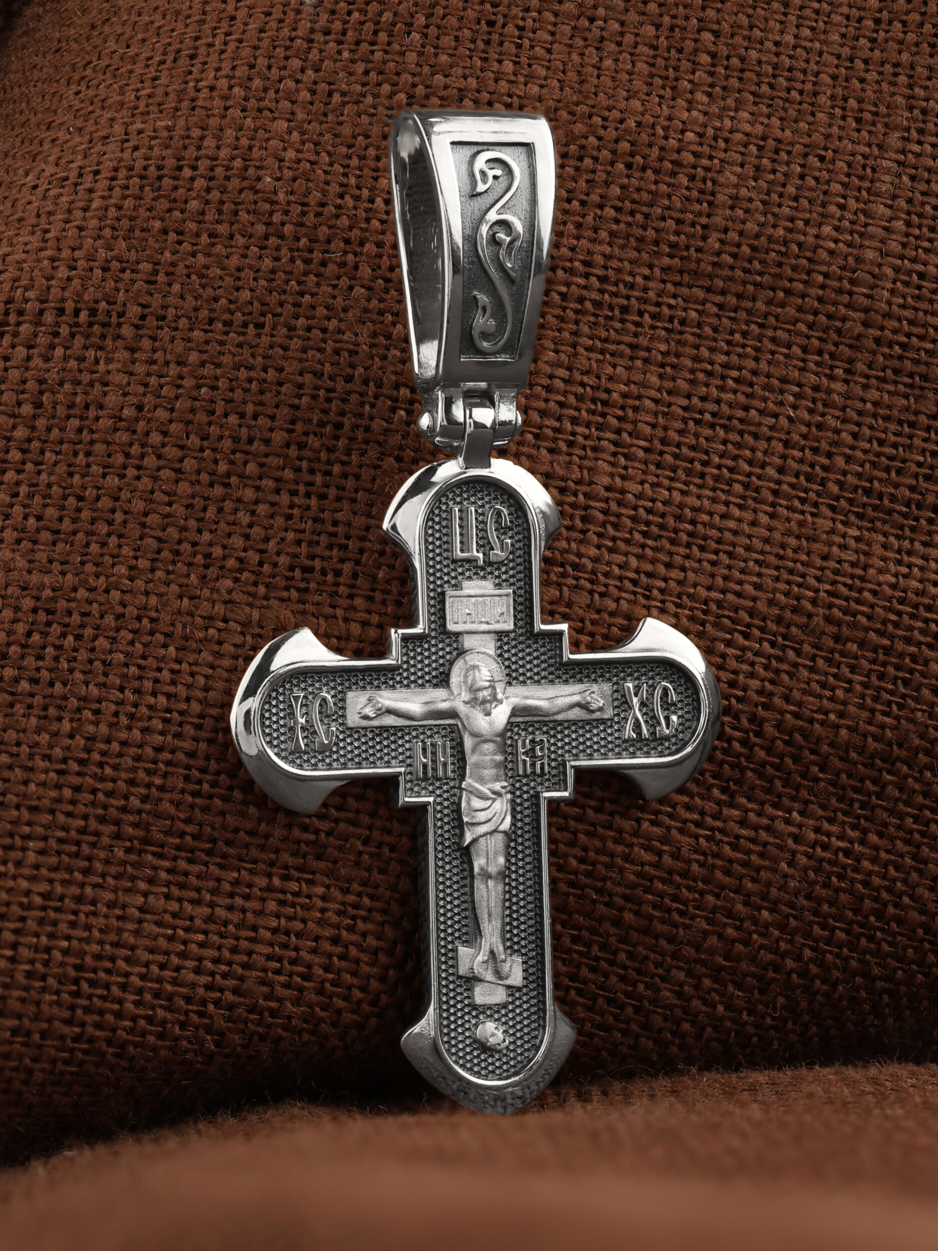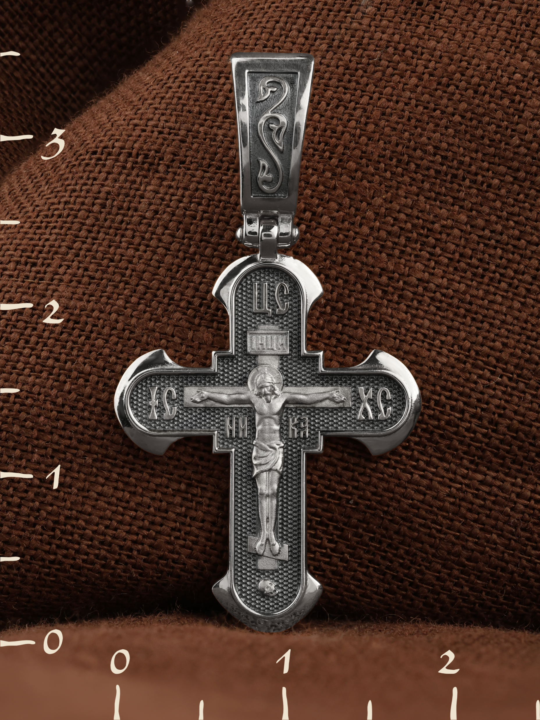На лицевой стороне креста изображено Распятие, потому что это орудие казни Иисус Христос сделал орудием победы над грехом и смертью. Своими страданиями Он искупил грехи человечества, умерев и сошествовав во ад, победил сатану, освободил души праведников от вечной смерти и открыл им небесные врата рая. Жертва Христа сделала возможным спасение для каждого человека. На православном кресте Христос не умирает, а свободно простирает руки, ладони Иисуса открыты, будто он хочет обнять все человечество, даря им свою любовь и открывая путь к вечной жизни. Над титлом видим слова «ЦРЬ СЛВЫ» — Царь Славы. Верхняя перекладина символизирует собой табличку с надписью «IHЦI» — Иисус Назарянин Царь Иудейский. Возле перекладины пишется сокращенно имя Спасителя «IC XC» — Иисус Христос, ниже добавляется «НИКА» (греч. — Победитель). Возвышение, на котором стоит Крест, символизирует гору Голгофу, на которой произошло Распятие. У подножия Креста изображают прах Адама, обозначенный черепом.