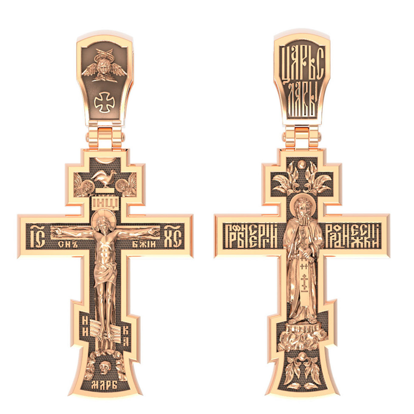 На лицевой стороне этого креста центральную часть занимает икона Распятия Христа — образ жертвы, принесенной Господом за грехи людей. Именно ко Христу, сошедшему на землю ради нашего спасения, возносятся все молитвы. Рядом с Его образом помещены слова — «НИКА» и «Сын Божий». Эти слова характеризуют Господа как Великого Архиерея, победителя смерти. Также Распятие сопровождается надписями, олицетворяющими Христа — это святое имя Христа «IC» (Иисус) «ХС» (Христос). На кулонном кольце написано «Царь Славы».