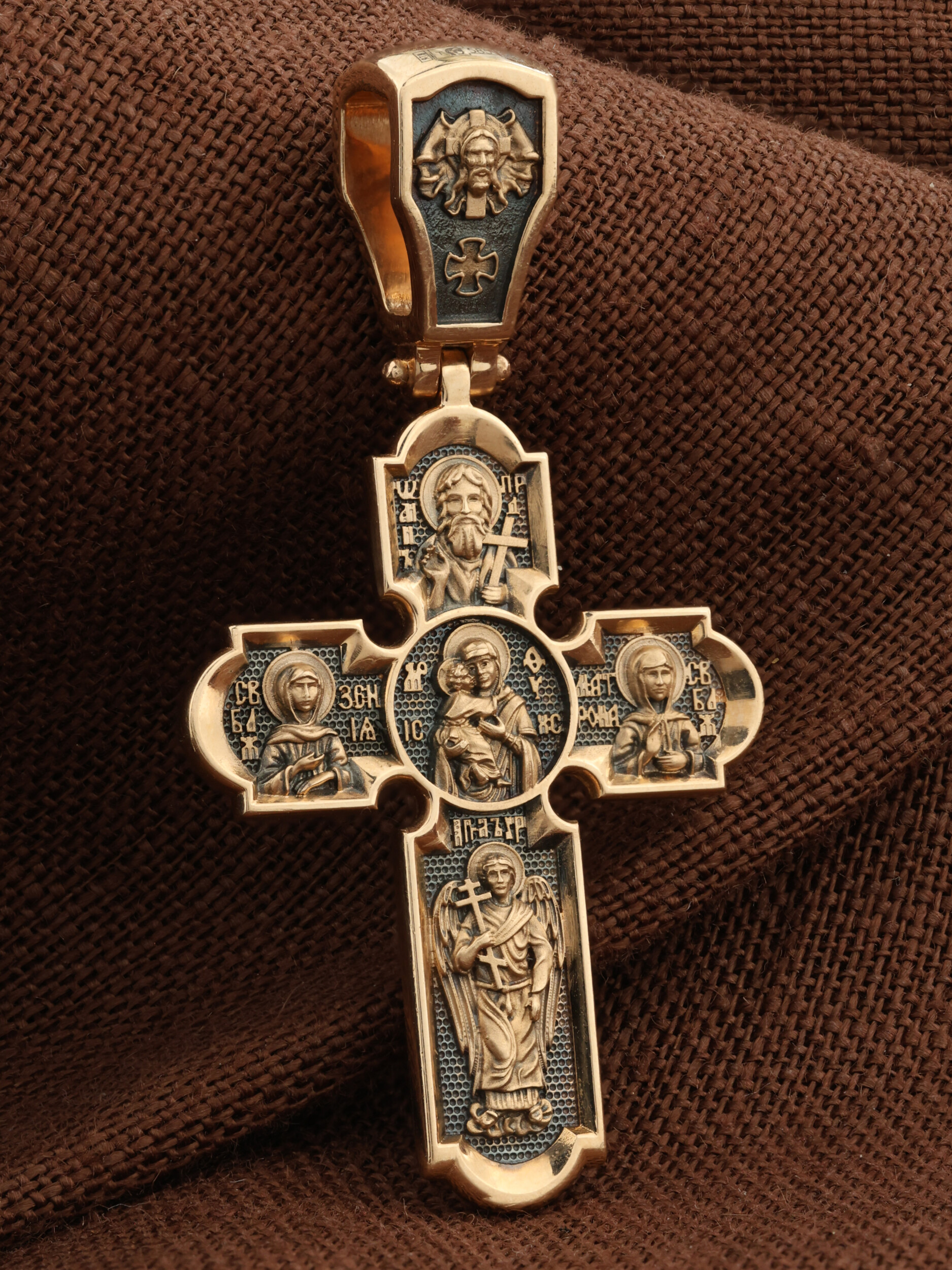 Центральную часть оборота креста украшает Владимирская икона Божией Матери. По преданию, она была написана на доске трапезного стола из дома Иисуса Христа. На Русь икона была привезена в начале XII века и с тех пор почитается как главная святыня нашего Отечества. Внизу изображен Архангел Михаил, слева — Святая Блаженная Ксения, справа — Святая Блаженная Матрона, вверху — пророк, почитающийся в христианстве, Предтеча Господень Иоанн Креститель. На кулонном кольце изображен Спас Нерукотворный — Символ вочеловечившегося Божества.