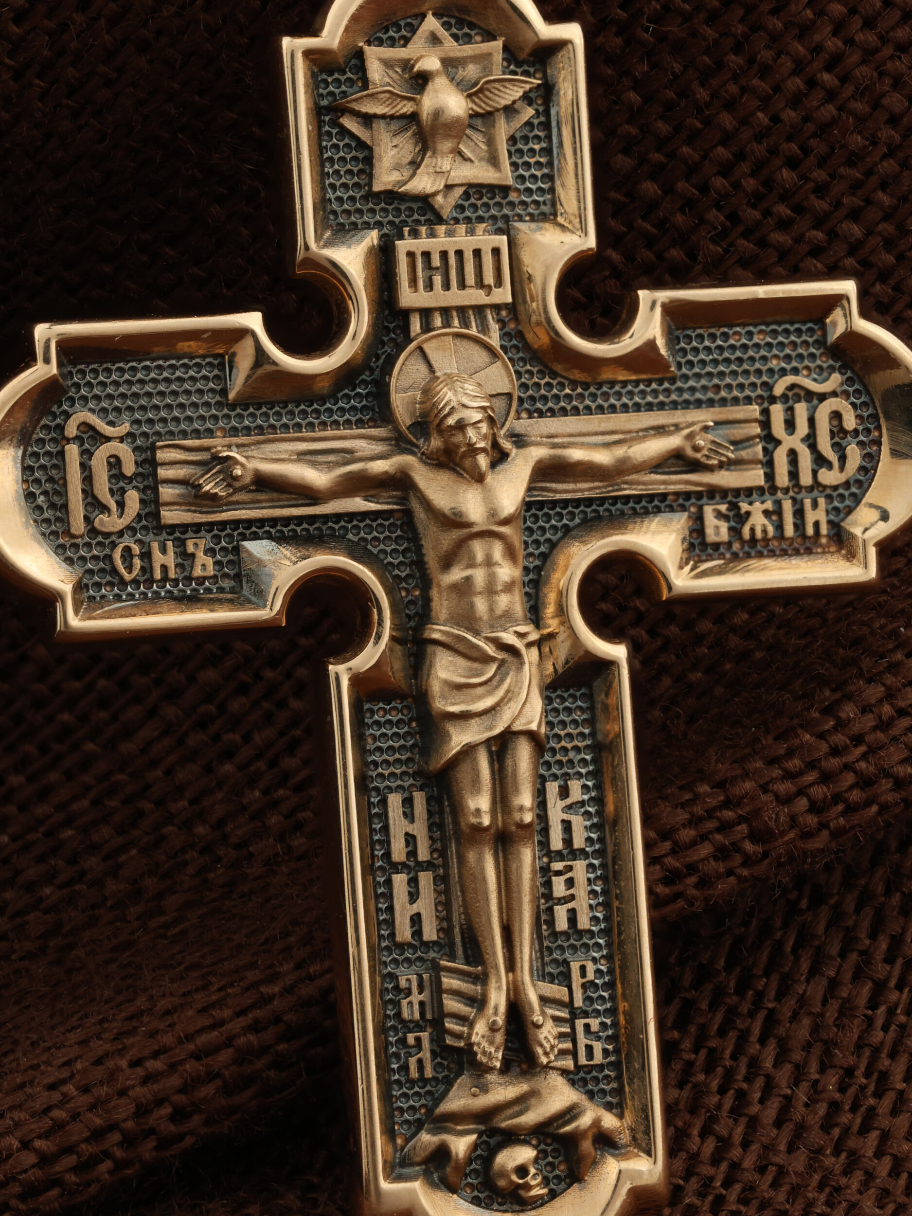 На лицевой стороне креста изображено Распятие Иисуса Христа. Господь представлен свободно покоящимся на кресте с простертыми руками и как бы обнимающим всю Вселенную. Верхняя перекладина символизирует титло — табличку, на которой, согласно Евангелию, было начертано: Иисус Назорей Царь Иудейский (IНЦI). Также Распятие сопровождается надписями, олицетворяющими Христа: святое имя Христа «IC» (Иисус) «ХС» (Христос), и словосочетание «СНЪ БЖIЙ» — СЫН БОЖИЙ. Рядом с образом Христа помещены слова — «НИКА» (греч. — Победитель) и четыре буквы «МЛ» «РБ» — Место Лобное Рай Бысть. Возвышение, на котором стоит Крест, символизирует гору Голгофу, на которой произошло Распятие. У подножия Креста изображают прах Адама, обозначенный черепом. На кулонном кольце изображен шестикрылый Серафим — самый приближенный к Господу Ангел.