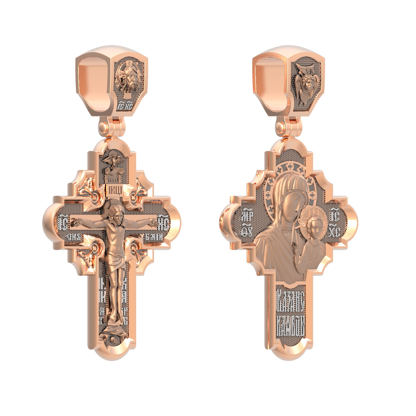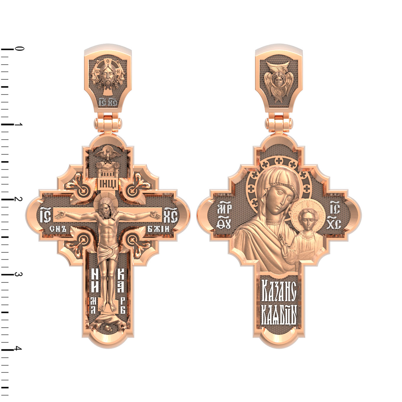 На оборотной стороне креста изображена Казанская икона Божией Матери. Пресвятая Богородица — милосердная заступница, просительница за нас перед Богом. Она стала воистину нашей Матушкой, охраняющей и поддерживающей нас от рождения до самой смерти, а Ее благодатная помощь изливается на нас по молитвам у ее чудотворных икон. Казанская икона явилась в 1579 году в Казани, вскоре после взятия Казанского царства у татар Иоанном Грозным. Этот образ Богородицы не раз сопровождал русский народ в бедствиях. Икона Божией Матери Казанская вдохновляла русских ратников в период Смутного времени при освобождении Москвы от поляков. Перед Казанской иконой в 1709 году, накануне Полтавской победы, император Петр I молился о даровании победы русскому войску. В 1812 году накануне отъезда в действующую армию перед чудотворной иконой Божией Матери молился князь Михаил Кутузов. Не только государственным мужам и дружинам указывала путь икона — по доброй традиции именно этой иконой благословляют на брак молодых родители, длинным списком чудес сопровождается этот образ Богоматери — один из самых любимых на Руси. Существует множество древних списков с этой удивительной иконы.
