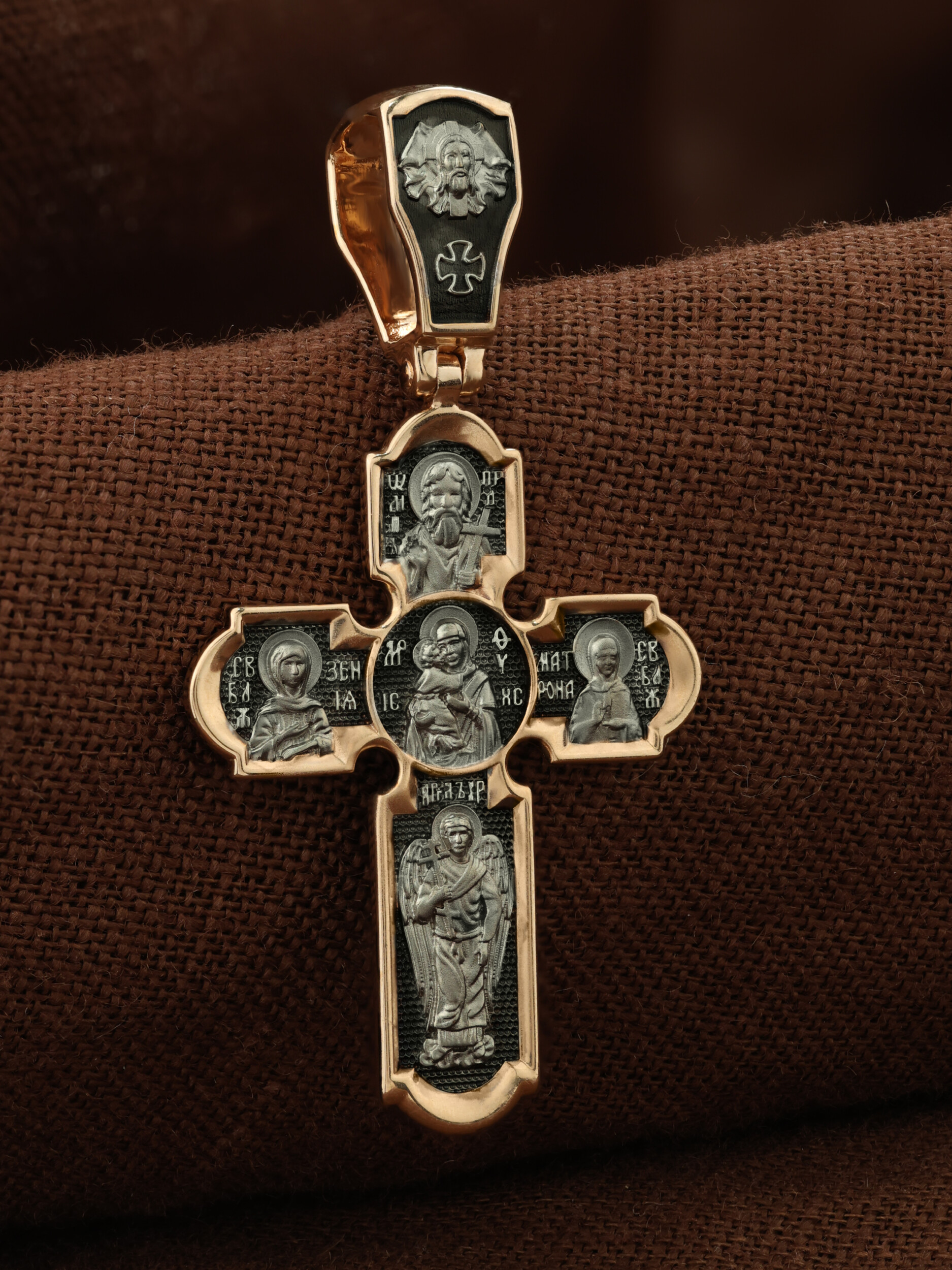Центральную часть оборота креста украшает Владимирская икона Божией Матери. По преданию, она была написана на доске трапезного стола из дома Иисуса Христа. На Русь икона была привезена в начале XII века и с тех пор почитается как главная святыня нашего Отечества. Внизу изображен Архангел Михаил, слева — Святая Блаженная Ксения, справа — Святая Блаженная Матрона, вверху — пророк, почитающийся в христианстве, Предтеча Господень Иоанн Креститель. На кулонном кольце изображен Спас Нерукотворный — Символ вочеловечившегося Божества.