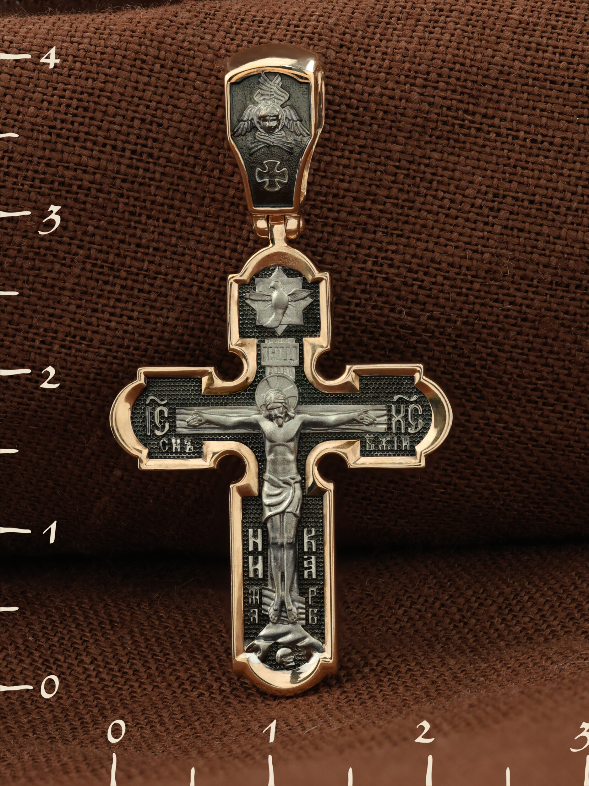 На лицевой стороне креста изображено Распятие Иисуса Христа. Господь представлен свободно покоящимся на кресте с простертыми руками и как бы обнимающим всю Вселенную. Верхняя перекладина символизирует титло — табличку, на которой, согласно Евангелию, было начертано: Иисус Назорей Царь Иудейский (IНЦI). Также Распятие сопровождается надписями, олицетворяющими Христа: святое имя Христа «IC» (Иисус) «ХС» (Христос), и словосочетание «СНЪ БЖIЙ» — СЫН БОЖИЙ. Рядом с образом Христа помещены слова — «НИКА» (греч. — Победитель) и четыре буквы «МЛ» «РБ» — Место Лобное Рай Бысть. Возвышение, на котором стоит Крест, символизирует гору Голгофу, на которой произошло Распятие. У подножия Креста изображают прах Адама, обозначенный черепом. На кулонном кольце изображен шестикрылый Серафим — самый приближенный к Господу Ангел.