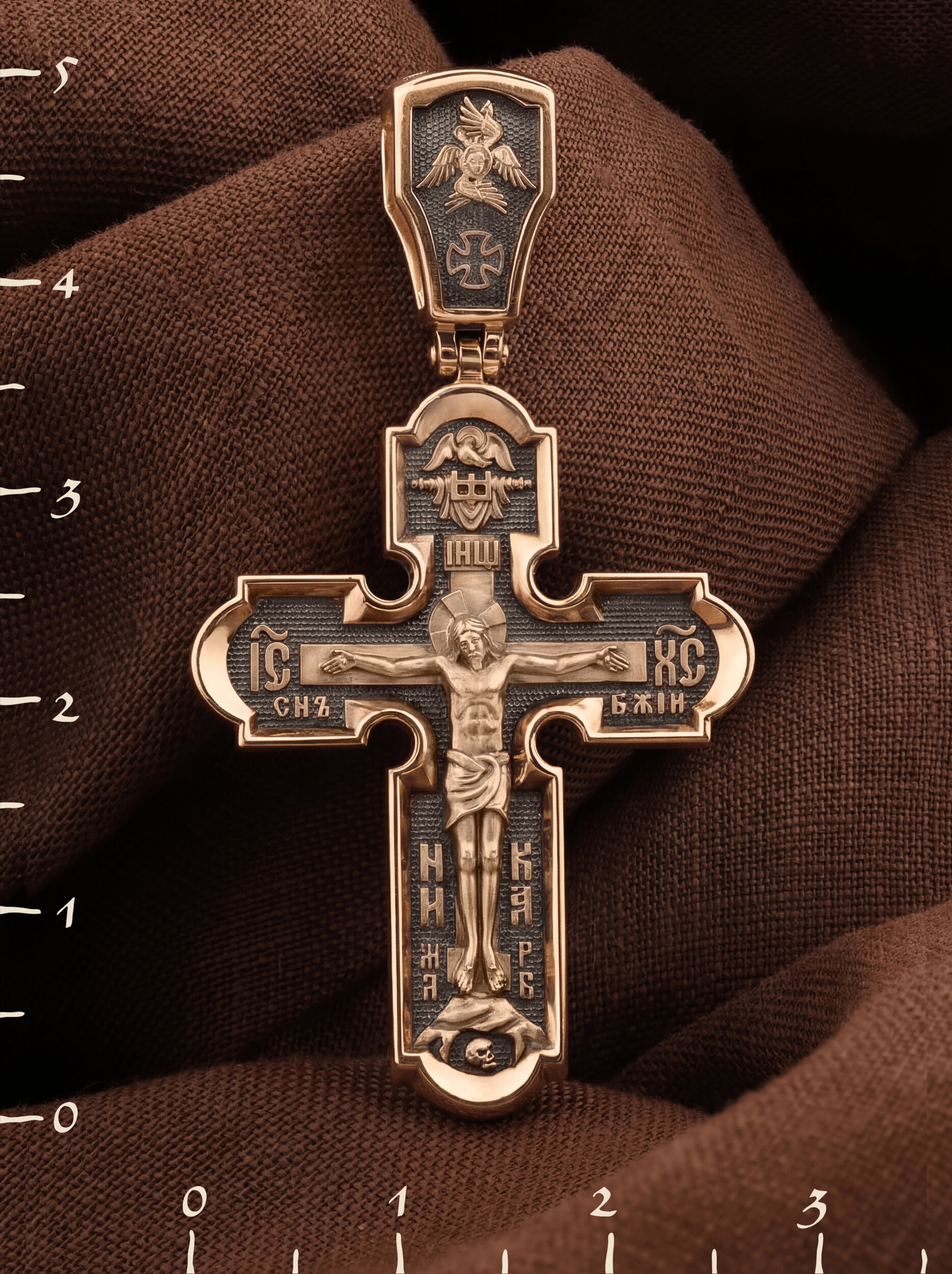 На лицевой стороне креста изображено Распятие Господа и Спасителя нашего Иисуса Христа. Христос, подвергнутый на кресте мучительной казни, своими страданиями искупил нас от древнего греха и даровал нам жизнь вечную. Без Распятия не было бы Воскресения Христова, и поэтому Крест из орудия казни обратился в святыню, в которой действует Благодать Божия. Над Распятием изображен Дух Святой в виде голубя, сходящего с Небес. Распятие сопровождается каноническими надписями. На верхней табличке, выше головы Иисуса, расположена надпись, составленная Понтием Пилатом на трех языках — «IНЦI». Она означает «Иисус Назорей, Царь Иудейский». Надпись «IС ХС» означает Иисус Христос и помещается на разных сторонах поперечной (большой) перекладины креста. Ниже — словосочетание «СЫН БОЖИЙ», что означает божественную природу Иисуса Христа. Крест стоит на горе камней, символизирующих Голгофу. В ее основании различается череп — это голова Адама. Надписи «Ника», что означает Победитель, и надпись «МЛРБ» — «место лобное рай бысть», что означает место лобное стало раем, размещены в нижней части креста. На кулонном кольце изображен шестикрылый Серафим.