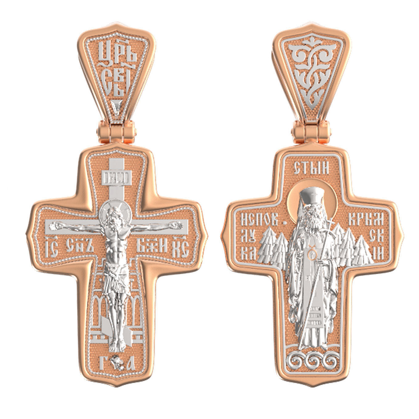 На оборотной стороне Креста помещен образ святителя Луки (Войно-Ясенецкого), архиепископа Симферопольского и Крымского, исповедника (1877–1961). Архиепископ Лука — русский святитель, исповедник, духовный писатель, доктор богословия, а также выдающийся ученый, автор трудов по анестезиологии, профессор хирургии, доктор медицинских наук, лауреат Сталинской премии. Он исповедовал веру Христову в гонениях, тюрьмах, лагерях и ссылке, пережил поношения и пытки, но остался верен Господу. Привел к православной вере тысячи и тысячи людей. Его почитание растет во всем православном мире. Неисчислимо количество свидетельств о чудесной помощи по молитвам к Святителю Луке. Архиепископ Лука советовал: «Главное в жизни — всегда делать людям добро. Если не можешь делать для людей добро большое, постарайся совершить хотя бы малое».