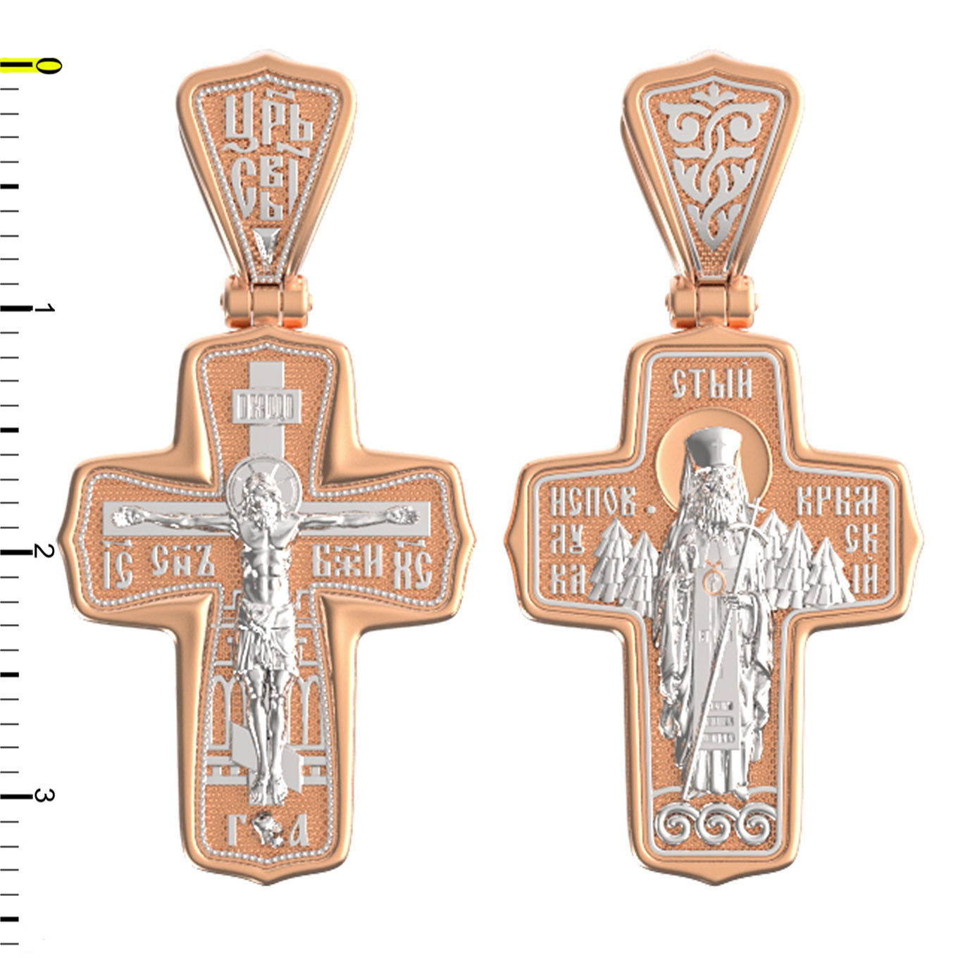 На лицевой стороне креста изображено Распятие Господа и Спасителя нашего Иисуса Христа. Крест- символ спасения и искупления рода человеческого, знамение победы над смертью и адом. Он стал символом восстания из мертвых и обретения вечной жизни в Царствии Иисуса Христа, величайшим символом силы и власти Христовой. Иисус Христос, как искупительная жертва освобождения человечества от власти греха, умер крестной смертью и в третий день воскрес. На верхней табличке, выше головы Иисуса, расположена надпись, составленная Понтием Пилатом — «IНЦI». Она означает «Иисус Назорей, Царь Иудейский». На кулонном кольце помещена надпись «Царь Славы». Надпись «IС» « ХС» означает Иисус Христос и помещается на разных сторонах поперечной перекладины креста. Рядом расположена надпись «Сын Божий». За крестом высится Иерусалимская стена. Ниже подножия креста различается череп и надпись «Г.А» — это глава Адамова. На православном кресте Христос не умирает, а свободно простирает руки, ладони Иисуса открыты, будто он хочет обнять все человечество, даря им свою любовь и открывая путь к вечной жизни.