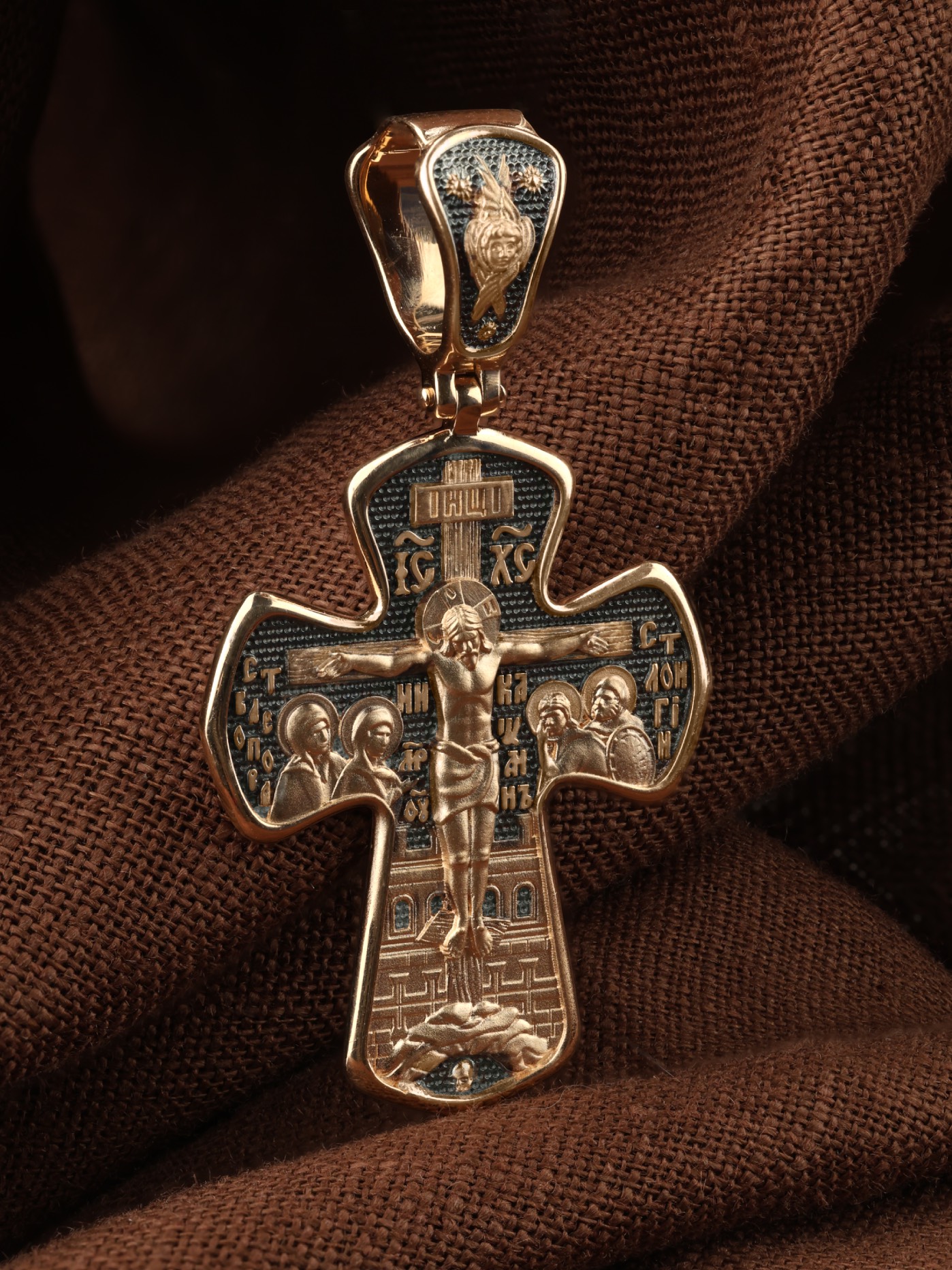 На лицевой стороне креста изображено Распятие Господа и Спасителя нашего Иисуса Христа, отдавшего Себя на смерть, для искупления грехов мира. Господь сказал: кто хочет идти за Мною, отвергнись себя, и возьми крест свой, и следуй за Мною. (Мк. 8: 34). Крест является символом жертвенной любви всеблагого Бога к падшим людям, всепобеждающим духовным оружием христиан, основанием и средоточием церковной жизни. На верхней перекладине помещена надпись «IС» « ХС», что означает Иисус Христос. Ниже — слово «НИКА», что означает «победитель». Слева от Распятия изображена Пресвятая Богородица, справа — апостол и евангелист Иоанн Богослов, один из ближайших учеников Иисуса Христа. За Распятием высится Иерусалимская стена, в знак того, что Господь был распят вне стен города. Возвышение, на котором стоит Крест, символизирует гору Голгофу, на которой произошло Распятие. Под подножием Креста изображена покоящаяся голова (череп) Адама. На кулонном кольце помещен крест.