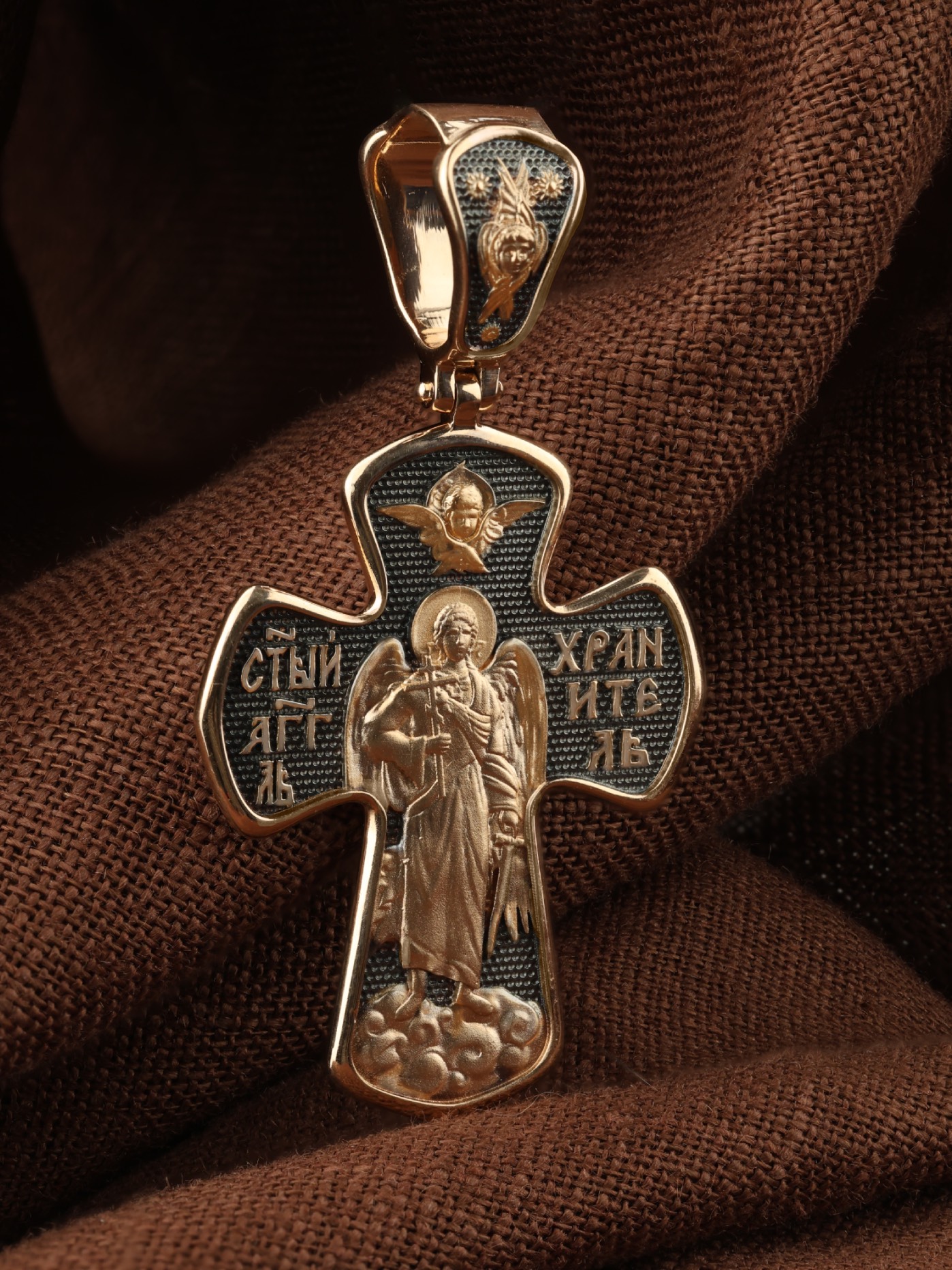 На оборотной стороне креста изображен Святой Ангел-Хранитель держащего в правой руке крест, а в левой — мечь. Ангел-Хранитель — это Ангел приставляемый Богом к человеку при крещении для охраны и помощи в добрых делах. Он невидимо находится при человеке на протяжении всей его жизни, если человек сохраняет в себе любовь к Богу и истинную веру перед Ним. Ангел-Xранитель делают для нас все, что служит к истинному нашему благу и спасению. Невидимо пребывая при нас постоянно, он, руководствуя нас ко спасению, не только по нашему желанию таинственно наставляет нас на все доброе и полезное, не только возносит наши молитвы к Богу, но еще и сам от себя охраняют и защищают нас от врагов видимых и невидимых и ходатайствует за нас пред Богом. Одного лишь каждому из нас он желает — спасения души; к этому он направляет все свои заботы. Над образом помещен Серафим.