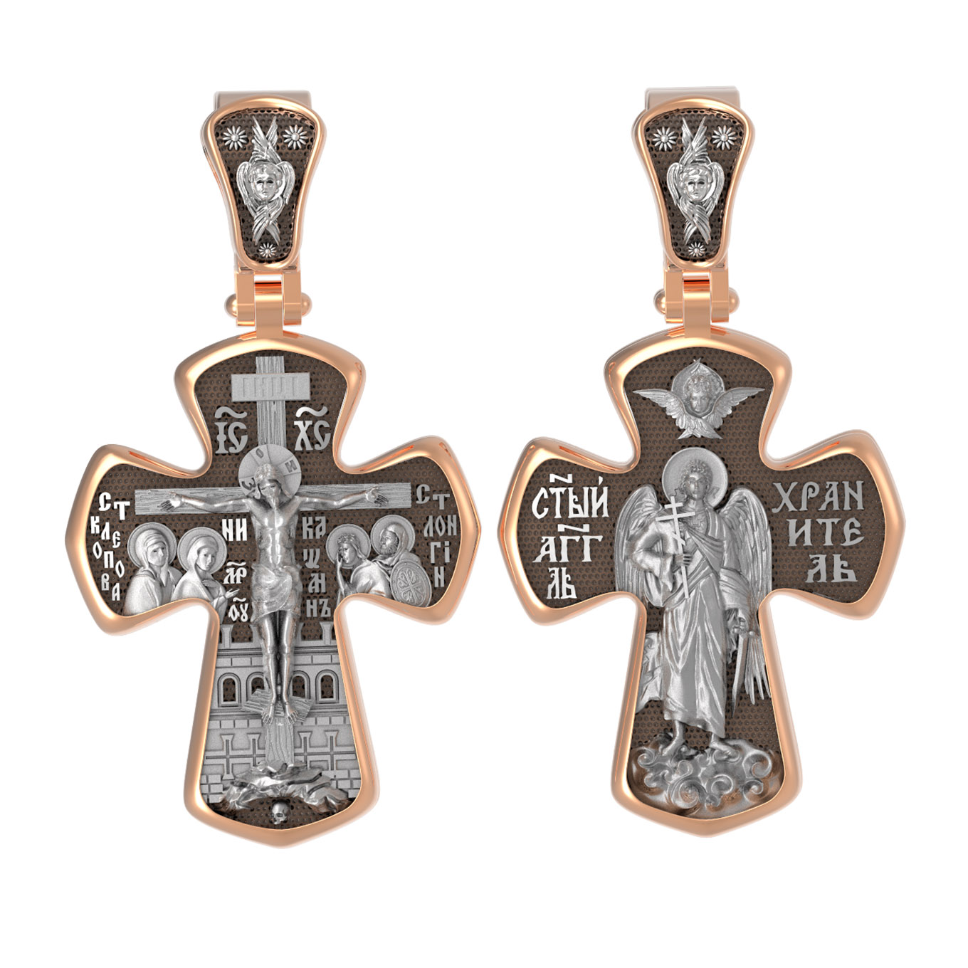 На лицевой стороне креста изображено Распятие Господа и Спасителя нашего Иисуса Христа, отдавшего Себя на смерть, для искупления грехов мира. Господь сказал: кто хочет идти за Мною, отвергнись себя, и возьми крест свой, и следуй за Мною. (Мк. 8: 34). Крест является символом жертвенной любви всеблагого Бога к падшим людям, всепобеждающим духовным оружием христиан, основанием и средоточием церковной жизни. На верхней перекладине помещена надпись «IС» « ХС», что означает Иисус Христос. Ниже — слово «НИКА», что означает «победитель». Слева от Распятия изображена Пресвятая Богородица, справа — апостол и евангелист Иоанн Богослов, один из ближайших учеников Иисуса Христа. За Распятием высится Иерусалимская стена, в знак того, что Господь был распят вне стен города. Возвышение, на котором стоит Крест, символизирует гору Голгофу, на которой произошло Распятие. Под подножием Креста изображена покоящаяся голова (череп) Адама. На кулонном кольце помещен крест.