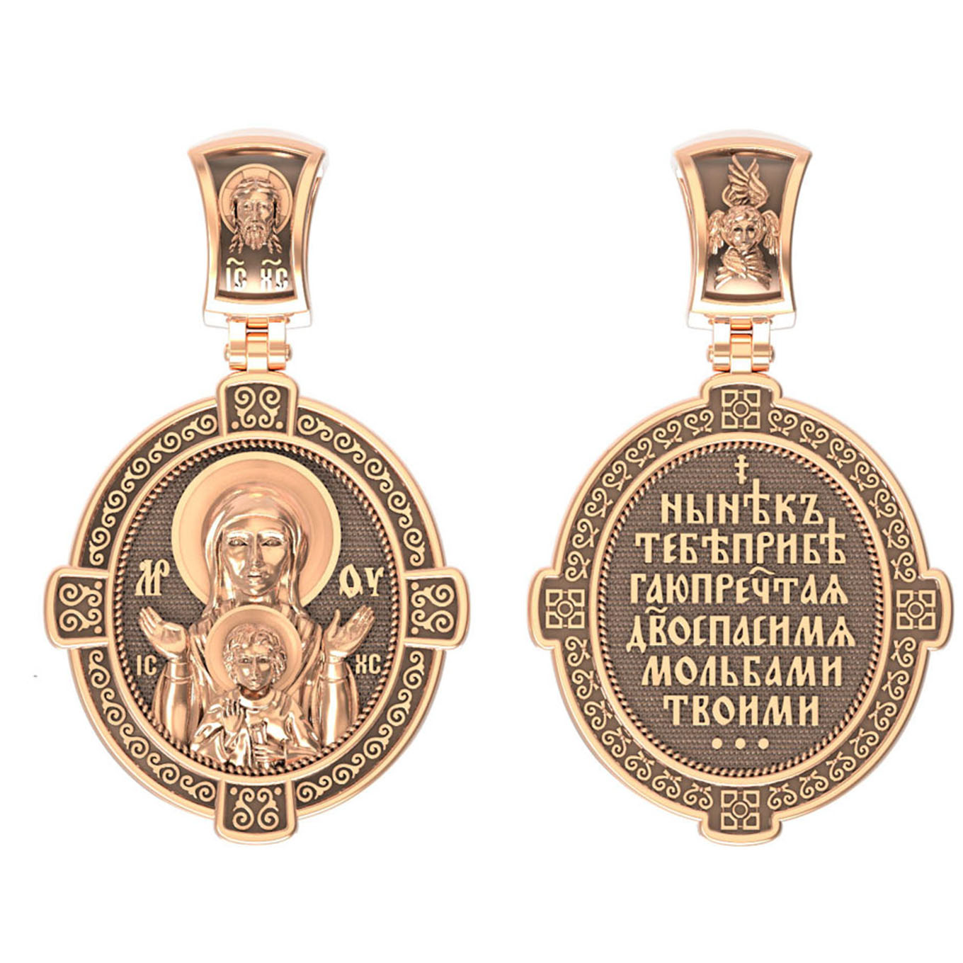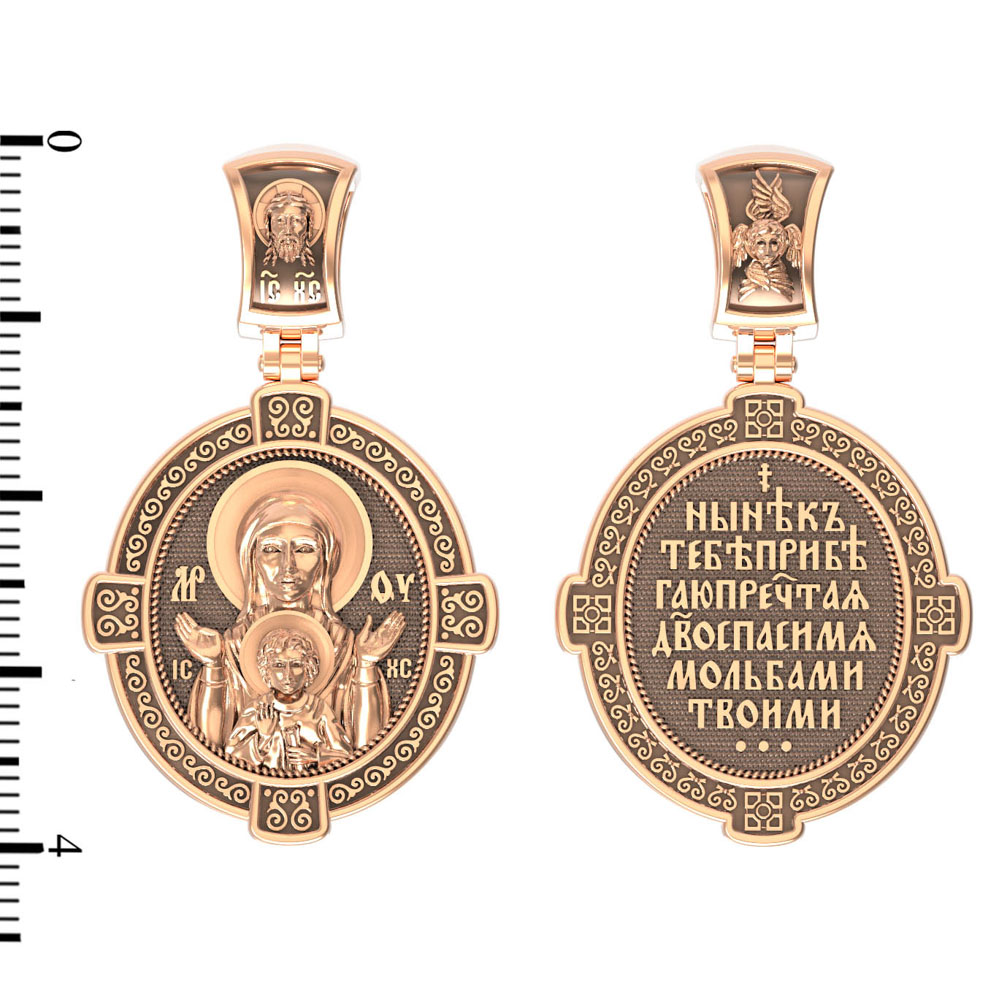 В центр образка помещен образ Божией Матери «Знамение», прославившийся многими чудесами в Новгороде в XII веке. Икона эта чтится как одна из самых великих святынь Русской земли. Молитвенно воздетые руки Богородицы означают заступничество за людей пред Богом. Рядом с Ней — благословляющий Божественный Младенец — Спас-Эммануил.